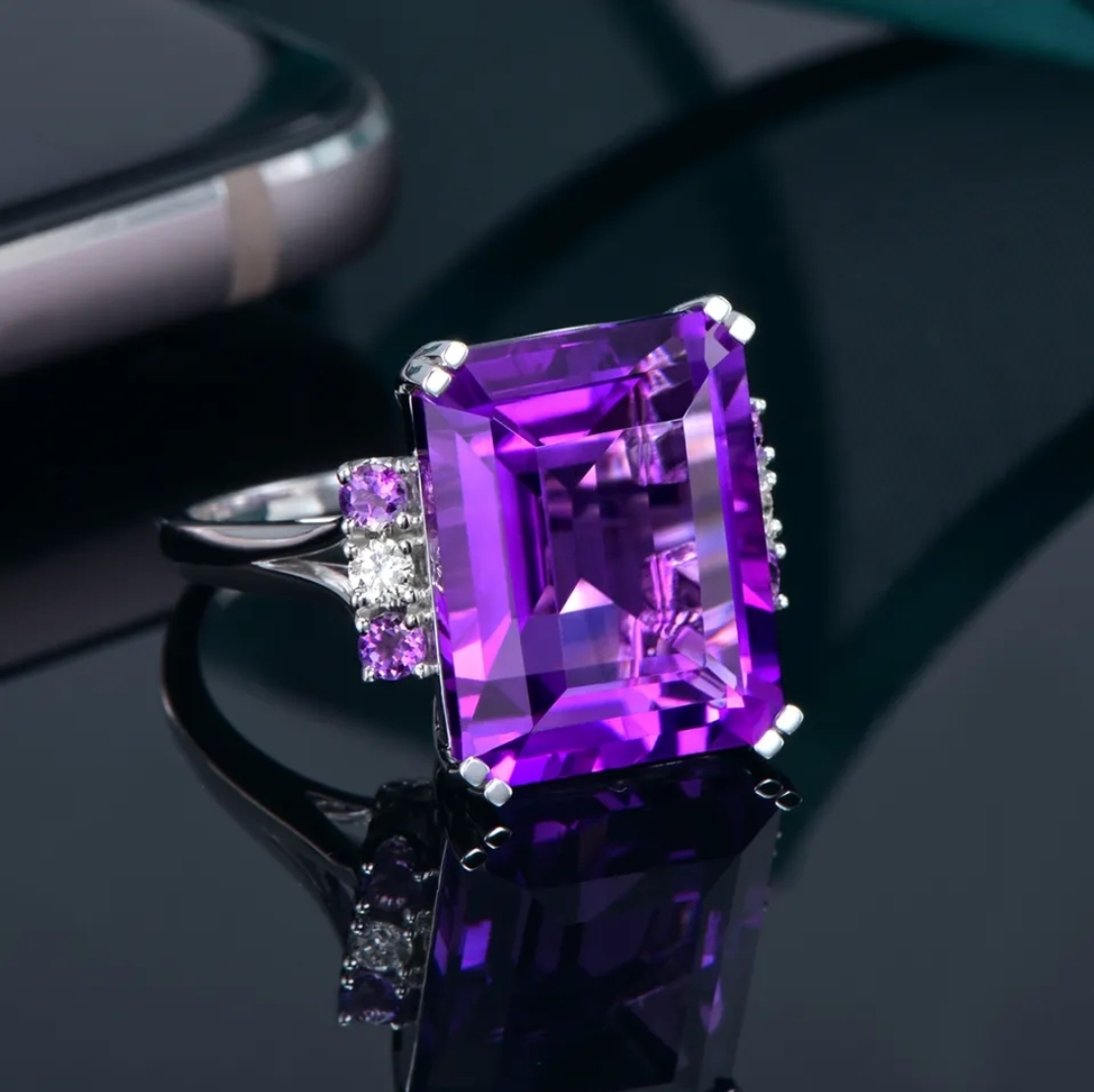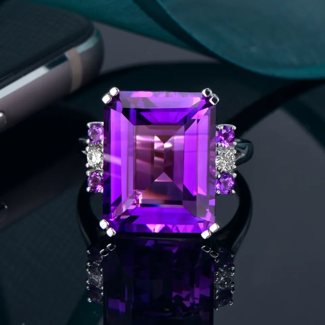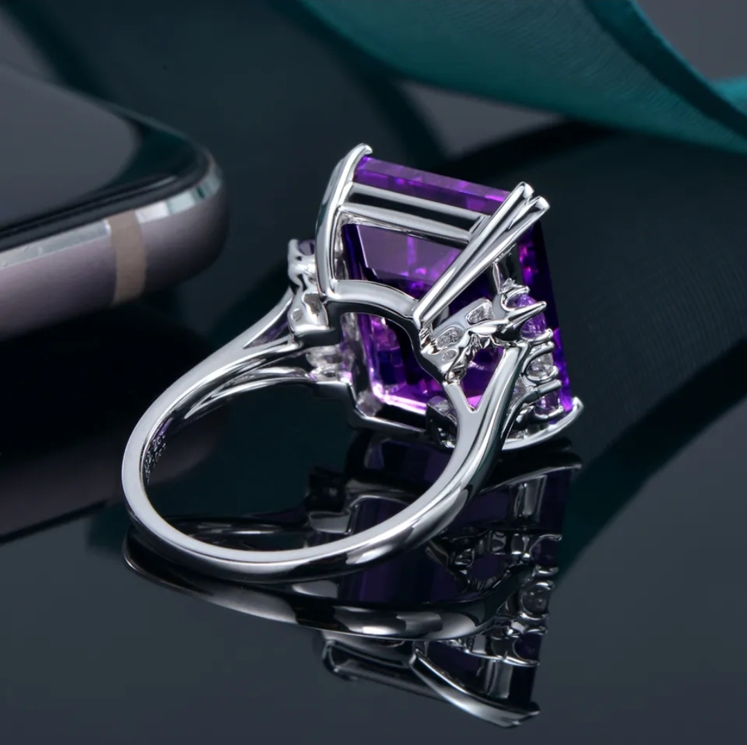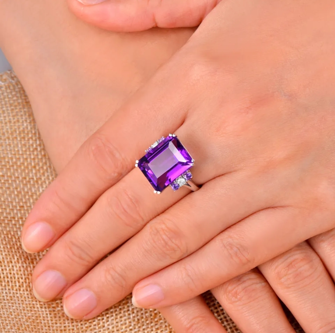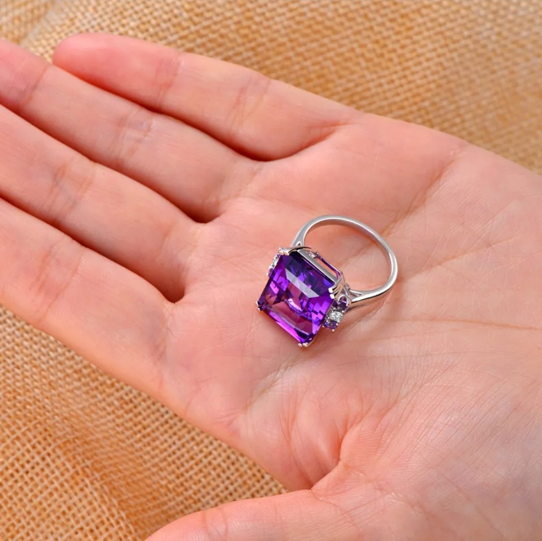 For the discerning woman who knows her worth, this Amethyst Emerald Cut & Diamond Ring in 14k White Gold (11.83ctw) is as captivating as you are. The star of our mesmerizing collection - a large gem, boasting 11.50 carat in weight, is cut into a simple but brilliant emerald, inviting both attention and envy. Perched elegantly in a frame of resplendent 14k White Gold, the rich purple color of the Amethyst is magnificent, epitomizing luxury. Adorned with sparkling Diamonds, it adds delight to the beauty that is already there.