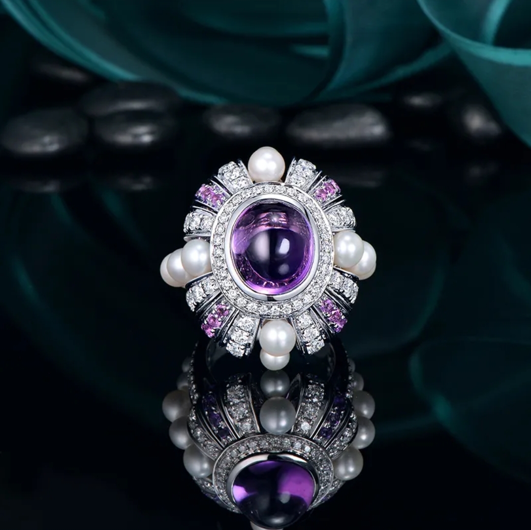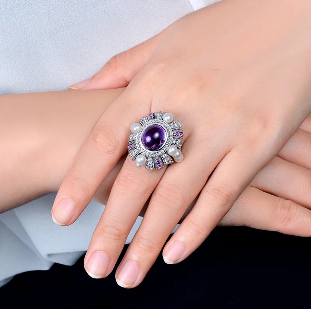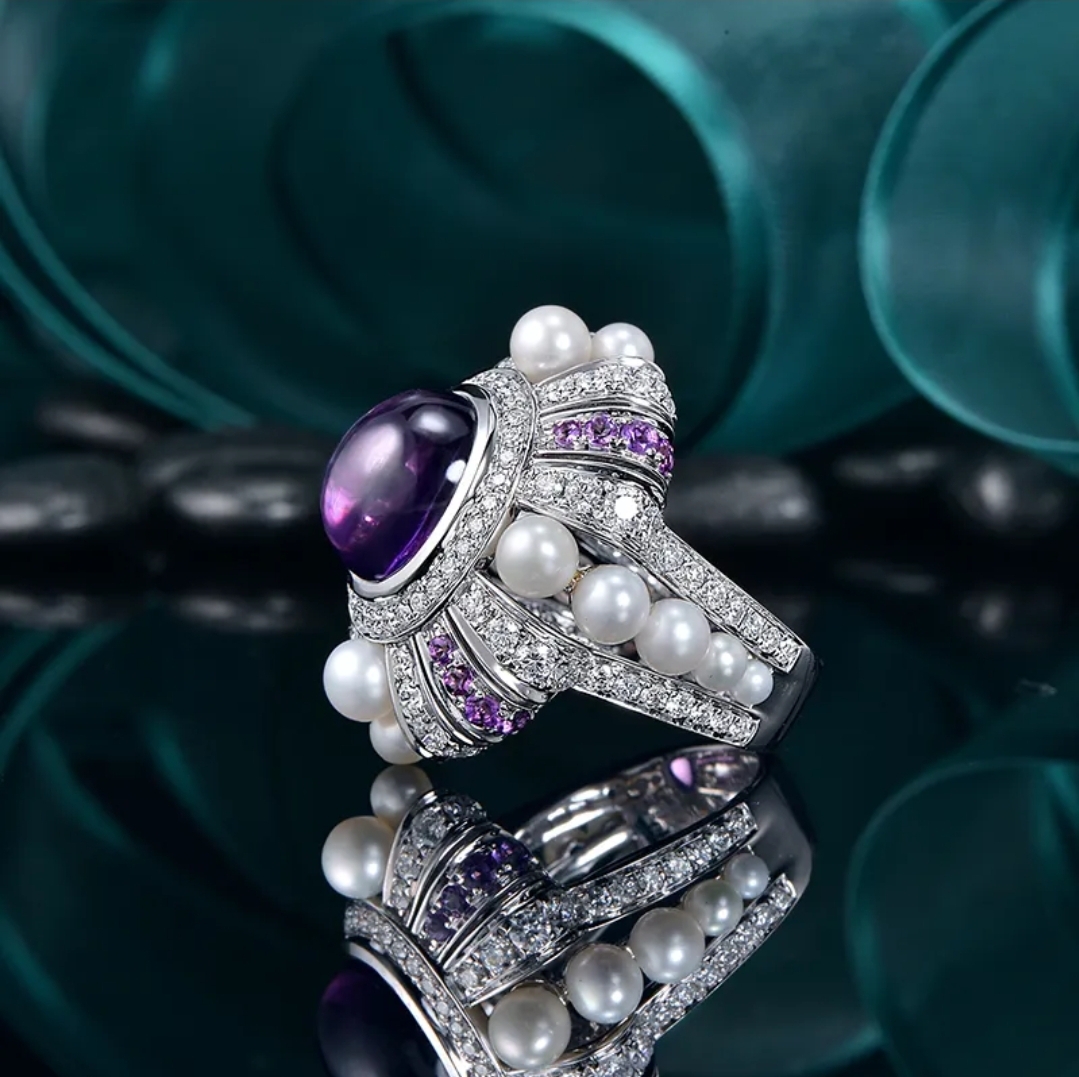Immerse yourself in the mesmerizing allure of our Amethyst, Freshwater Pearl & Diamond Cocktail Ring, a true masterpiece designed to make a grand statement. Expertly set in 14k White Gold, this ring showcases a majestic Amethyst cabochon centerpiece that commands attention with its impressive size and rich purple hue. Embracing an air of opulence, iridescent Freshwater Pearls beautifully encircle the Amethyst, while dazzling Diamonds set upon the band exude a captivating sparkle. Effortlessly merging boldness with timeless elegance, this ring epitomizes Hollywood glamour, allowing you to exude confidence and grace at any formal affair.