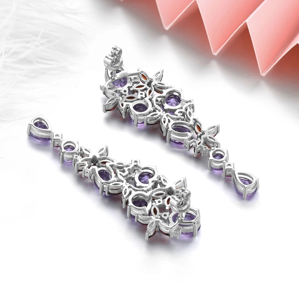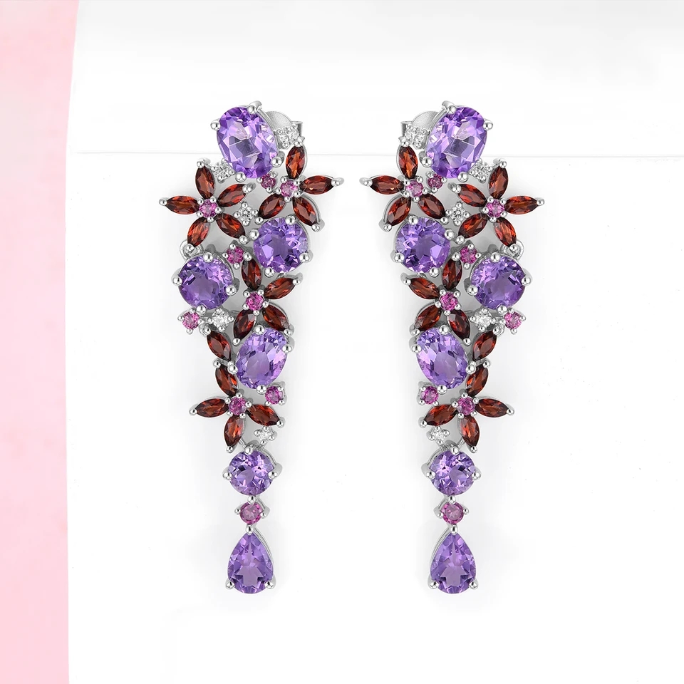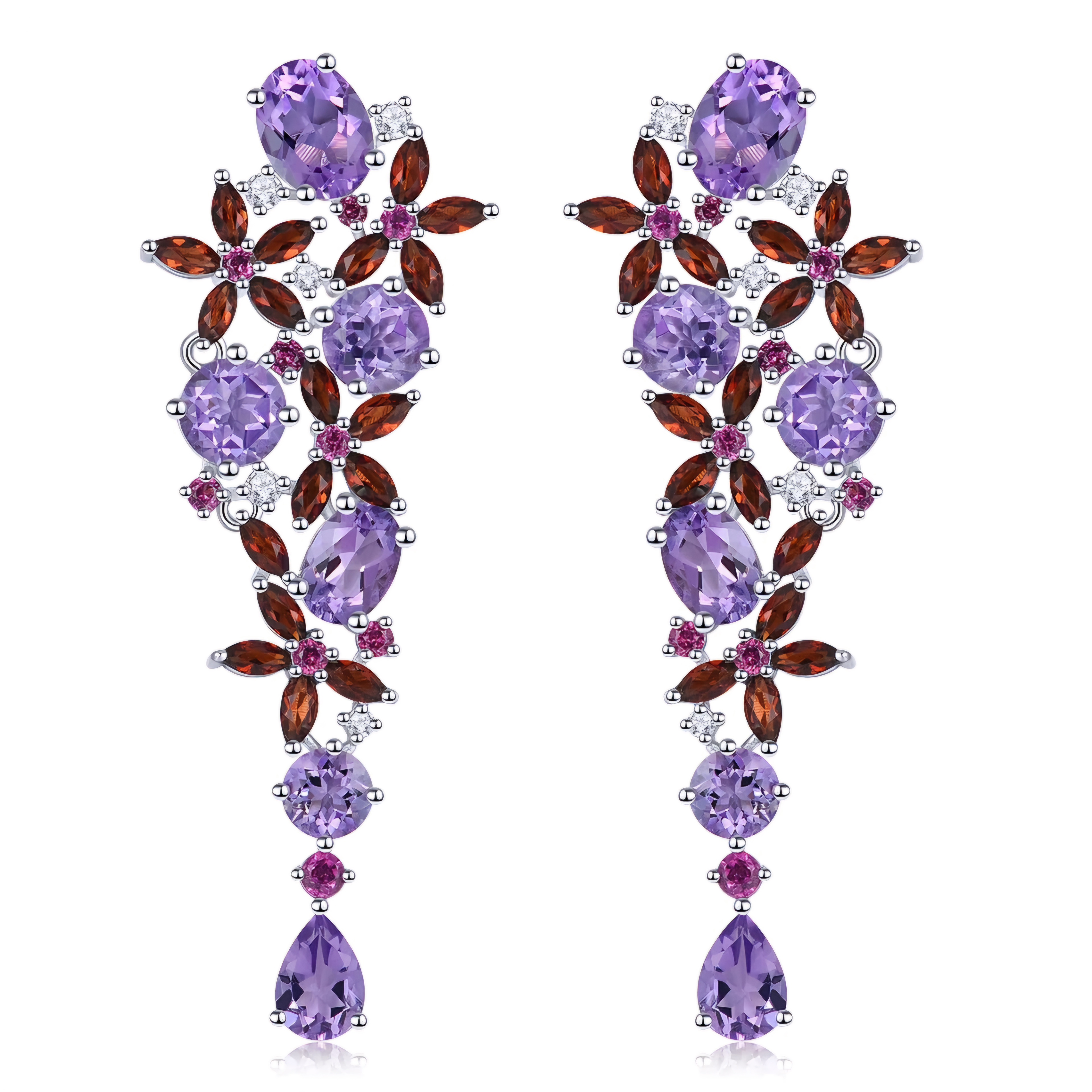 Make a statement with these luxurious Amethyst, Garnet & Multi Gemstone Earrings In Rhodium over Sterling Silver 14.00ctw. Crafted with precision and attention to detail, these earrings exude elegance and sophistication. Whether you're dressing up for a special occasion or simply want to elevate your everyday look, these earrings are sure to impress.