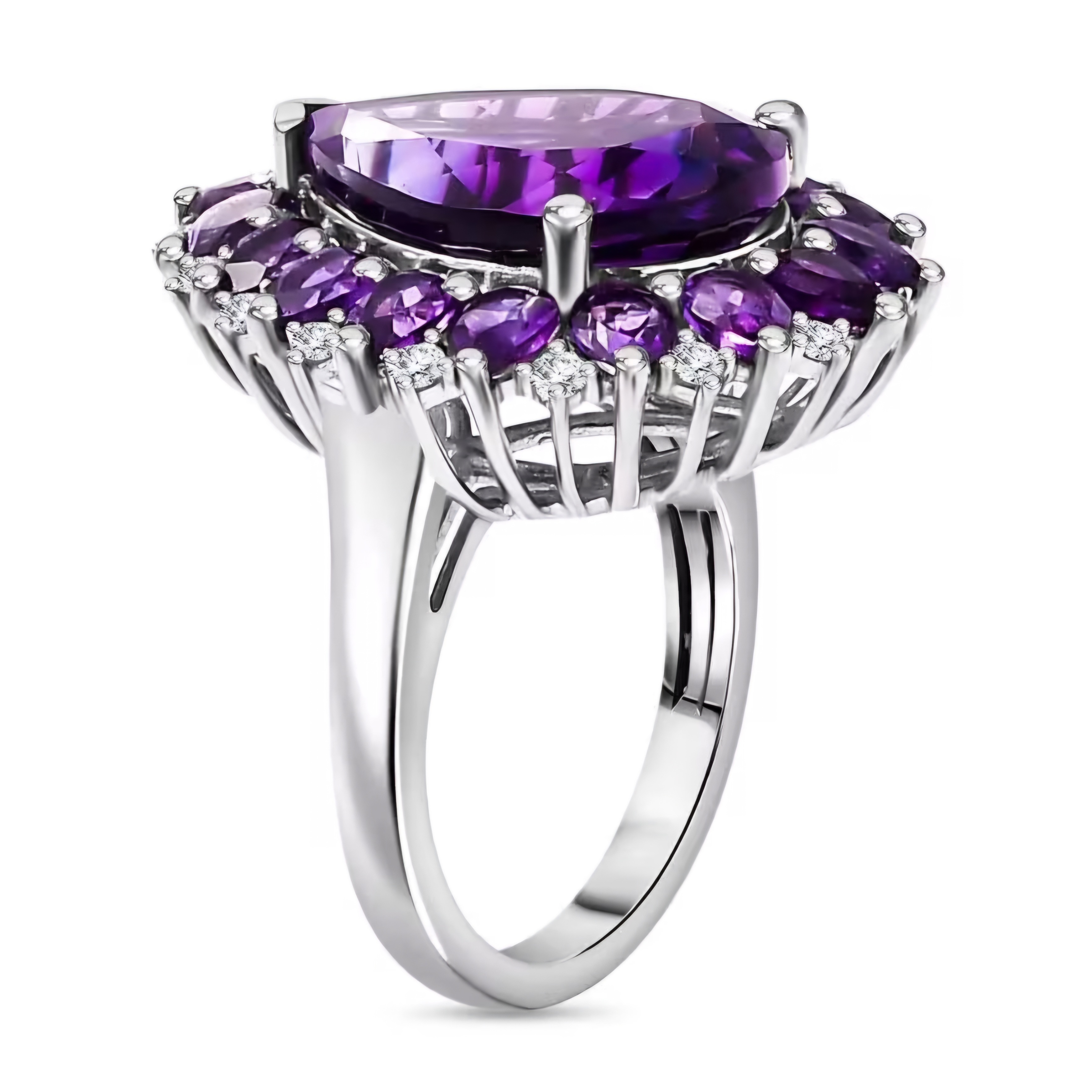 Elevate your jewelry collection with our Amethyst & Moissanite Pear Halo Ring. Boasting a breathtaking 16x12mm pear cut natural and untreated Moroccan Amethyst center stone, this ring is truly a showstopper. The halo of pear cut Amethysts and sparkling round Moissanites enhances the beauty of the large Amethyst stone, creating a piece that exudes luxury and sophistication. The bold, rich purple color of the stones adds a touch of glamour to your look.