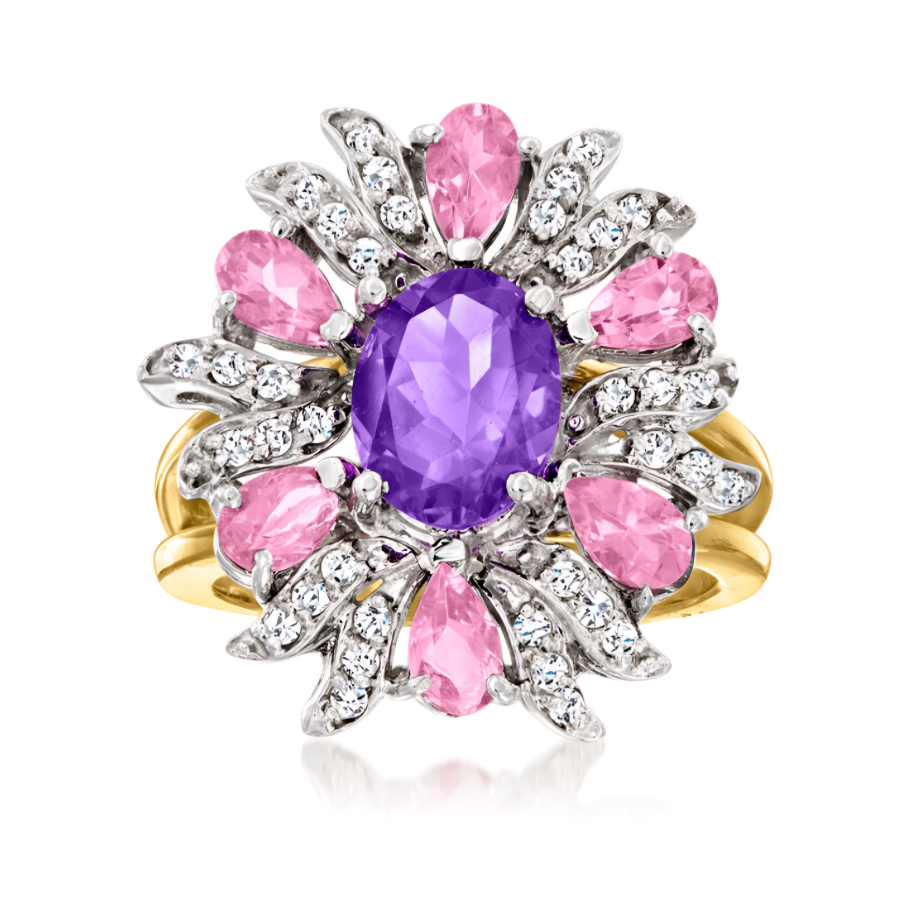 Elevate your jewelry collection with this stunning Amethyst, Pink Tourmaline & Diamond Ring In 14K Yellow Gold 3.21ctw. Crafted with precision and care, the vibrant gemstones are set in a luxurious yellow gold band, creating a piece that exudes elegance and sophistication. Whether worn as a statement piece or as a special occasion accessory, this ring is sure to draw compliments and admiration.