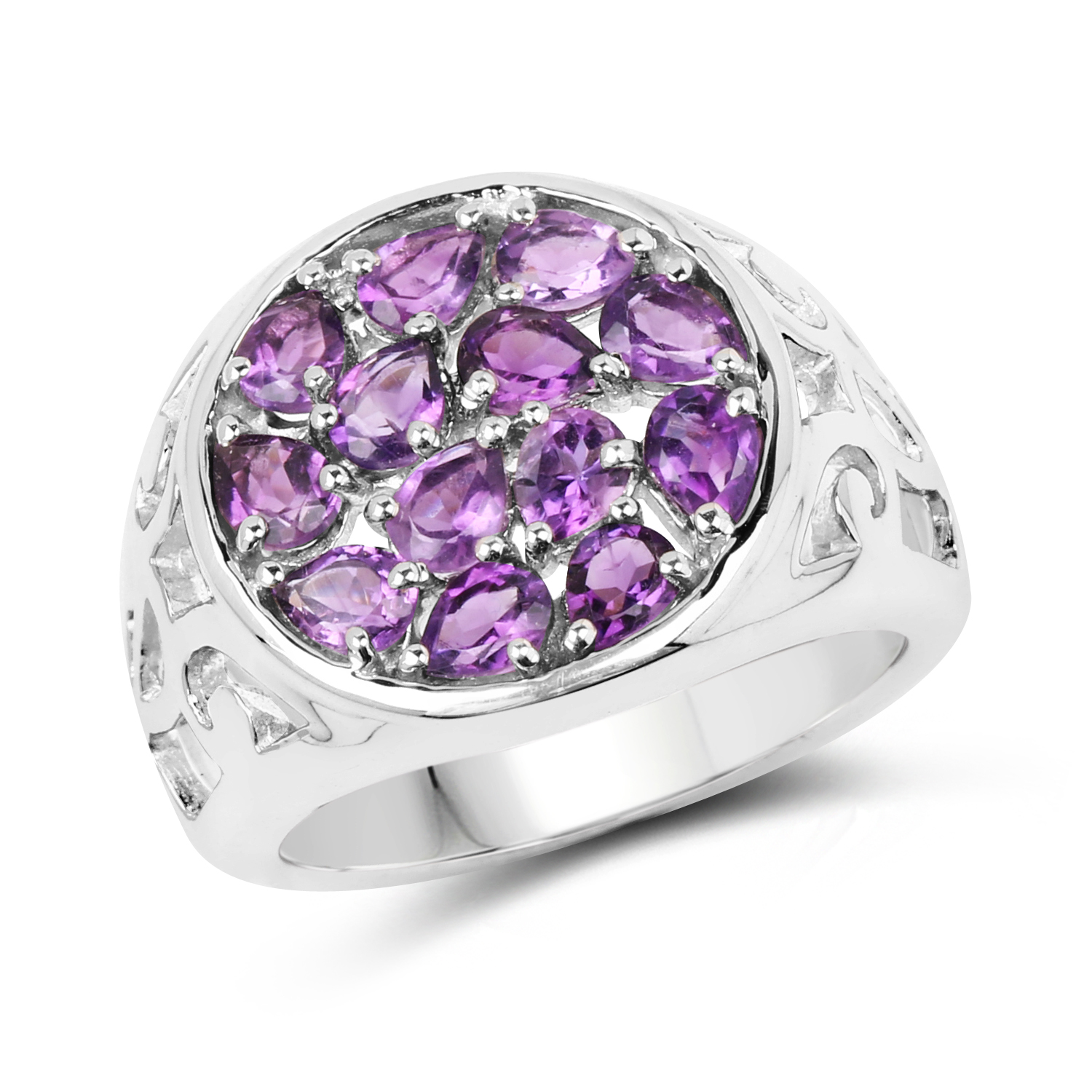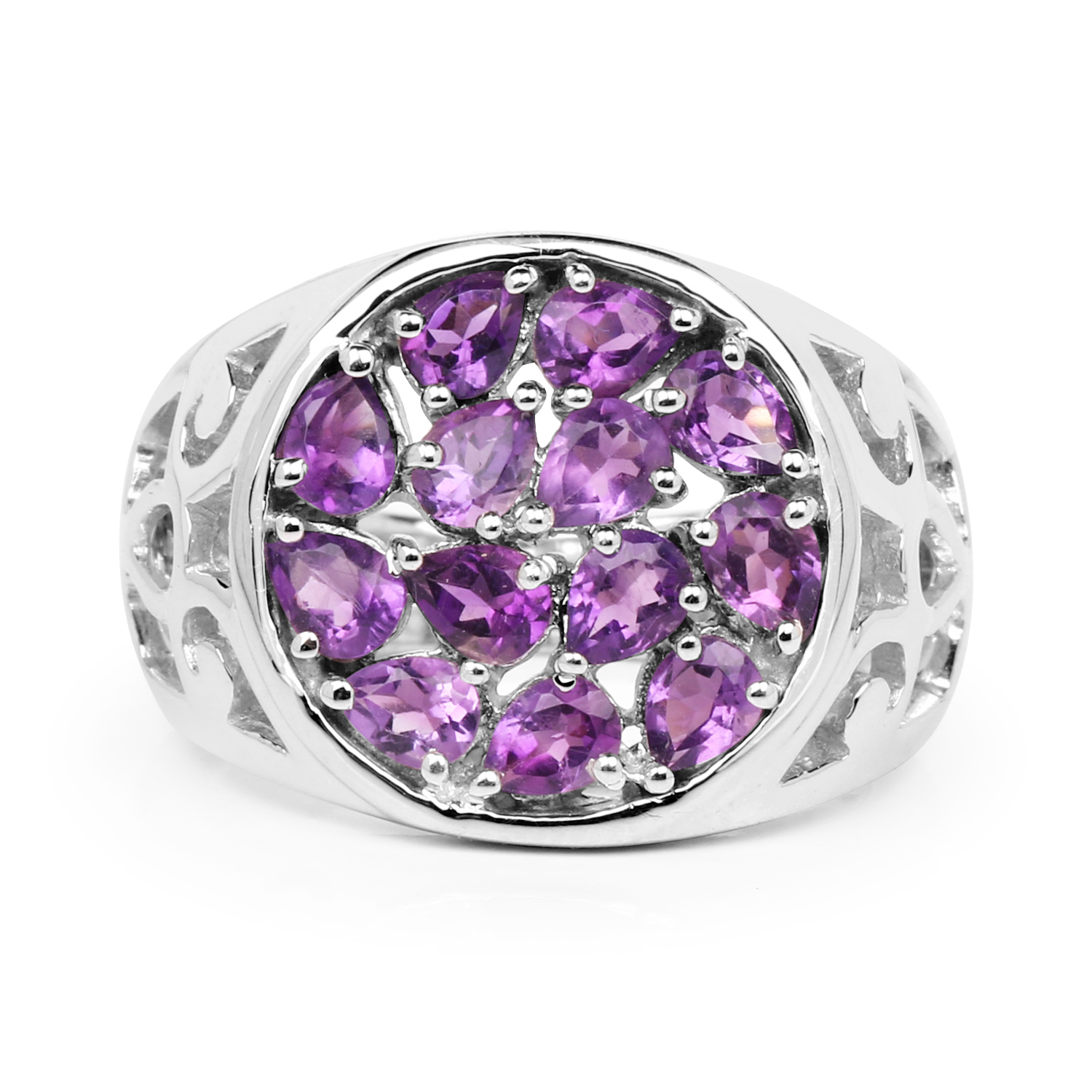 This ring features a cluster of pear-cut amethyst, each measuring approximately 4x3mm, arranged in a rounded layout that creates a complete, continuous surface of color. The varying angles of the pear shapes allow light to reflect from multiple directions, giving the ring a soft, lively shimmer.
