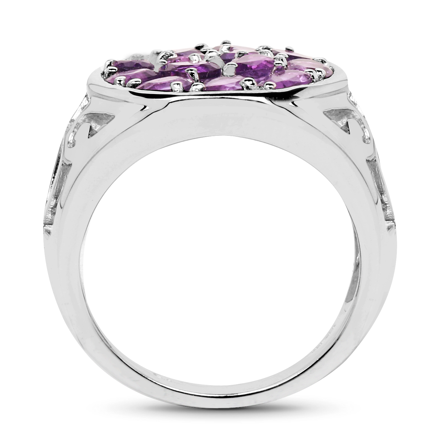 The deep purple tones remain consistent across the design, while the clustered setting adds dimension without making the ring feel bulky. Openwork detailing along the sides of the band provides additional visual interest and keeps the overall look balanced.