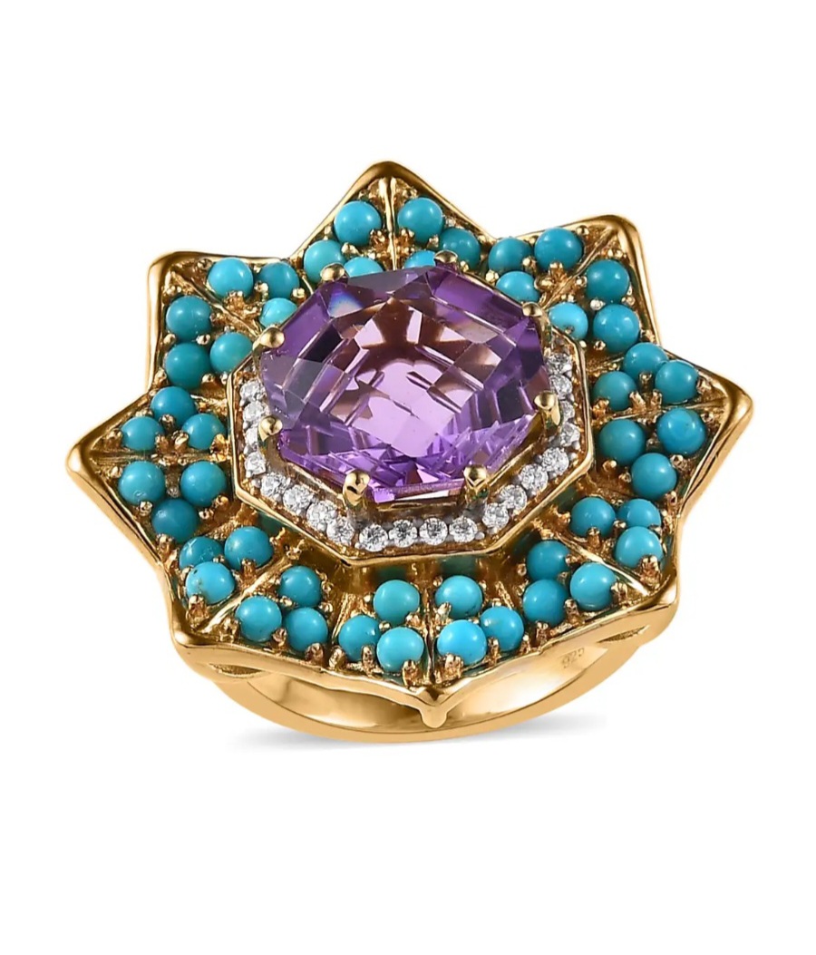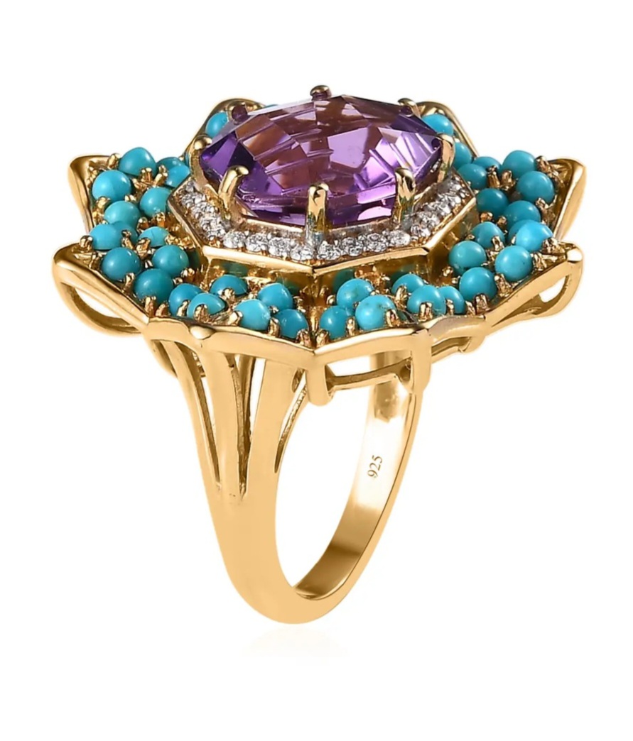 Indulge in opulence and elegance with our exquisite Amethyst, Sleeping Beauty Turquoise & Moissanite Cluster Ring. This magnificent piece is crafted in luxurious 18K Yellow Gold over Sterling Silver, exuding an aura of sophistication. Adorned with a stunning combination of vibrant amethyst, captivating Sleeping Beauty turquoise, and dazzling moissanite, this ring showcases a total carat weight of 8.75ctw. Immerse yourself in the allure of this tasteful blend of gemstones, meticulously designed to captivate and enchant. Elevate your style and make a timeless statement with this resplendent cluster ring.