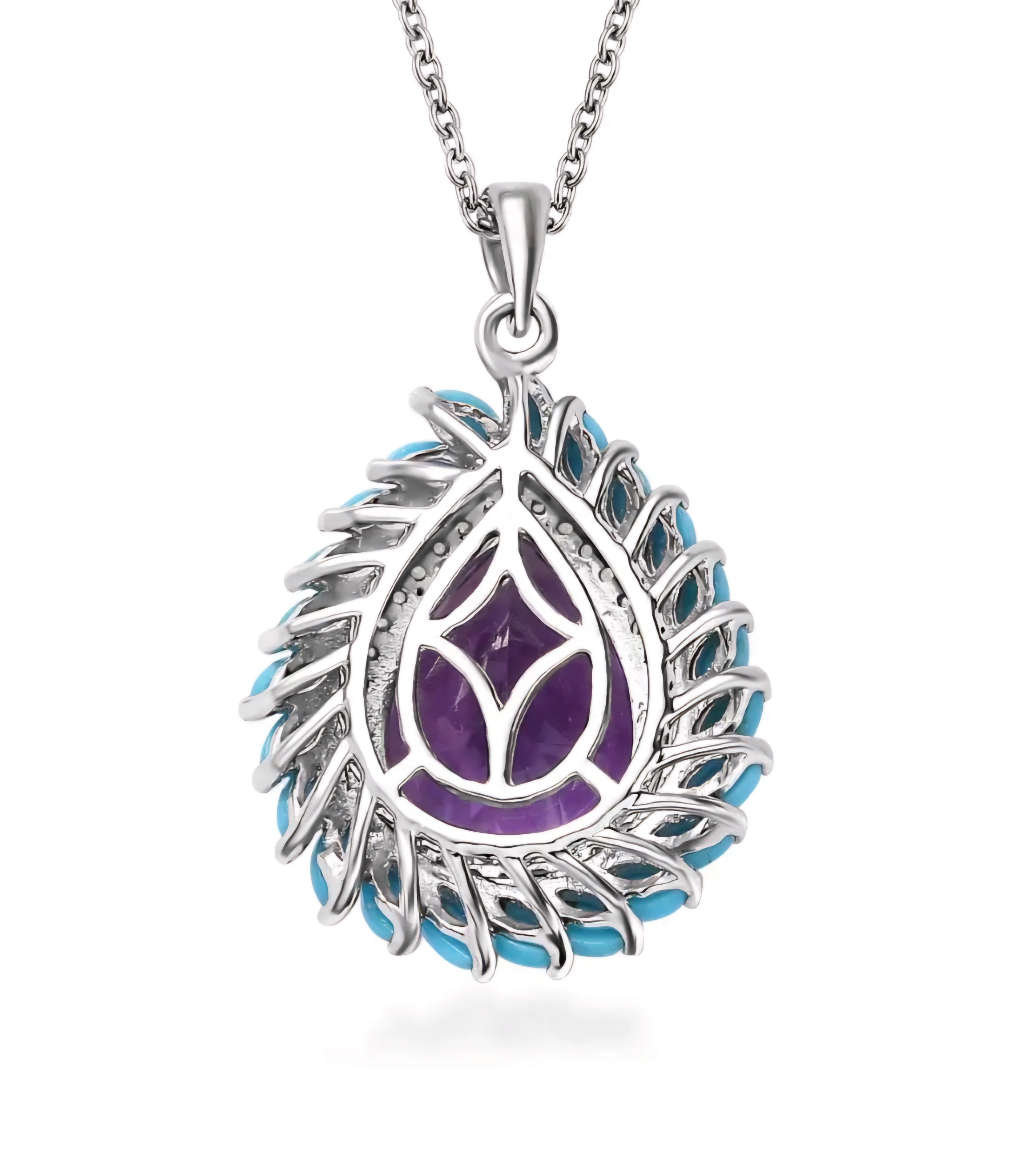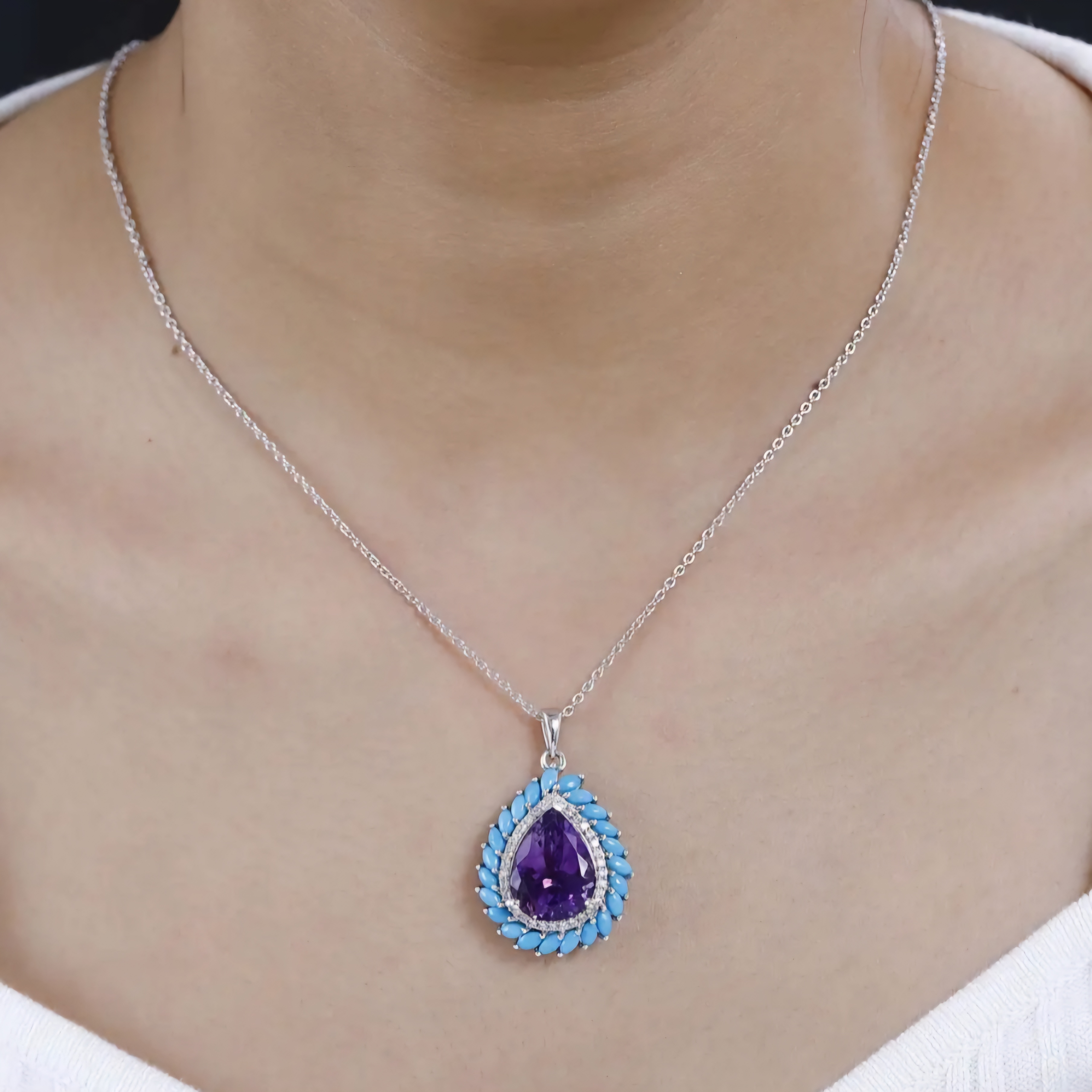 Delight in the opulence of our magnificent Amethyst, Sleeping Beauty Turquoise & Moissanite Halo Cluster Pendant Necklace in Rhodium over Sterling Silver 10.40ctw. Meticulously handcrafted with attention to detail, this pendant necklace exudes an aura of luxury and grandeur. The alluring combination of amethyst and Sleeping Beauty turquoise, beautifully accentuated by a brilliant moissanite halo, creates a captivating display of colors and sparkle. Encased in rhodium over sterling silver, the necklace radiates a captivating brilliance that will leave you breathless. Embrace the essence of timeless elegance with this exquisite necklace, a true symbol of impeccable craftsmanship and refined taste.