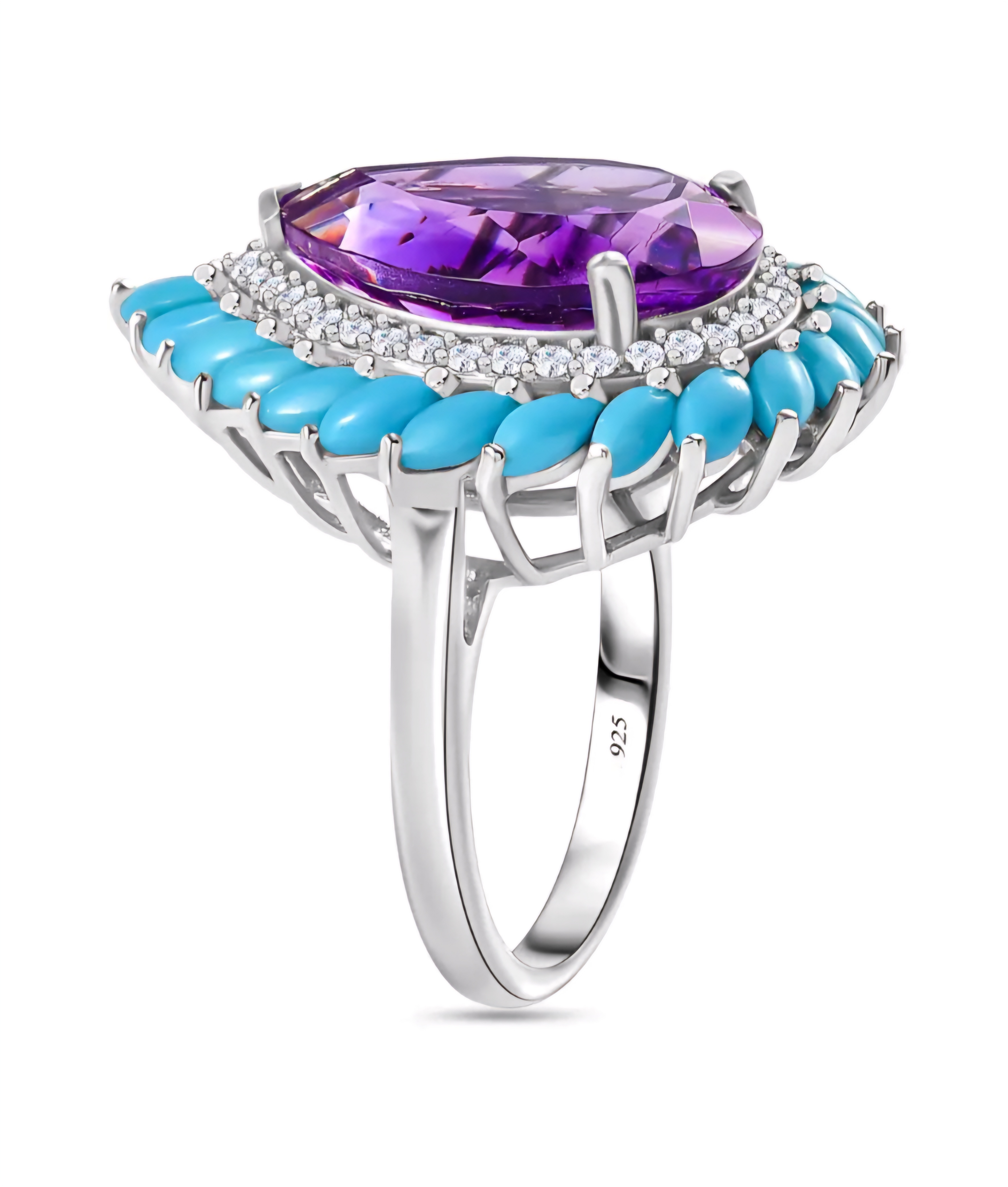 Elevate your jewelry collection with our exquisite Amethyst, Sleeping Beauty Turquoise & Moissanite Halo Cluster Ring. Crafted with precision and attention to detail, this luxurious piece showcases a stunning combination of deep purple amethyst, vibrant turquoise, and shimmering moissanite. The rhodium over sterling silver setting adds a touch of elegance, while the 10.40ctw gemstone weight ensures a captivating sparkle. Perfect for special occasions or adding a touch of sophistication to your everyday look, this ring is a true statement of refined luxury.