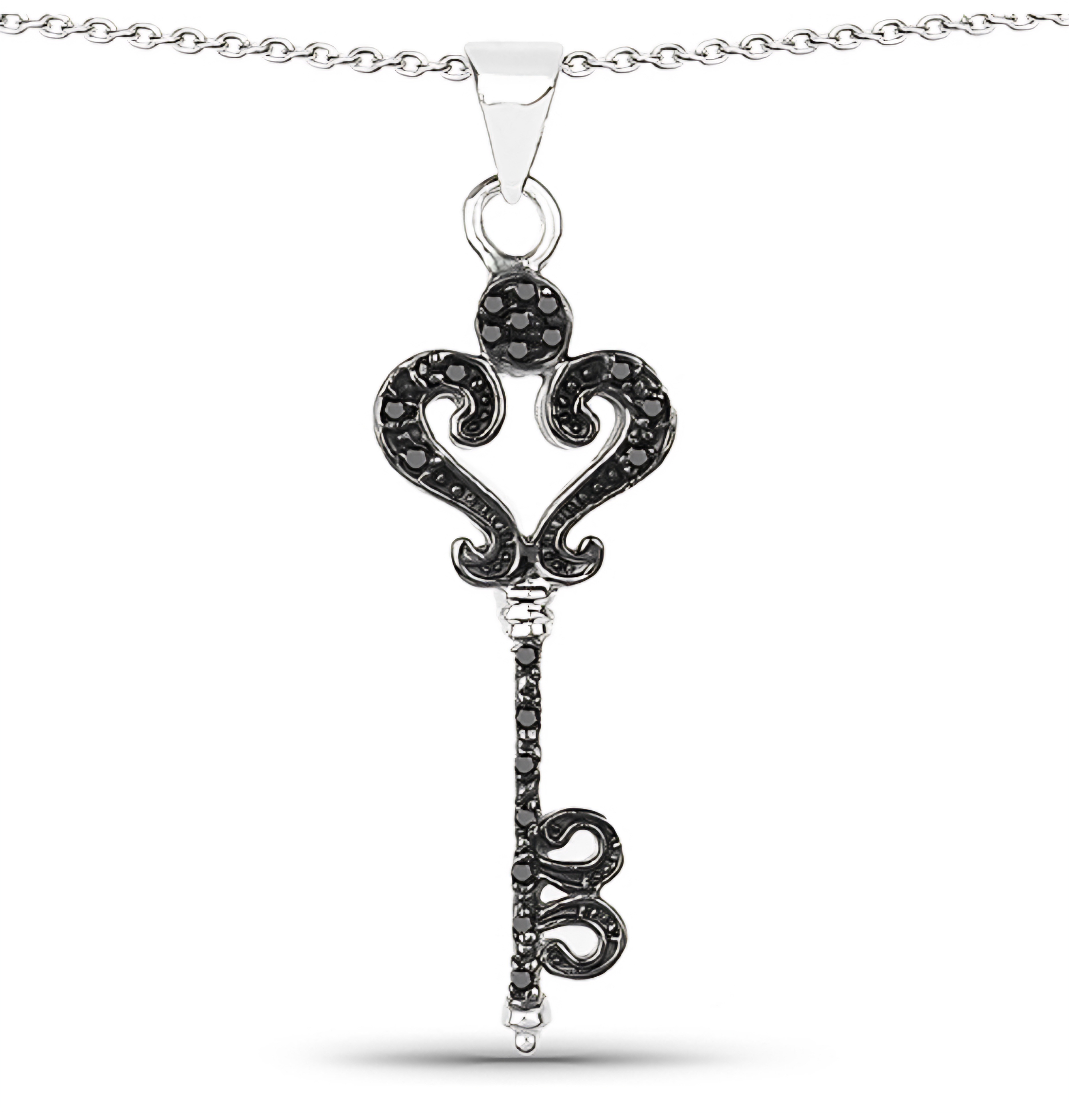 Crafted in solid 925 sterling silver, the pendant is finished in a combination of black and white rhodium plating. The interplay between darkened recesses and bright highlights sharpens the lines of the key, emphasizing its silhouette and architectural detail. The result is a piece that feels intentional and modern, with a subtle nod to vintage forms.
