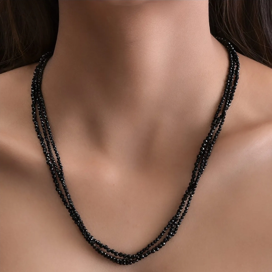Add a touch of elegance and glamour to your outfits with our stunning Black Spinel Rondelle Beaded Triple Strand 20" Necklace. The three layers of shimmering black spinel beads create a mesmerizing flutter of sparkle around your neckline, instantly elevating your style. Crafted with care in Rhodium over Sterling Silver, this necklace is not only beautiful but also durable. Embrace the trendy layered look and let this piece be the statement accessory that turns heads wherever you go!