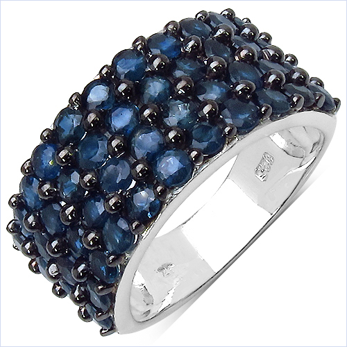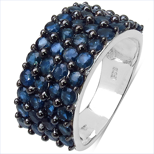 This ring features multiple round blue sapphires set in a dense cluster, creating a wide, domed top with strong visual presence. The stones display a rich, darker blue tone, enhanced by the black rhodium accents that deepen the overall appearance.