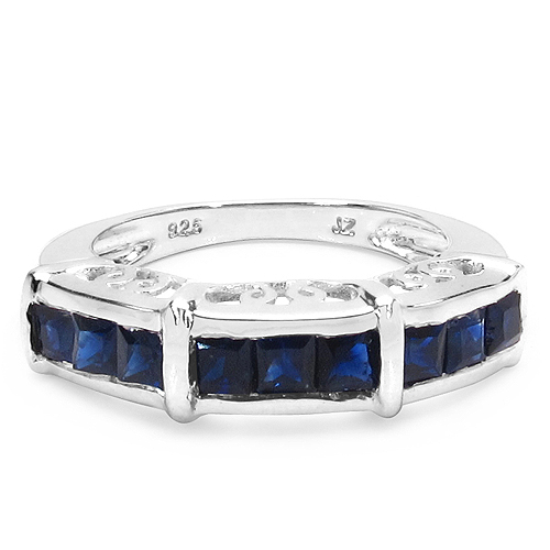 This band features square-cut blue sapphires, each approximately 2.5mm, set in a continuous row across the top. The uniform shape gives the ring a sharp, modern look, while the deep blue tones provide strong visual depth.