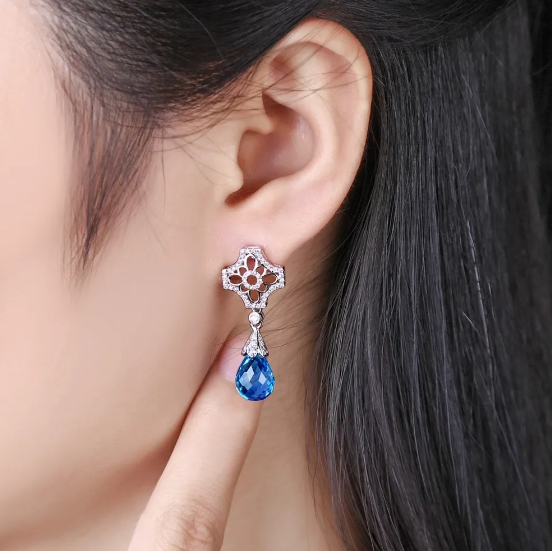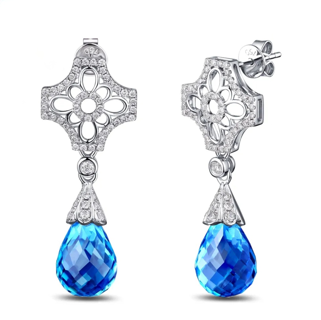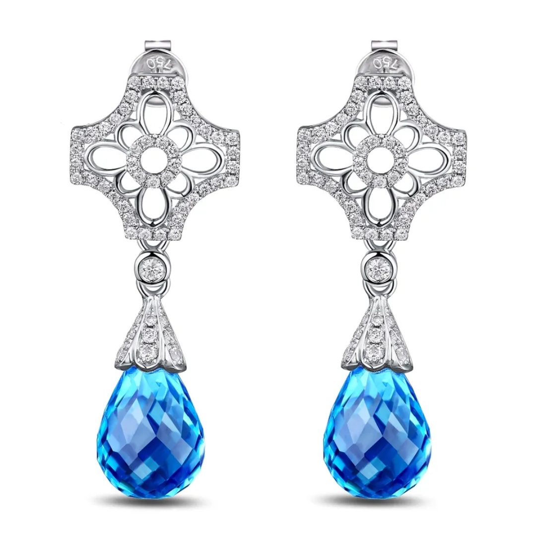 Indulge your refined tastes with our exquisite Briolette Swiss Blue Topaz & Diamond Drop Earrings. Vintage inspired but with a modern touch, these radiant earrings boast 12.43ctw in a harmonious blend of captivating Swiss Blue Topaz and scintillating Diamonds. Artfully crafted in enduring 18K White Gold, these earrings offer an infallible touch of elegance and glamor. Dance in the light and captivate every gaze, as you would on a red carpet event, with these stunningly beautiful earrings. Experience luxury at its finest.