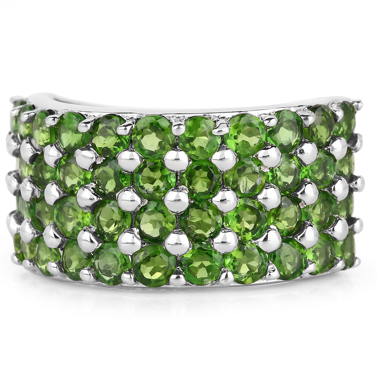 This ring features multiple round chrome diopside gemstones set in a wide cluster band, creating a dense, uninterrupted field of green across the top. The stones display a rich, vibrant green tone with strong saturation, giving the ring a bright and energetic presence.