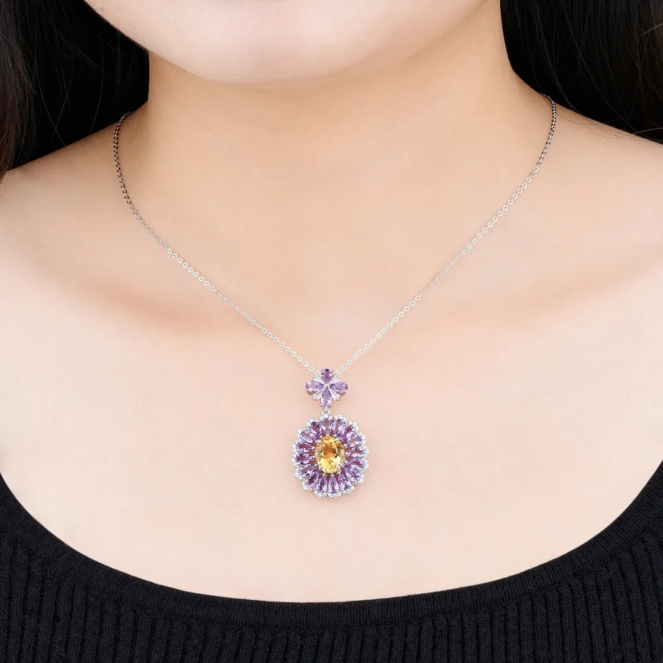 Radiating with a glow of pure elegance, this breathtaking 6.5ctw Citrine, Amethyst, and White Zircon Necklace speaks volumes of your impeccable taste and luxury style. With each delicately set stone comes an infusion of regal charm, beautifully augmenting the overall visage. The necklace is generously plated with Rhodium over Sterling Silver, boasting a sparkle that can captivate an entire room. Mirroring the fanciful beauty of a highly esteemed Large Cluster design, this necklace is bound to make a fabulous statement. Red carpet ready, this beautiful piece gives you the flair of magnificence and an air of royalty. It exhibits not just an awe-inspiring accessory, but a masterpiece that reflects the wearer's sophisticated grace.