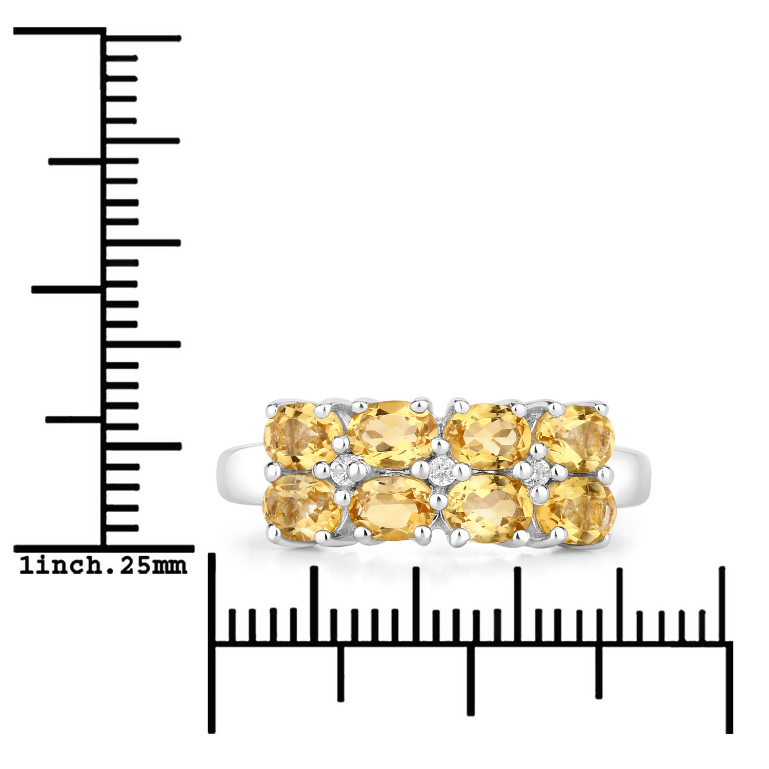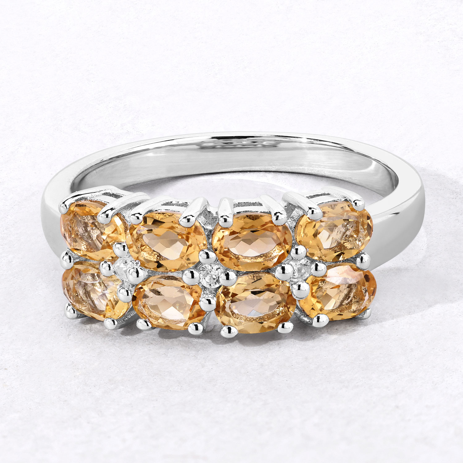 Crafted in rhodium-plated sterling silver, the setting provides a bright, polished finish that complements both the citrine and the white accents while maintaining durability and shine.