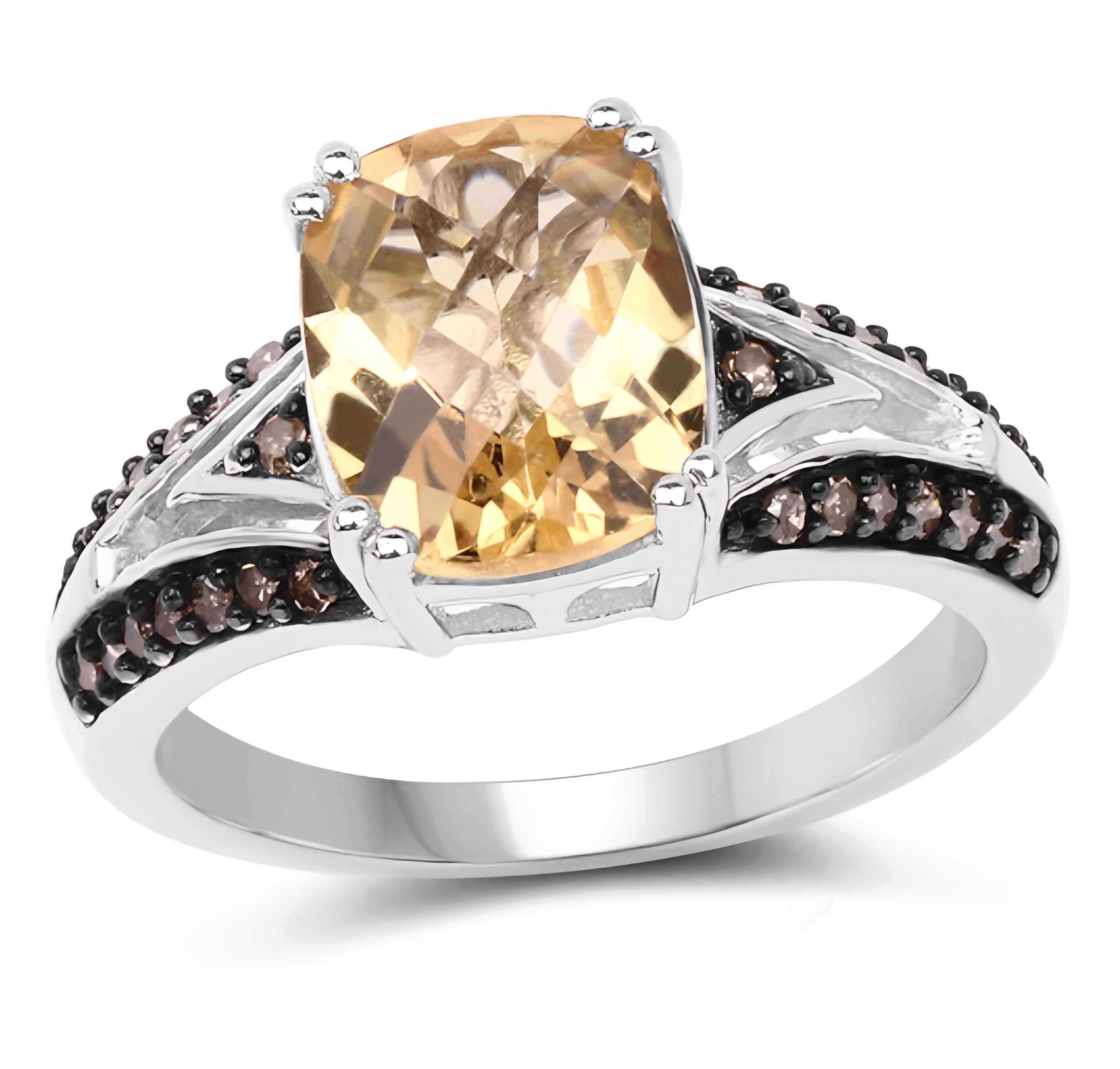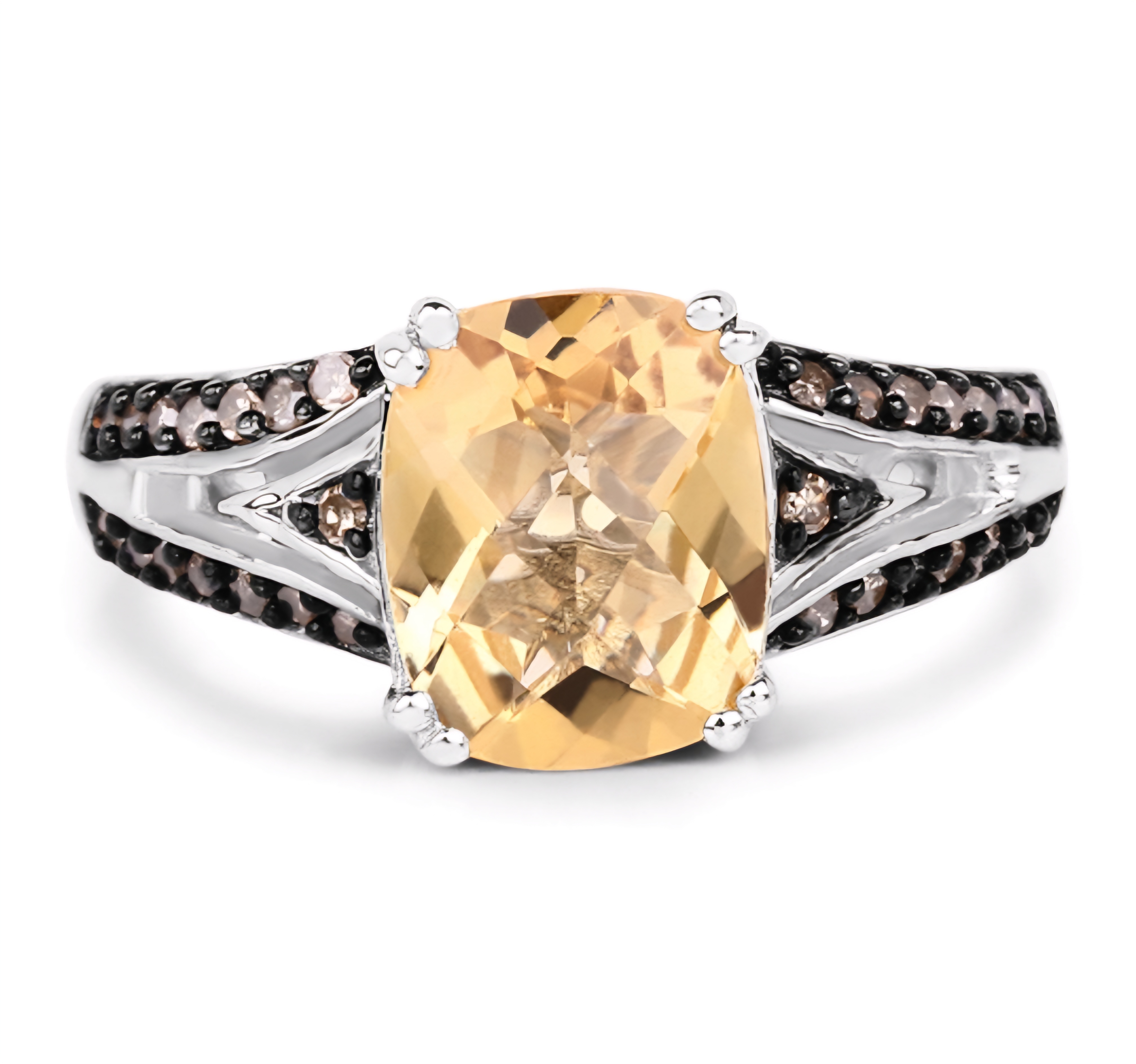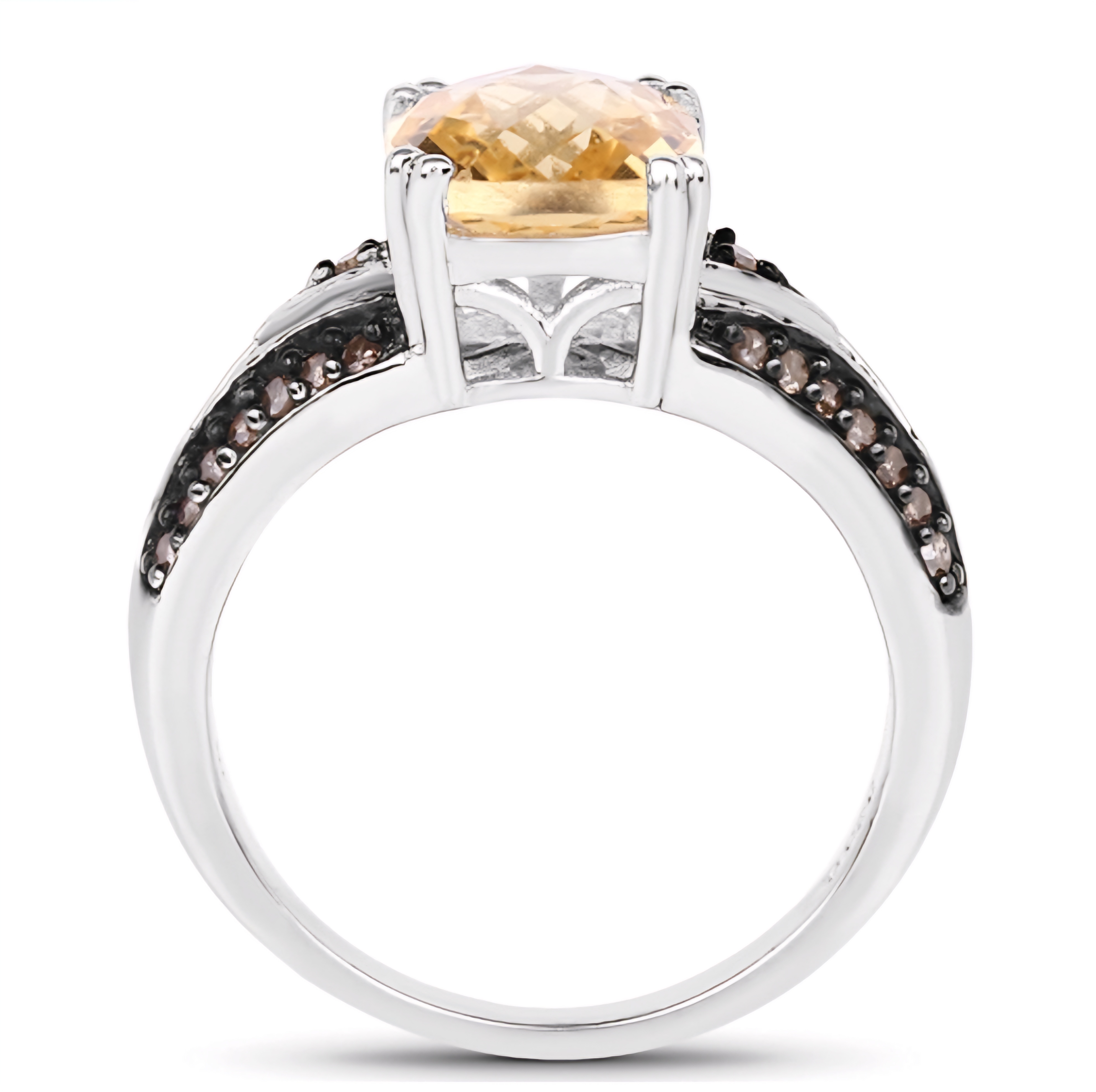 Make a Striking Statement with the Citrine & Champagne Diamond Ring: Enhance your collection with the Citrine & Champagne Diamond Ring, a striking blend of modern design and timeless beauty. The two-tone black and white rhodium finish over sterling silver creates an enchanting contrast, emphasizing the exquisite Rectangle Cushion cut Citrine center. This statement piece exudes luxury with its glistening champagne diamond accents, creating an air of sophistication and elegance. Elevate your style and make a lasting impression with this stunning ring that effortlessly captures a modern and luxurious feel.
