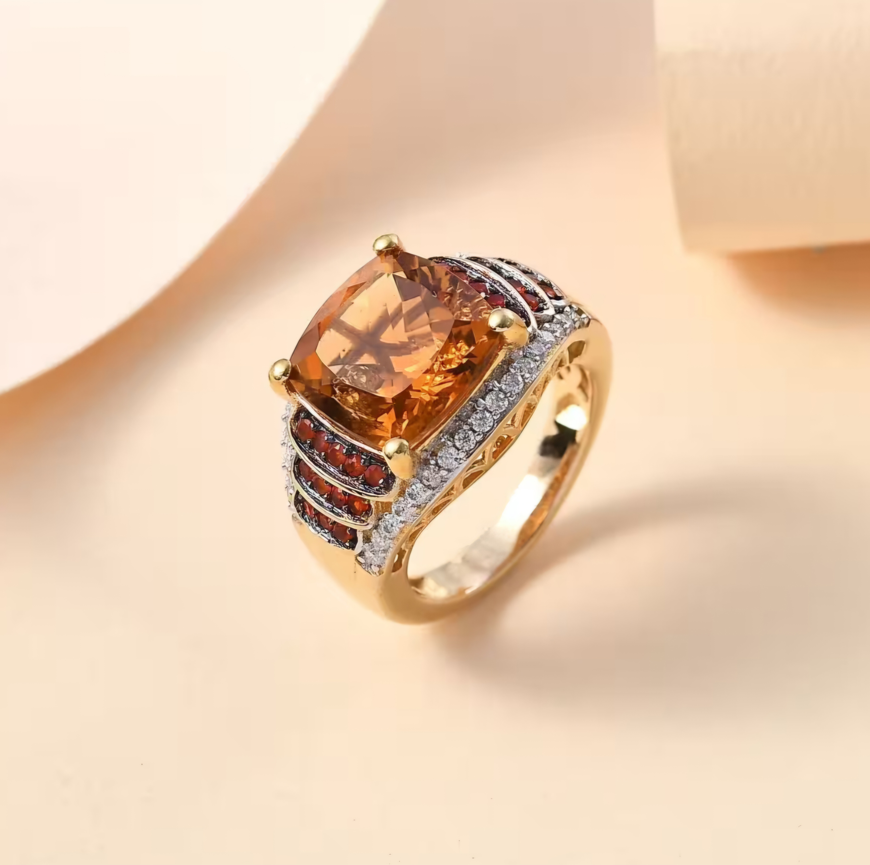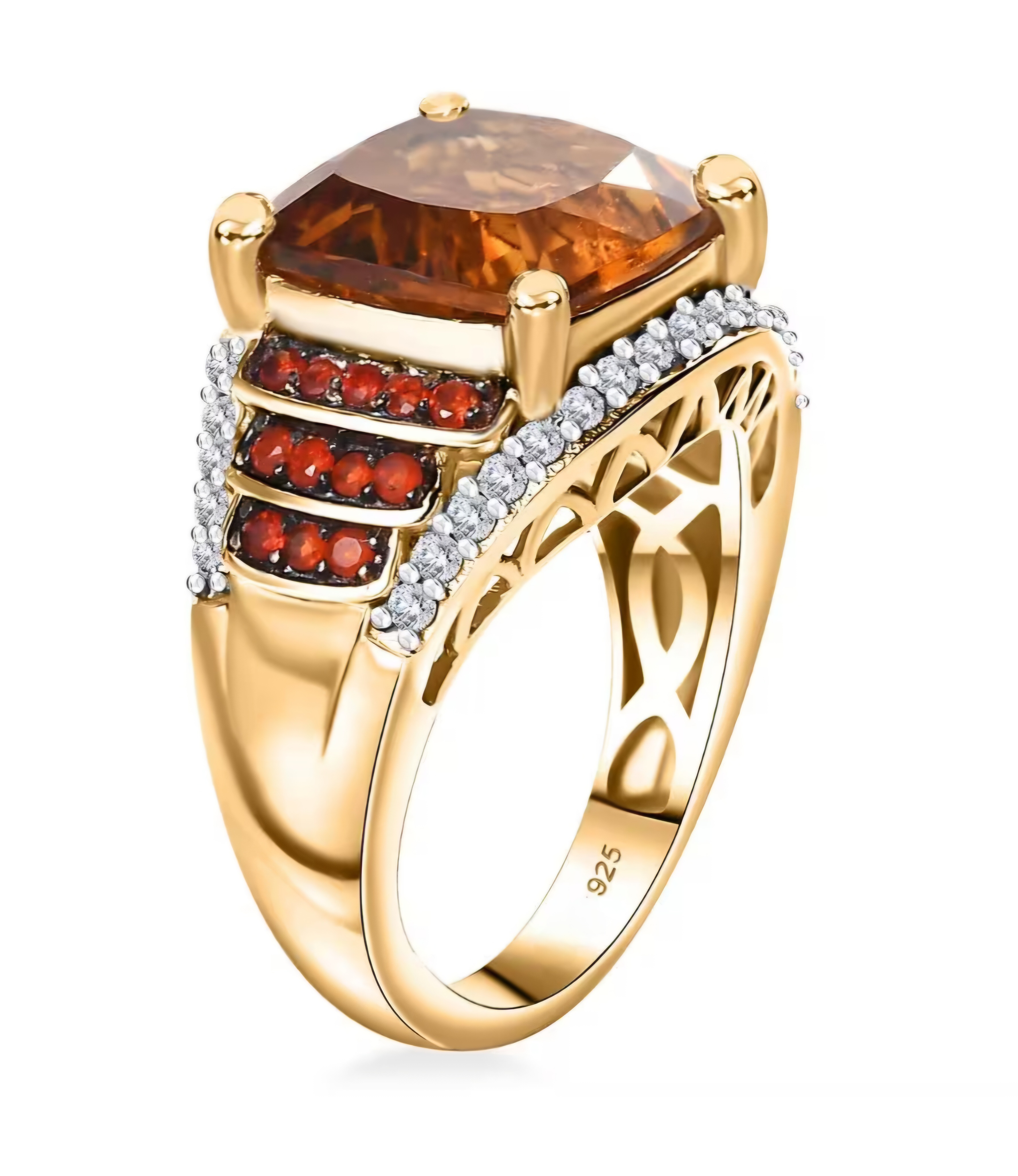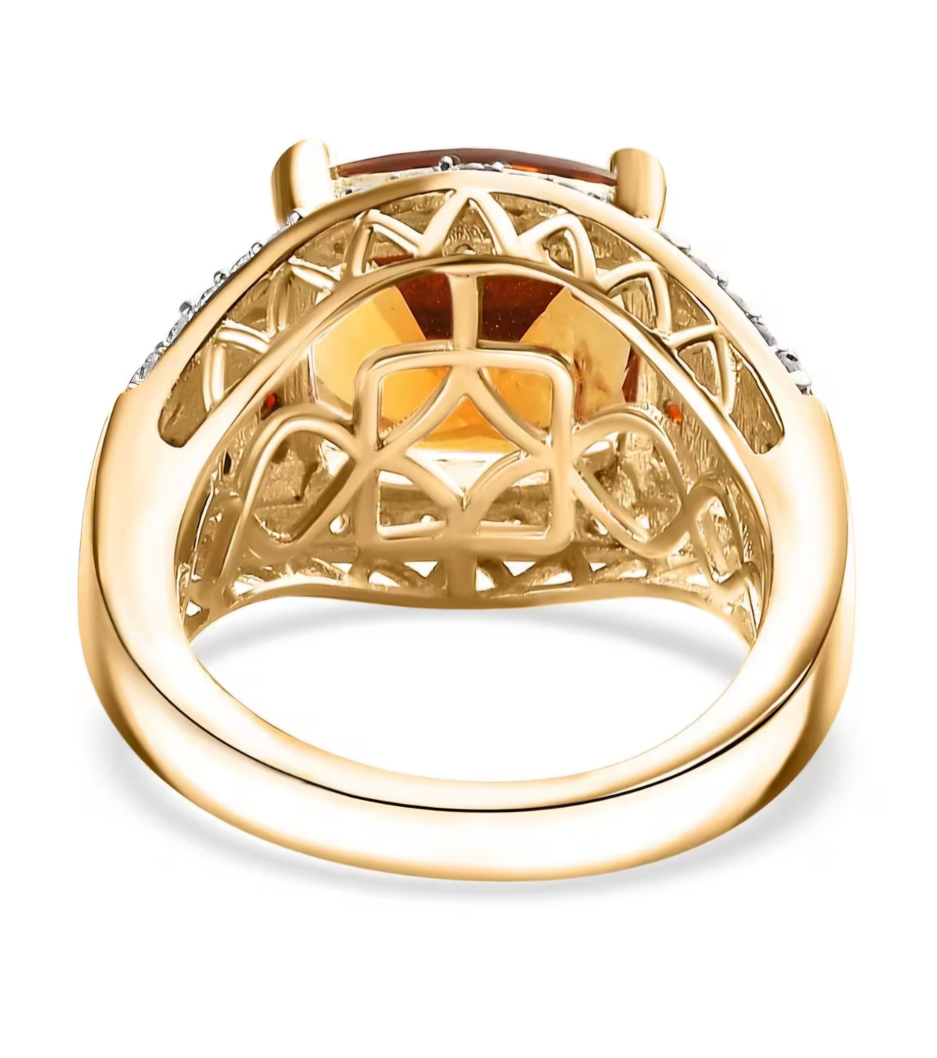 Enhance your jewelry collection with this exquisite Citrine, Fire Opal & Moissanite Ring In 18K Yellow Gold over Sterling Silver 5.75ctw. This stunning ring features a vibrant citrine stone, fiery fire opal, and brilliant moissanite accents set in a luxurious 18K yellow gold over sterling silver band. Make a statement with this elegant and unique piece that is sure to turn heads.