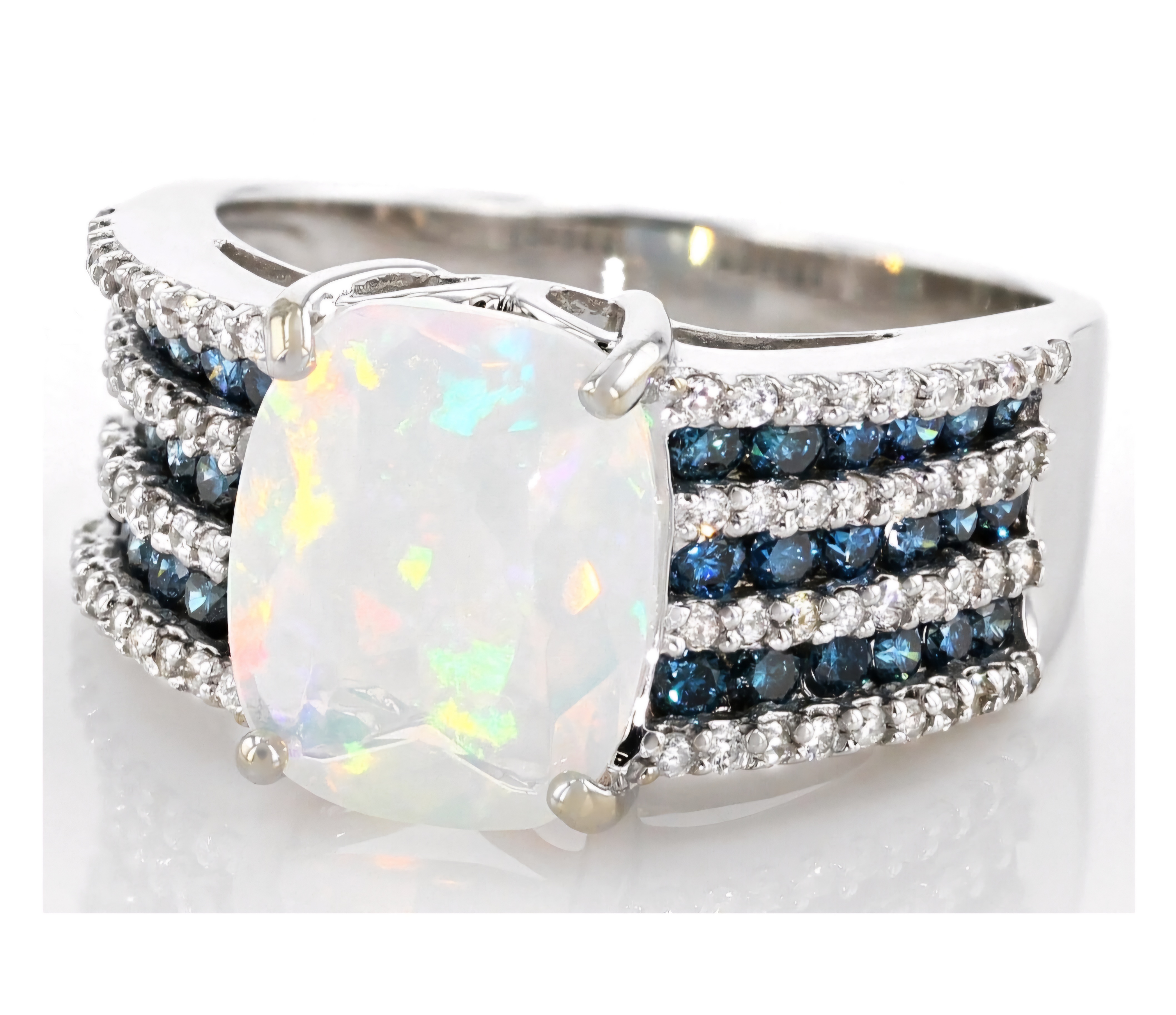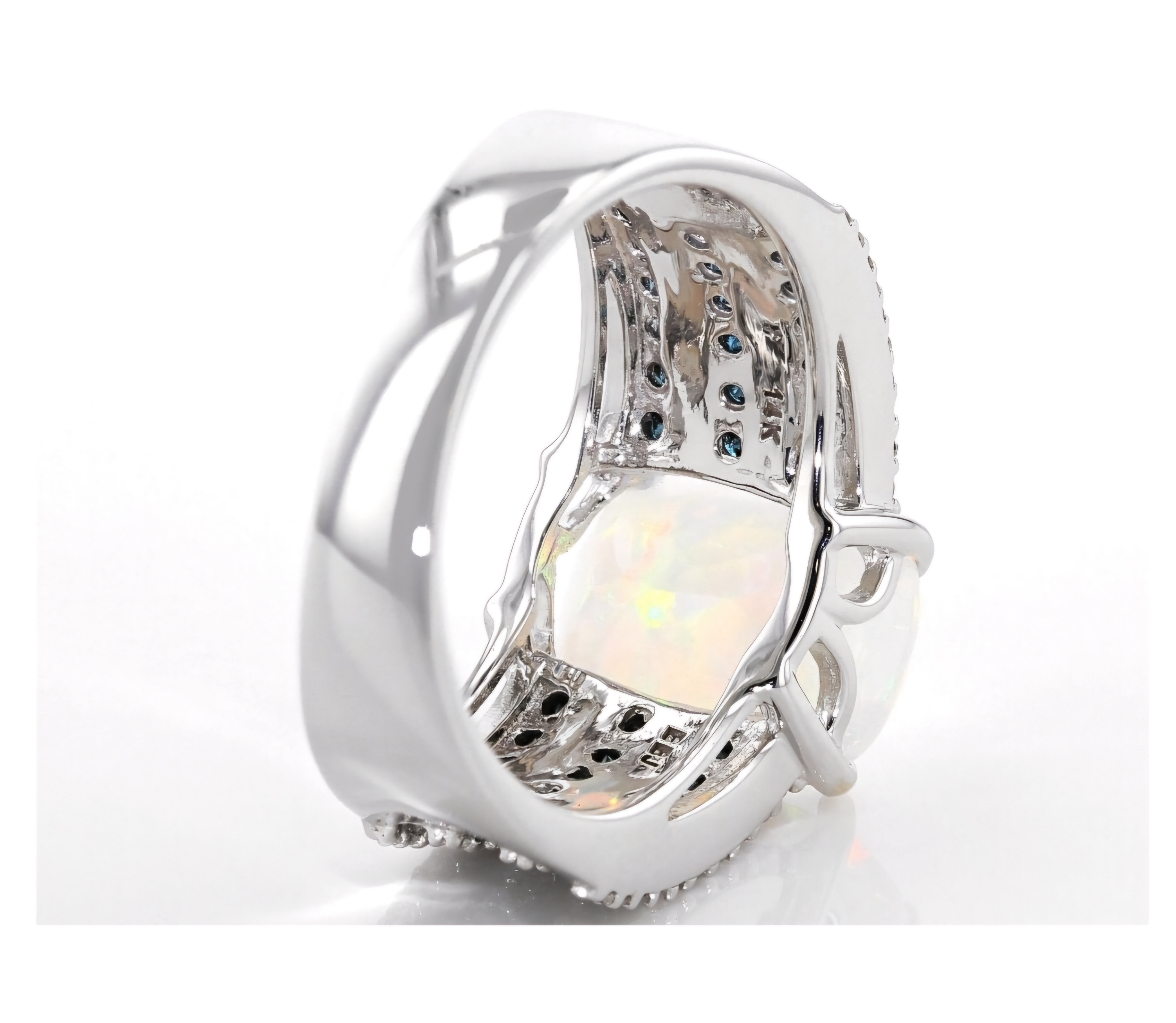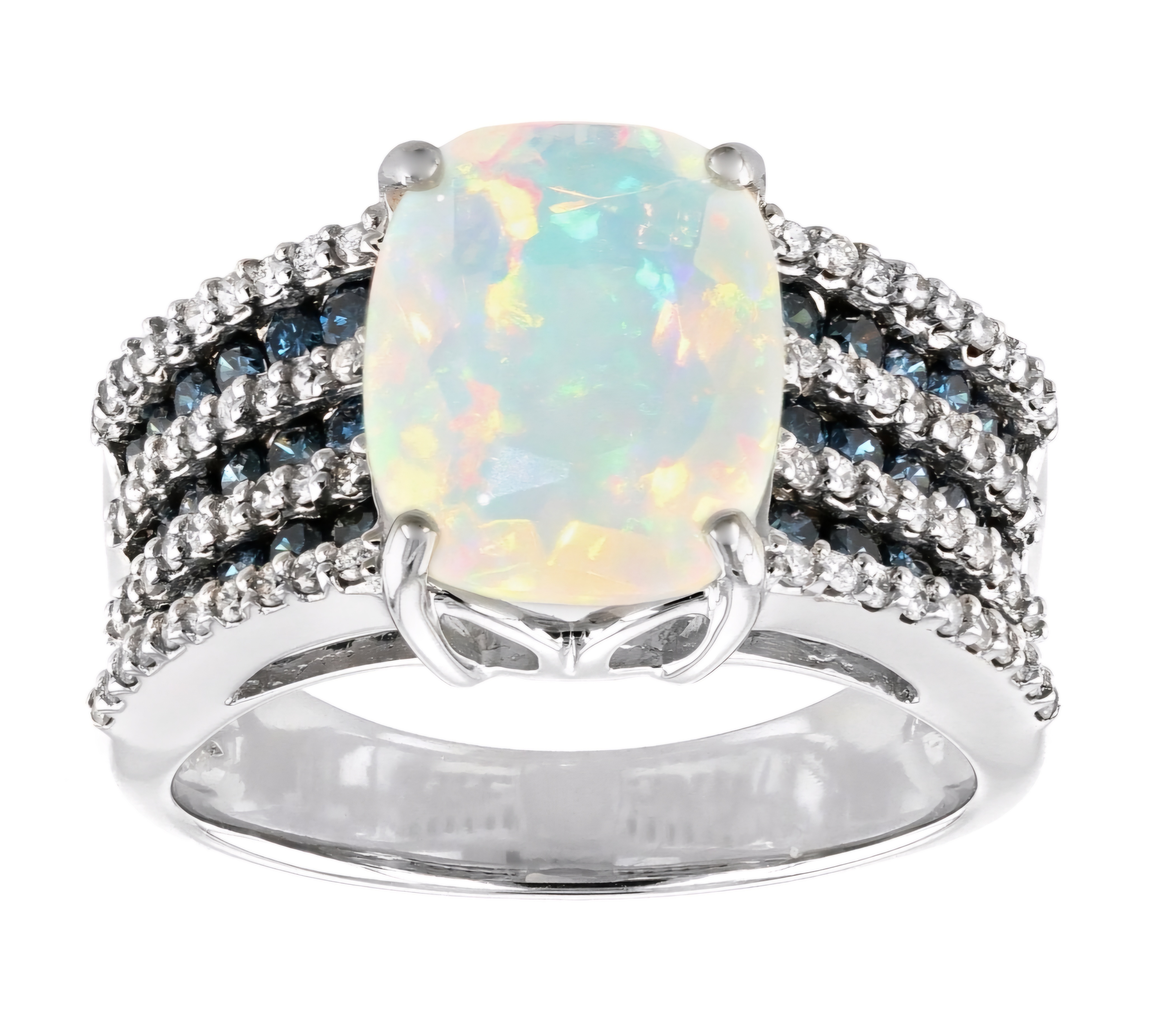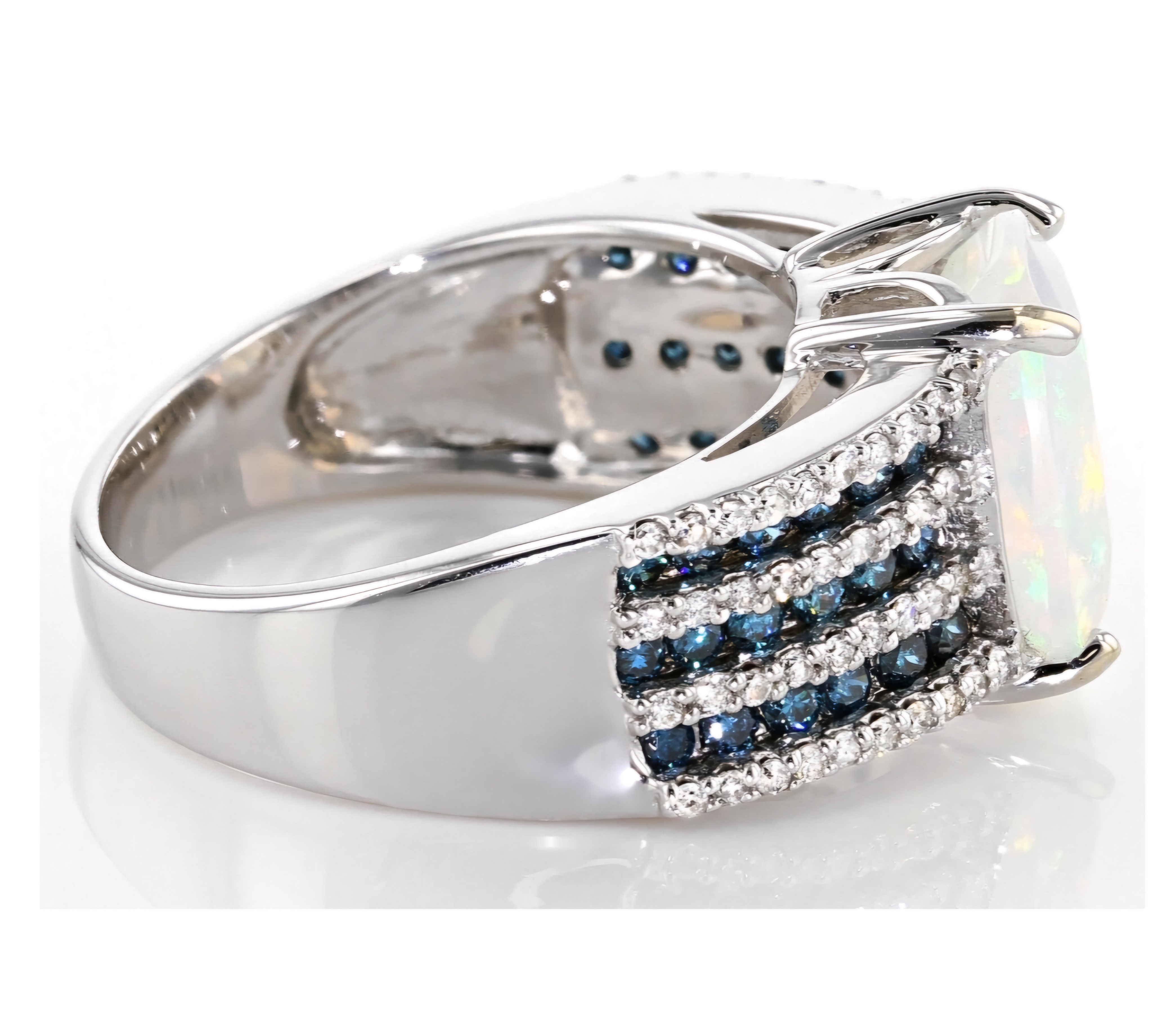 Elevate your jewelry collection with this exquisite Ethiopian Opal, Blue & White Diamond Ring crafted in 14K White Gold. The mesmerizing 2.60ctw Ethiopian Opal takes center stage, complemented by the dazzling blue and white diamonds that adorn the band. This opulent piece exudes sophistication and luxury, making it a perfect statement accessory for any elegant ensemble.