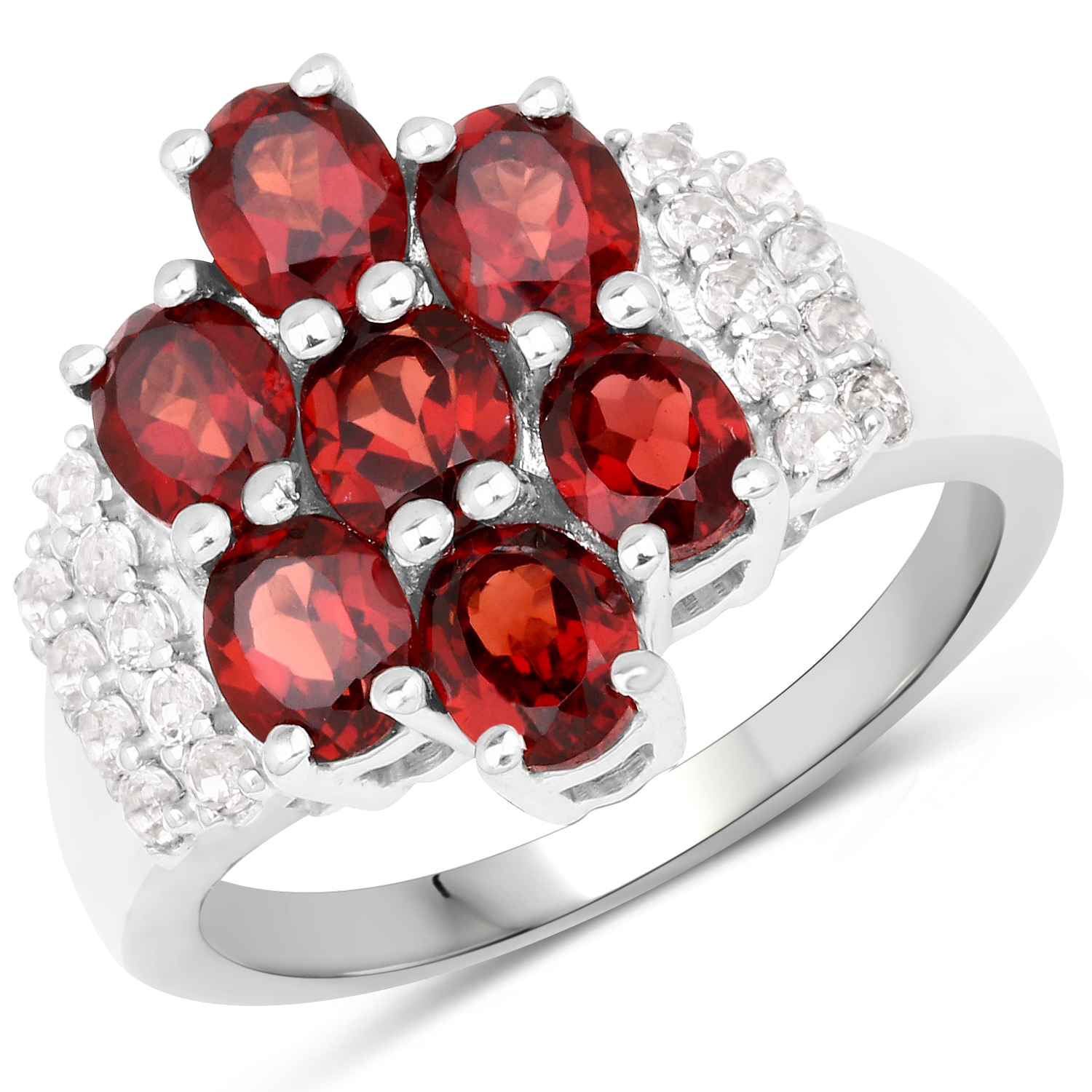 Crafted in rhodium-plated sterling silver, the ring has a bright, polished finish that contrasts with the deep red tones of the garnet.