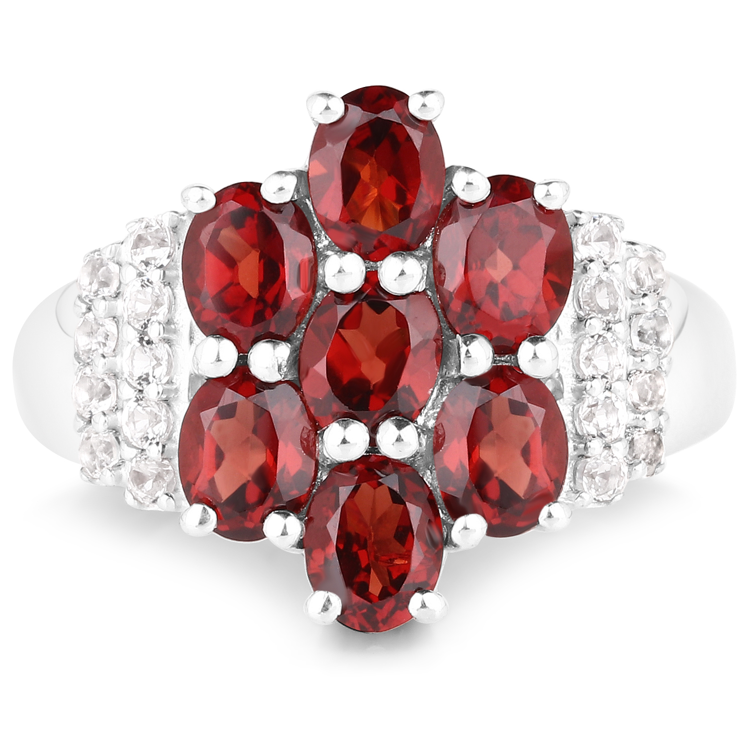 On each side, rows of white topaz add contrast and brightness. Their smaller size and neutral tone frame the garnet cluster, introducing additional sparkle while keeping the focus on the center stones.