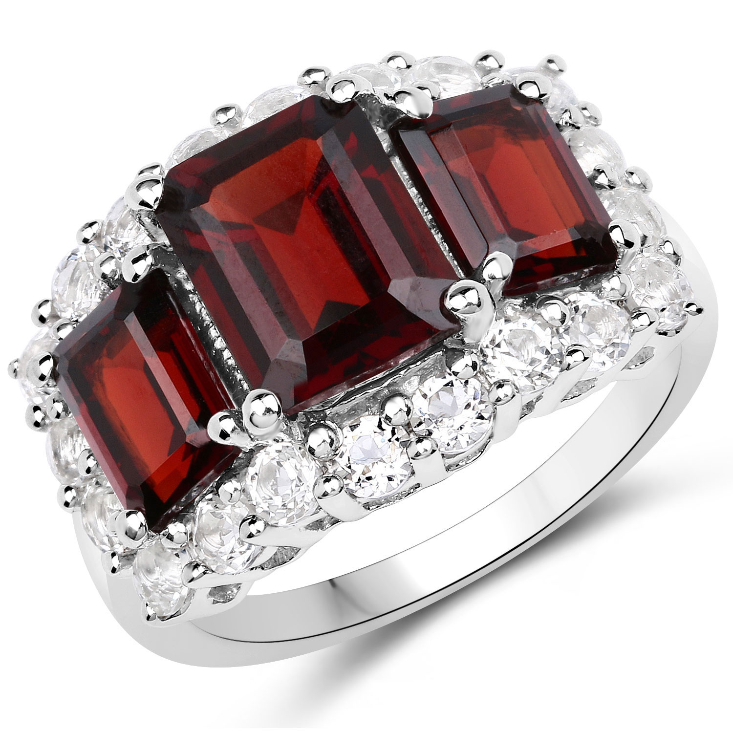 Make a confident statement with this garnet and white topaz trilogy halo ring, designed with bold structure and vibrant contrast. Three emerald-cut garnets display a deep, rich red hue, arranged in a balanced horizontal layout that creates strong visual presence across the finger.