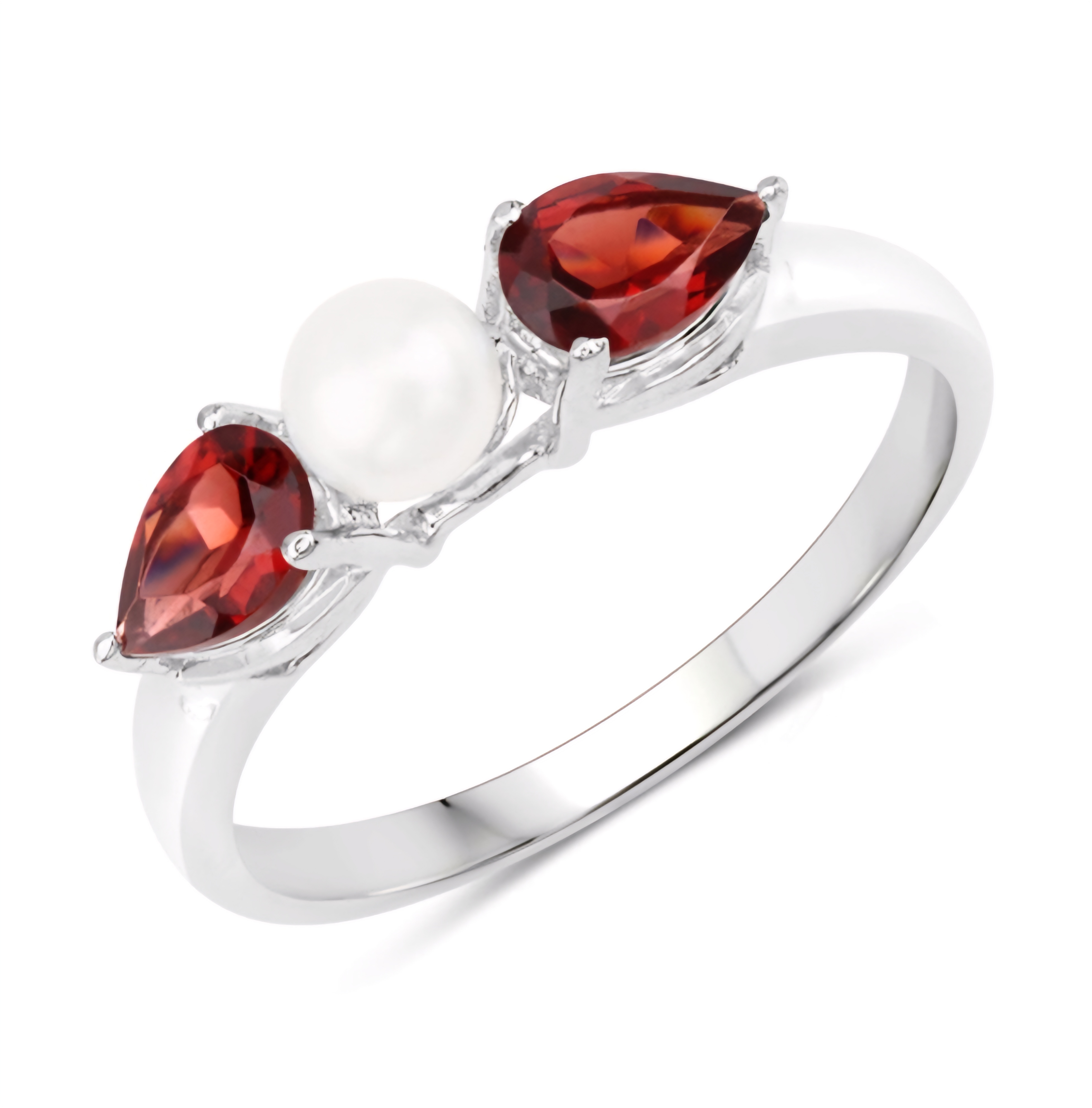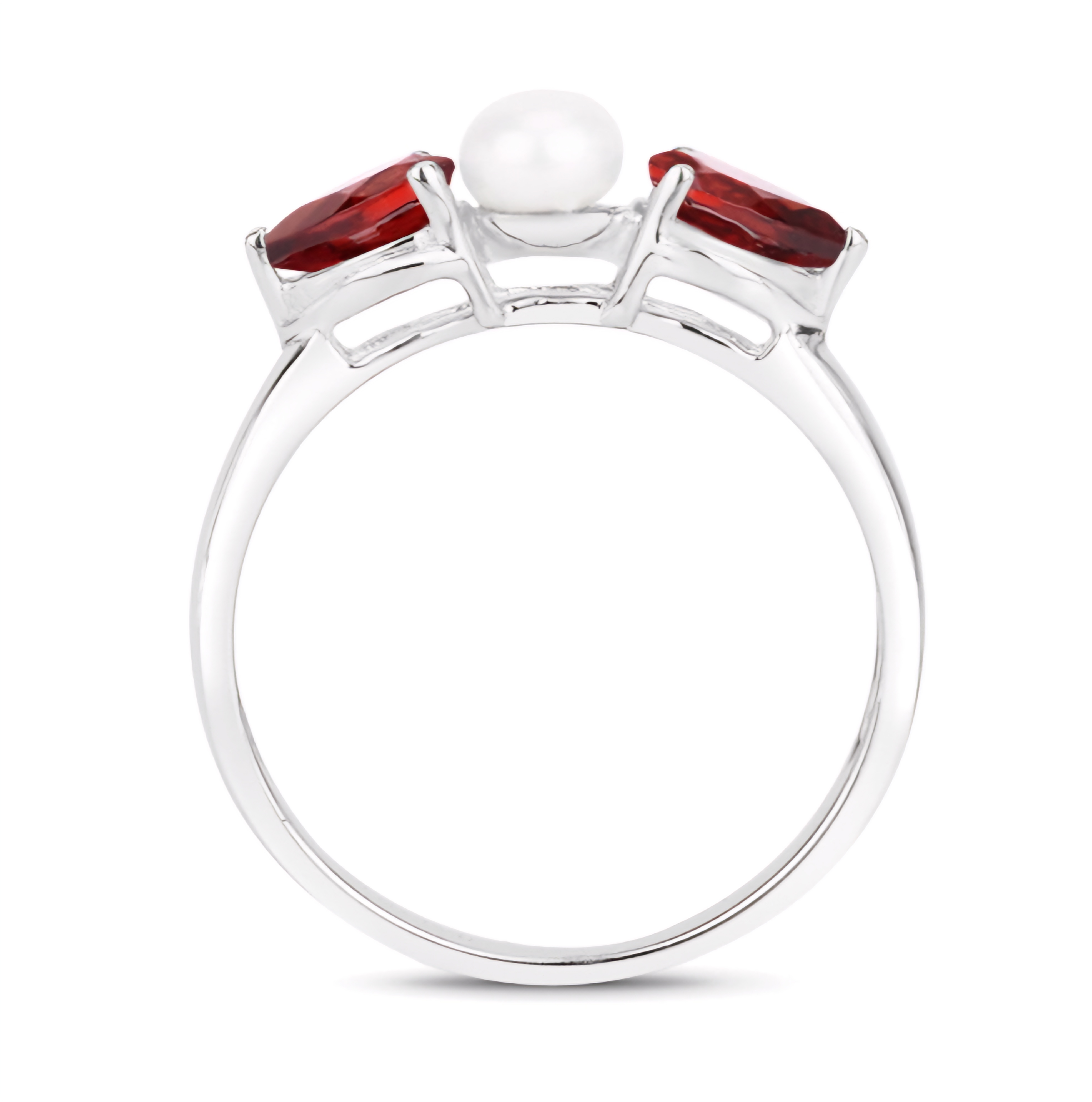 Elevate your style with the captivating elegance of our Garnet & Freshwater Pearl Three Stone Ring. Crafted in Rhodium over Sterling Silver, this exquisite piece features a round Freshwater Pearl as the centerpiece, flanked by dazzling pear cut garnets on either side. The fusion of vibrant red and lustrous white creates a striking contrast that will surely turn heads. With a total carat weight of 0.90ctw, this ring embodies sophistication and glamour, making it a perfect addition to your jewelry collection.