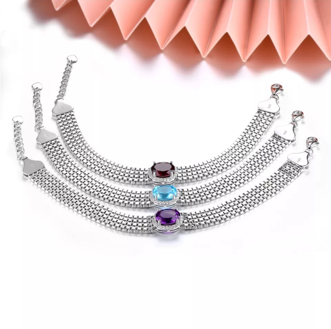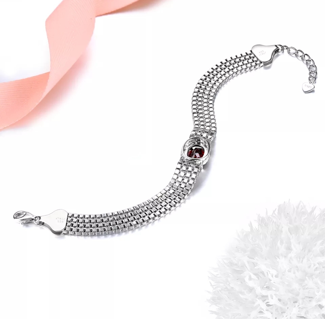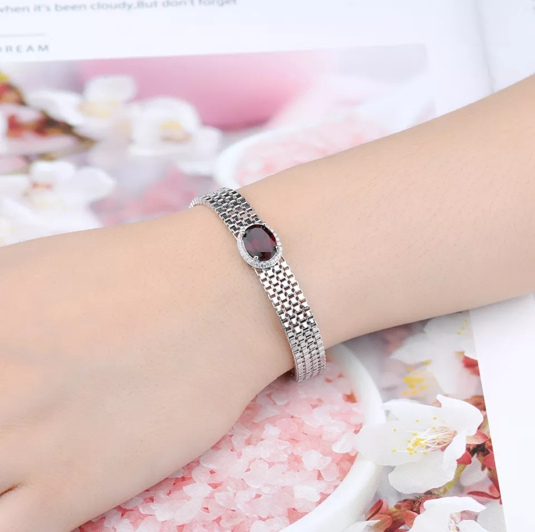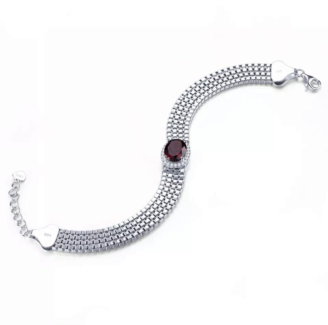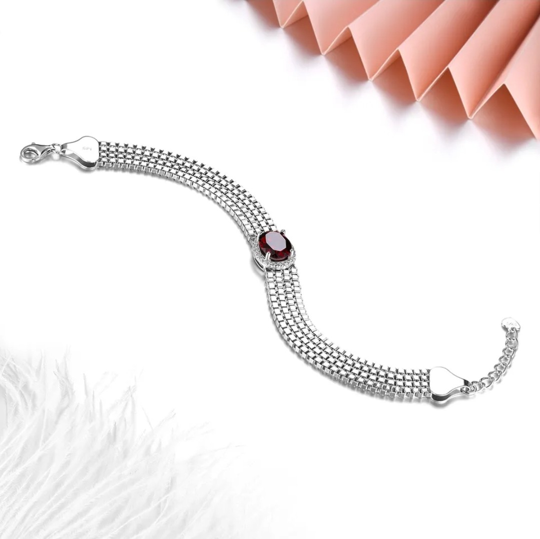 Make a statement and add a pop of color to your look with this exceptional Garnet & White Zircon Halo Bracelet in Rhodium over Sterling Silver. Crafted with the finest materials, it showcases a brilliant array of natural red-hued Garnet and dazzling White Zircon gemstones set in a gorgeous rhodium-plated sterling silver frame. Luxurious and beautiful, this is perfect for the modern woman who loves jewelry with a timeless touch.