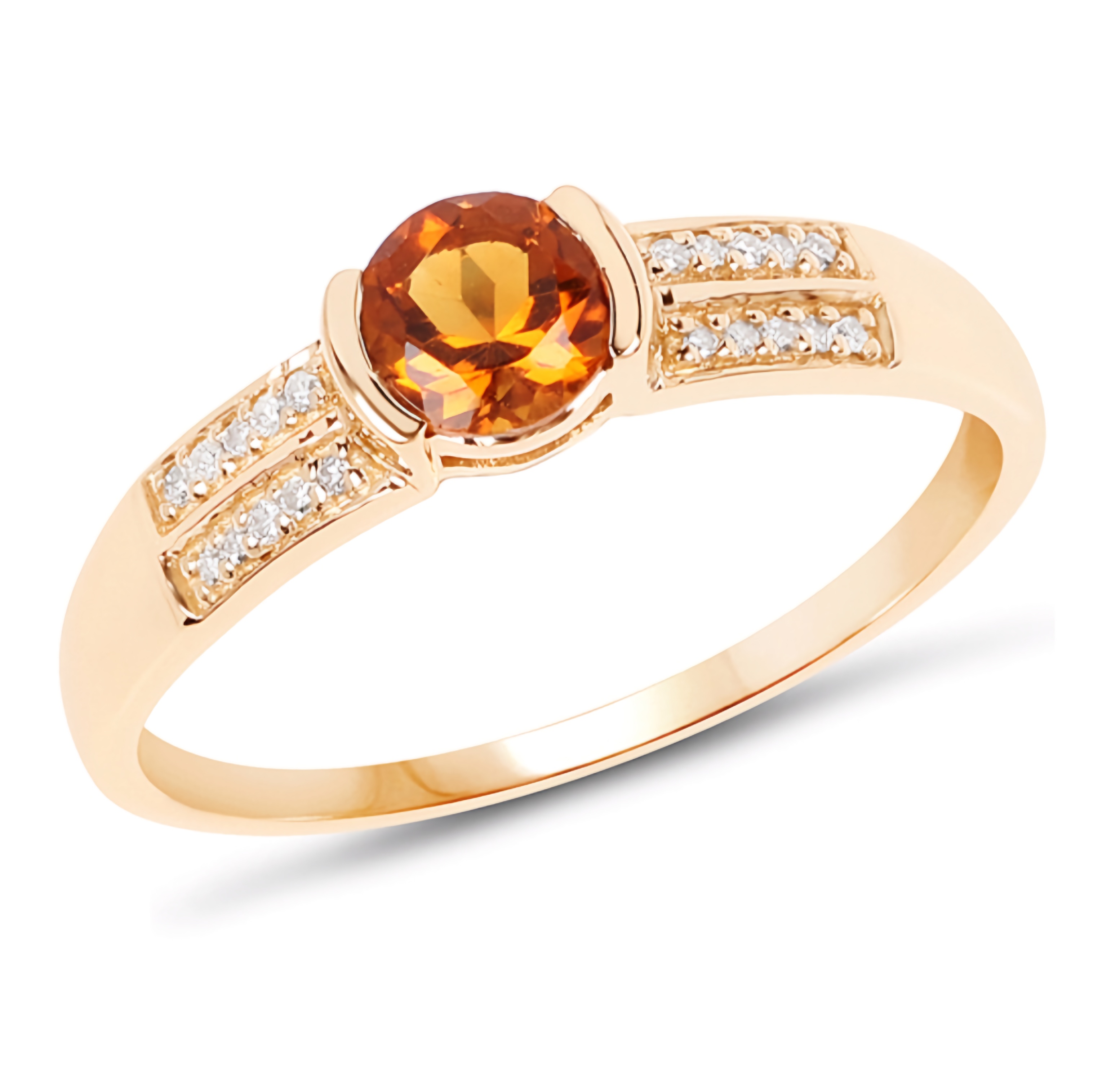 Elevate your everyday look with our Half Bezel Citrine & White Diamond Band Ring. This dainty piece features a half bezel set 5mm round cut citrine center stone, accented with a double row of round cut diamonds down the shank sides. Crafted in solid 14k Yellow Gold, this ring exudes a minimalist style that is perfect for any occasion.