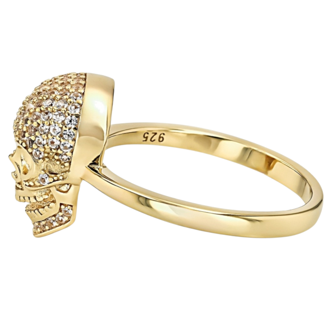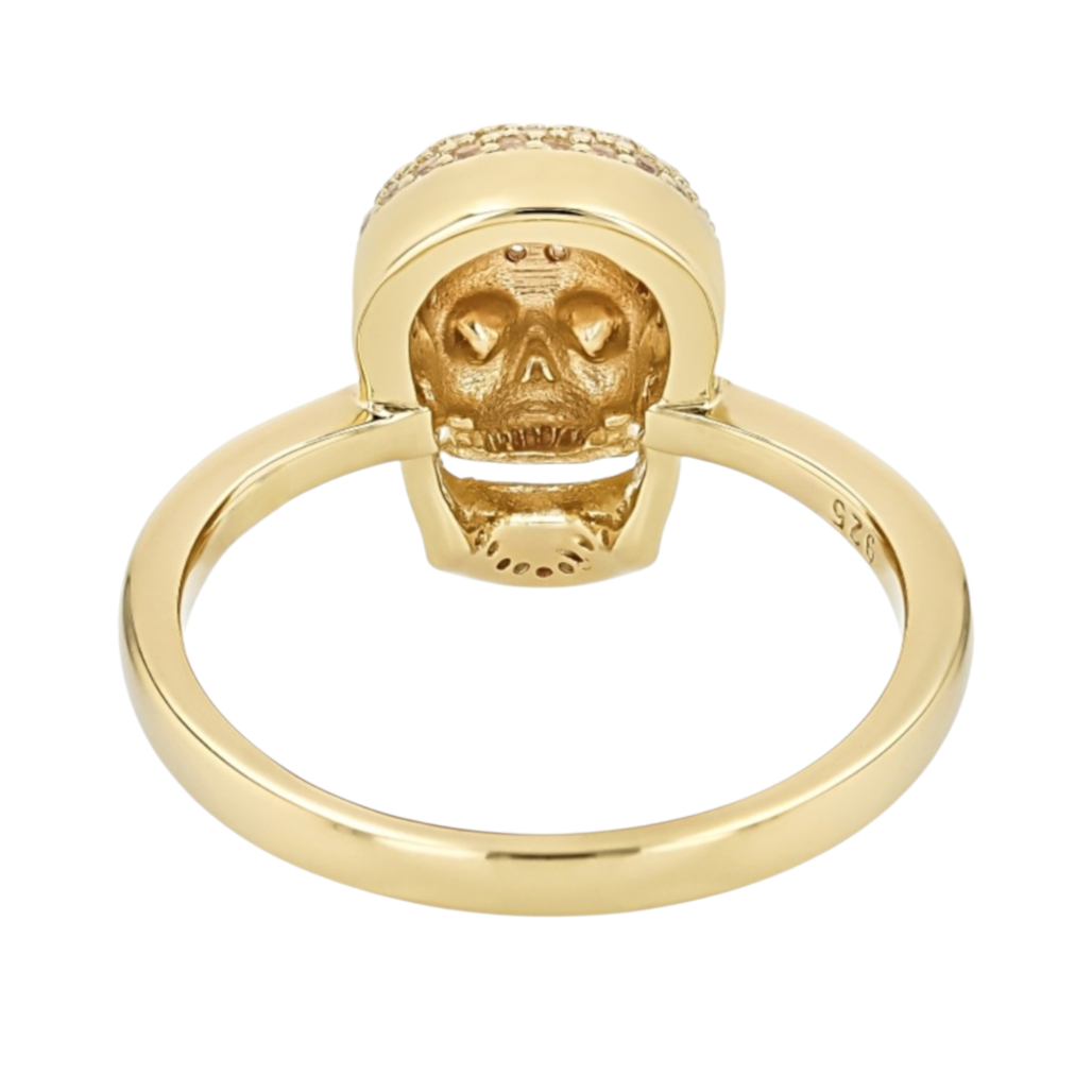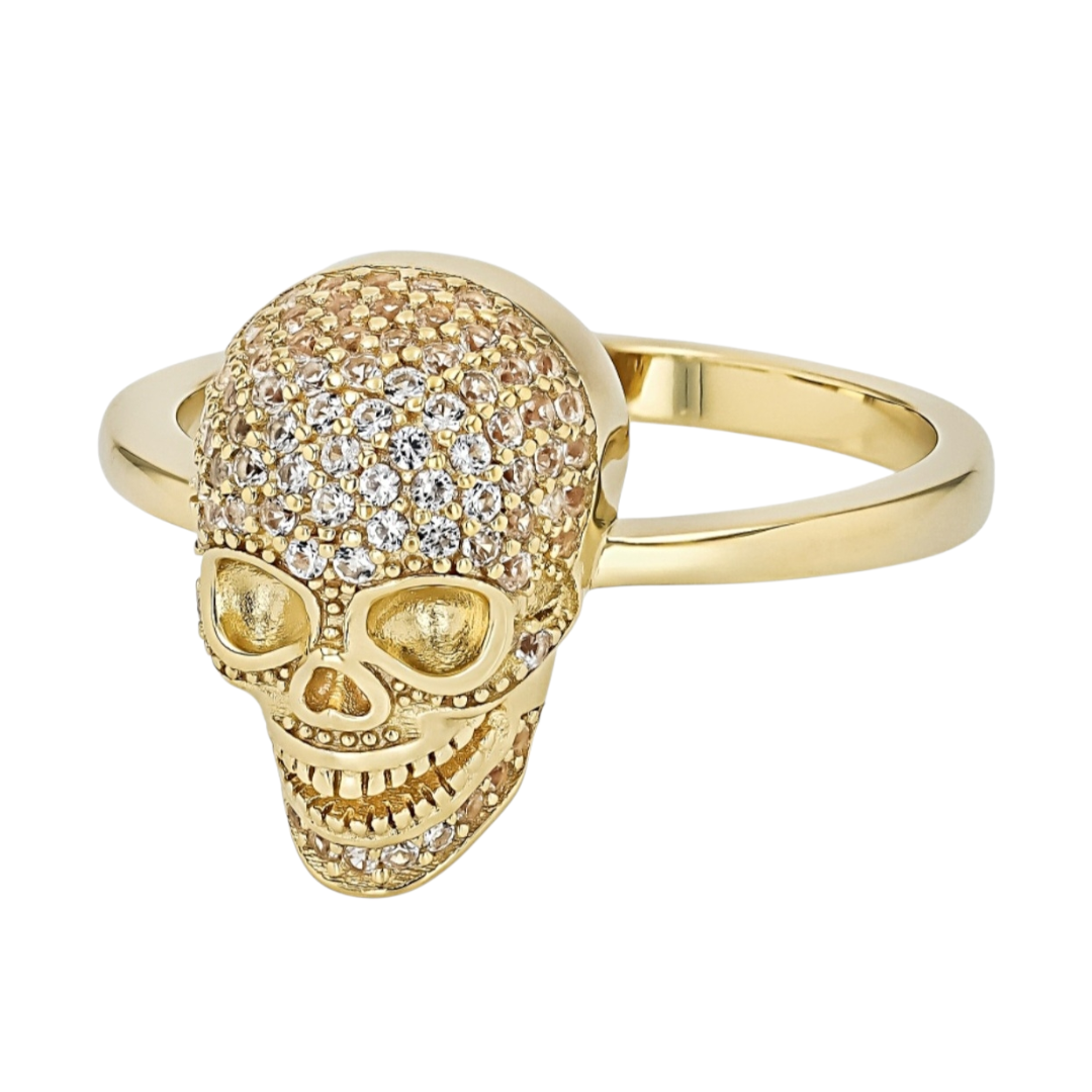 Elevate your sense of style with this exquisite Laboratory Created White Sapphire Skull Ring In 18K Yellow Gold over Sterling Silver 0.45ctw. Embrace the edgy yet sophisticated allure of a skull motif, adorned with dazzling white sapphires that sparkle with every movement. This luxurious piece is crafted with precision and artistry, making it a true statement accessory for those with a discerning taste for unique fine jewelry.
