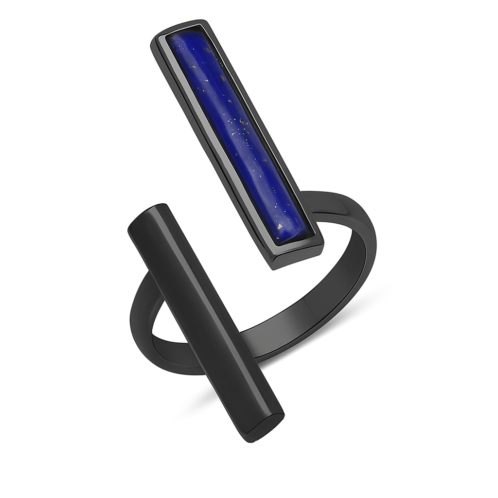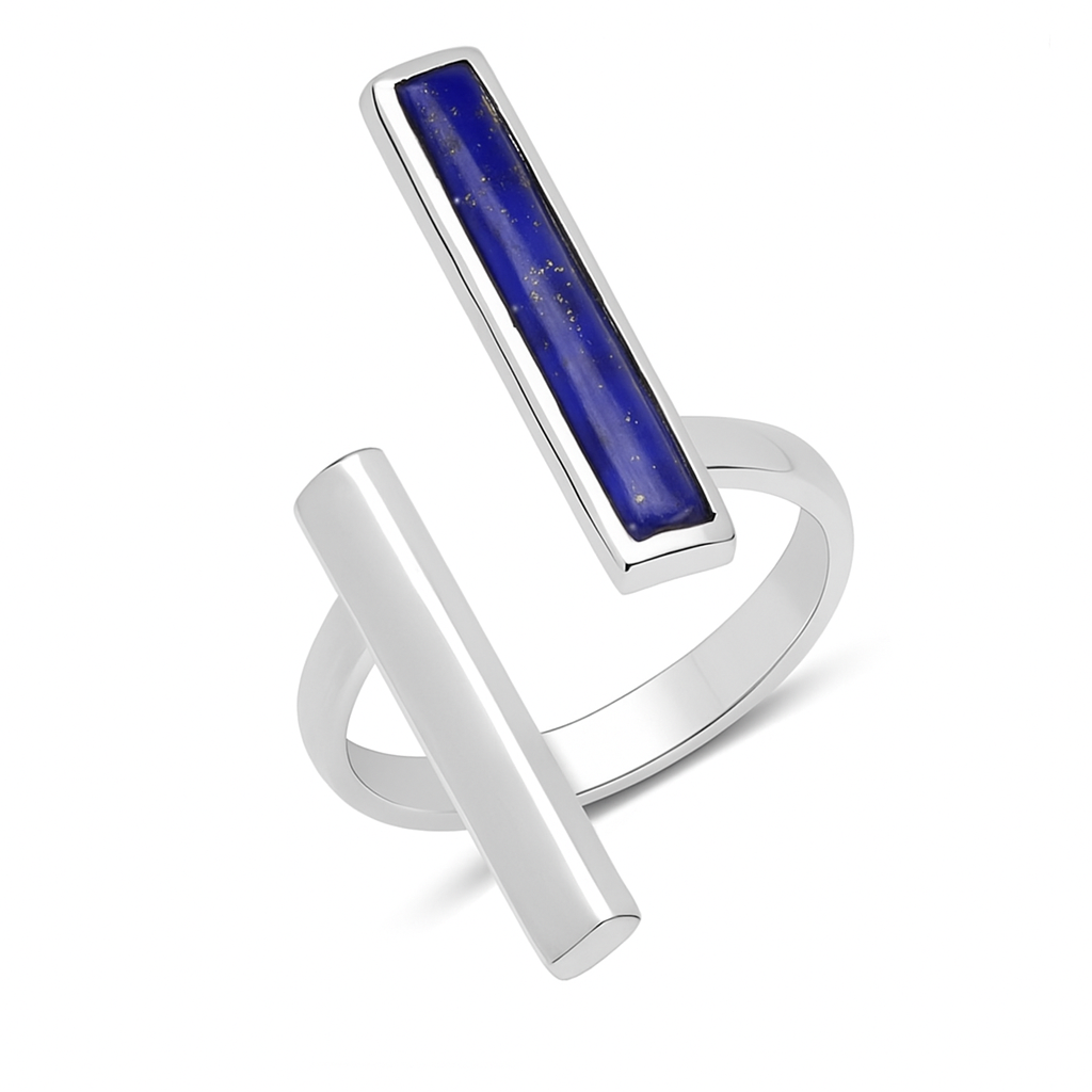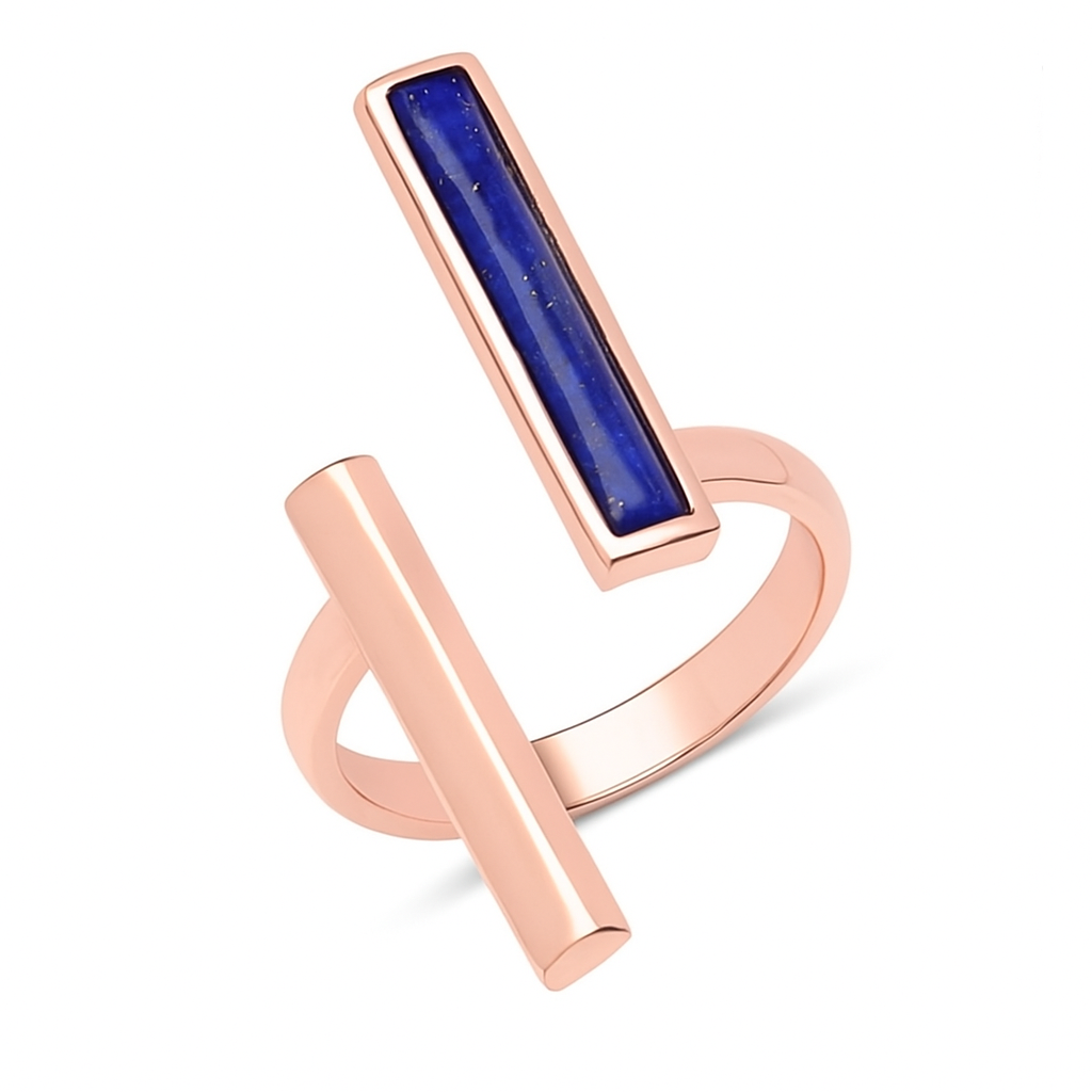 Elevate your style with this trendy Lapis Lazuli Open Split Bypass Ring in Solid 18k Yellow Gold over Sterling Silver. Featuring a 19x3mm rectangle cabochon cut Lapis Lazuli bezel set, this chic ring is perfect for the fashion forward individual. The two opposing rectangle bars add a unique touch to this high polish ring.