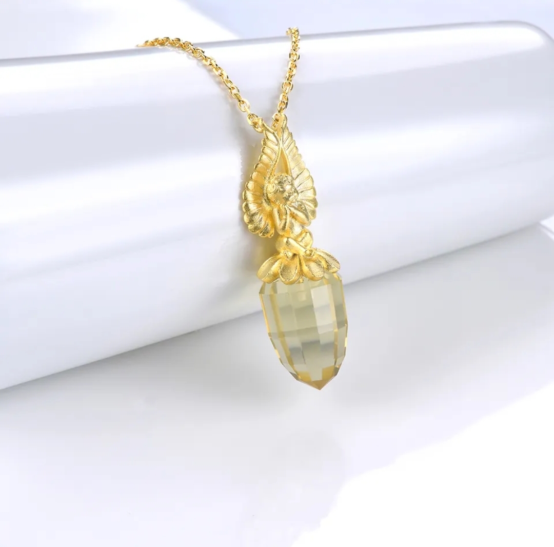 Make a grand statement with our Lemon Quartz Briolette Angel Pendant Necklace in 18k Yellow Gold over Sterling Silver. Designed for the fashion-forward woman who loves to make an entrance, this necklace embodies the perfect blend of glamour and sophistication. The pendant features a mesmerizing lemon quartz briolette, suspended beautifully from an exquisite angel motif. The necklace is crafted from the finest quality 18k yellow gold over sterling silver, ensuring a long-lasting, luxurious finish. Take your look from ordinary to extraordinary with this angelic pendant necklace that will add a touch of elegance to any outfit.