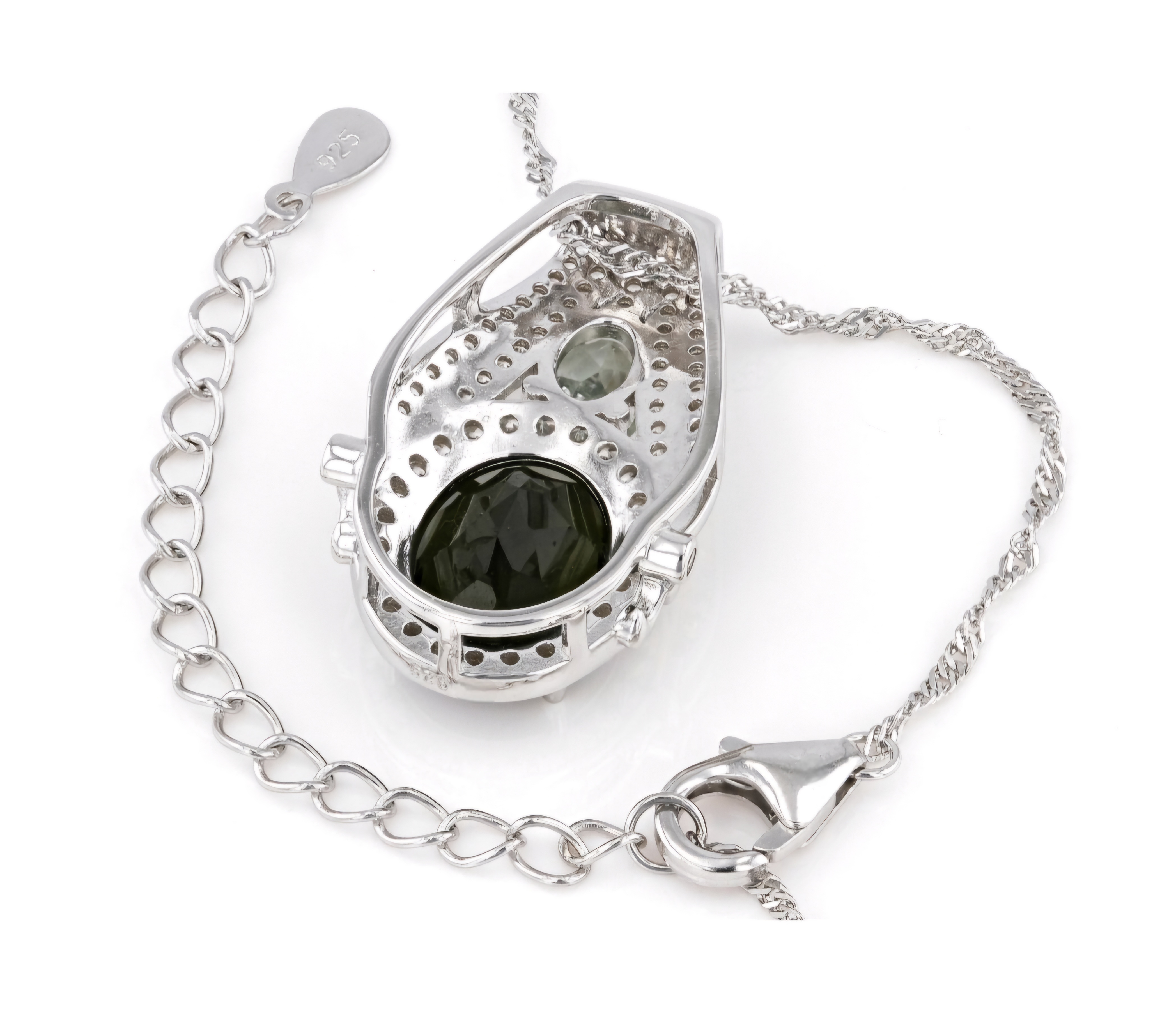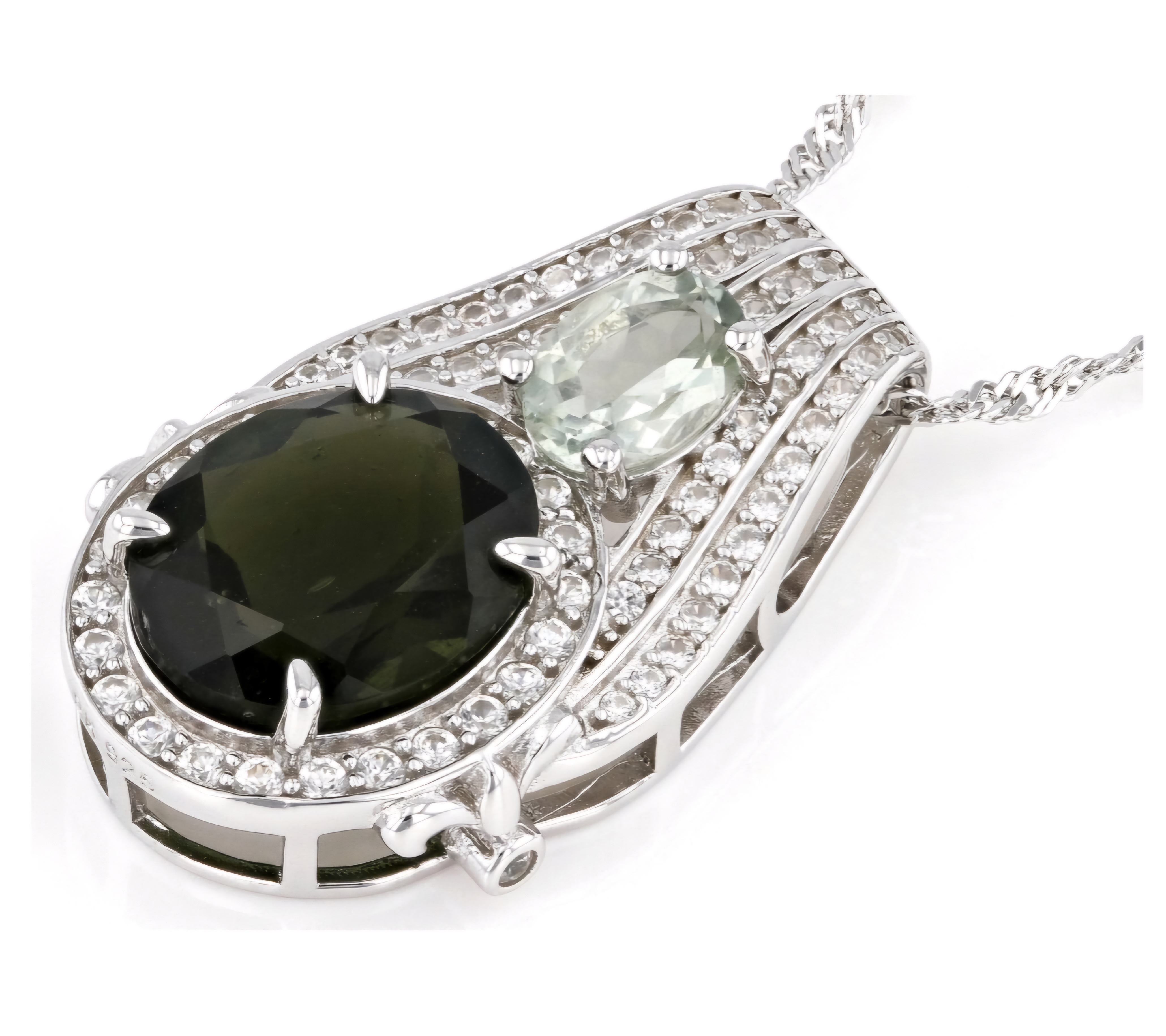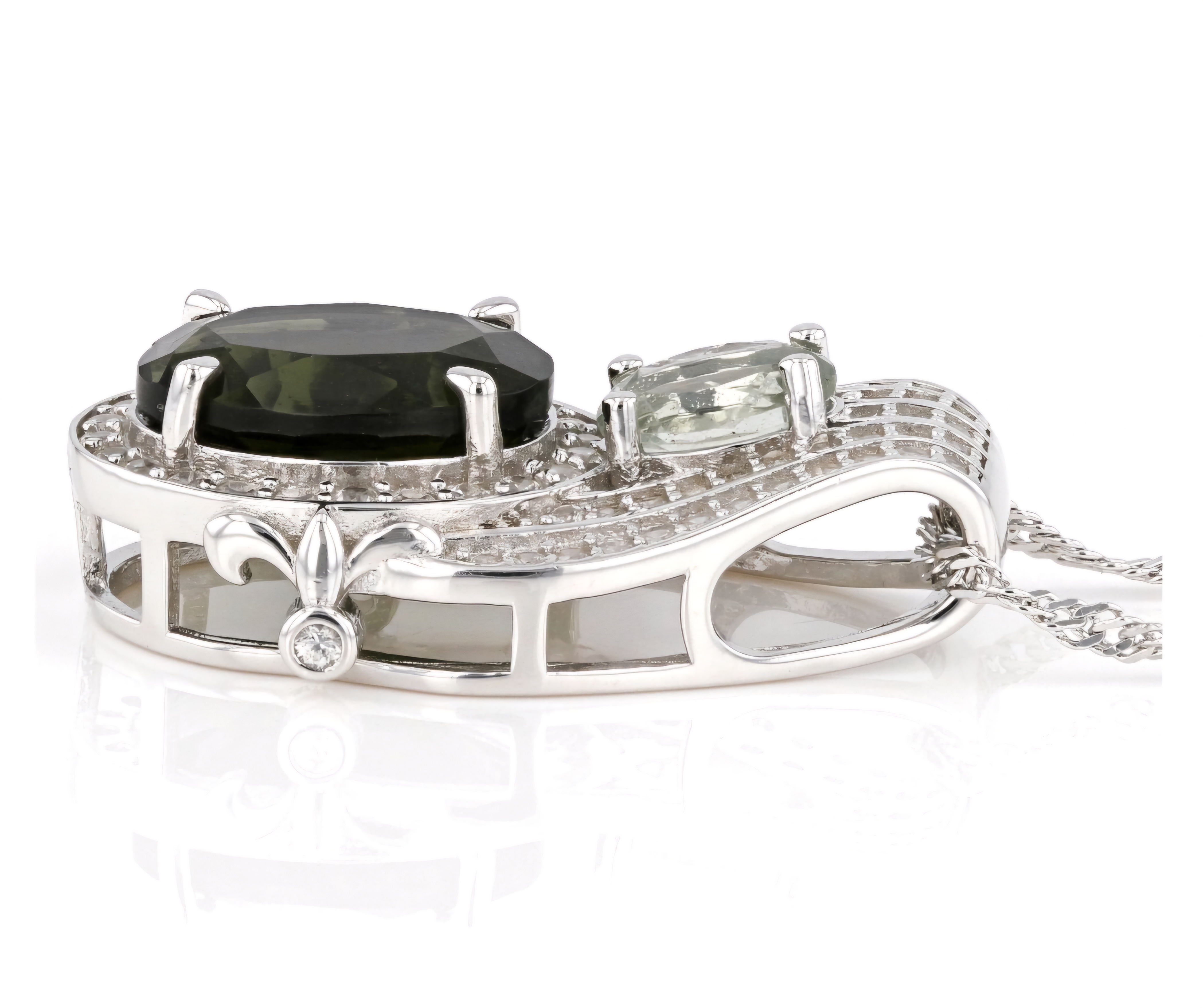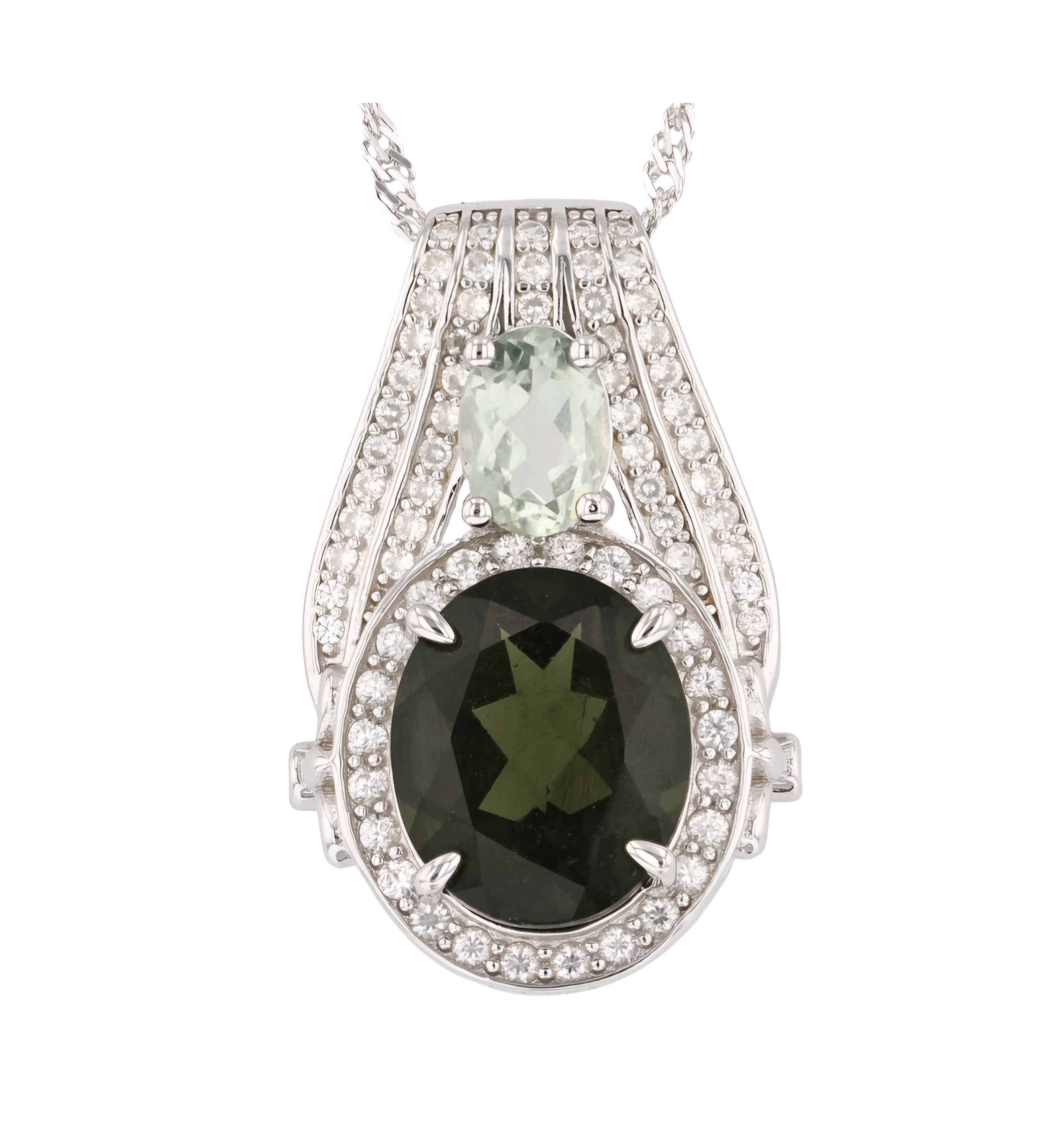 Elevate your jewelry collection with this exquisite Moldavite, Prasiolite & Zircon Pendant Necklace. Crafted in Rhodium over Sterling Silver, the 4.60ctw gemstones shimmer with elegance and sophistication. Make a statement with this luxurious piece.