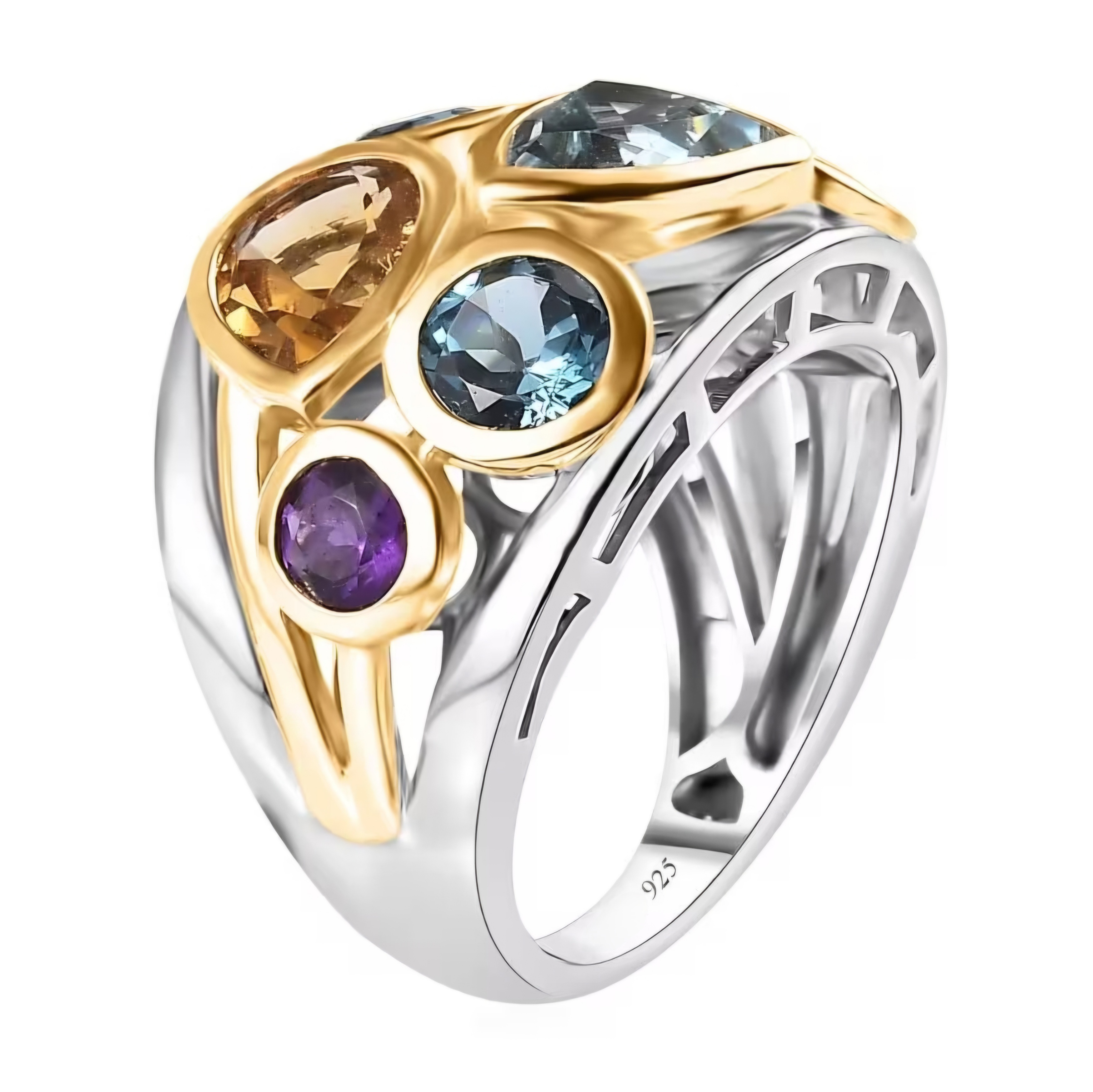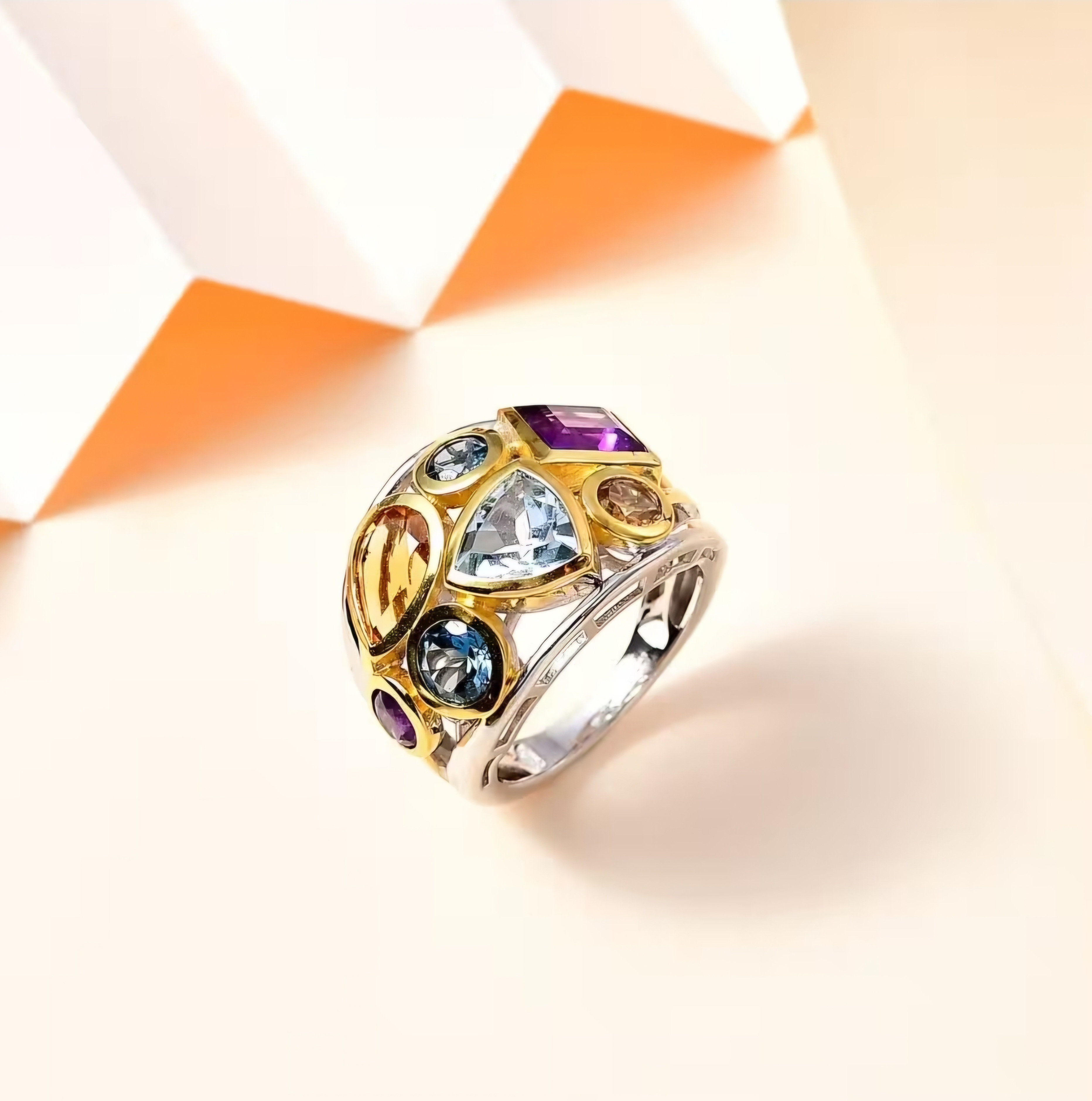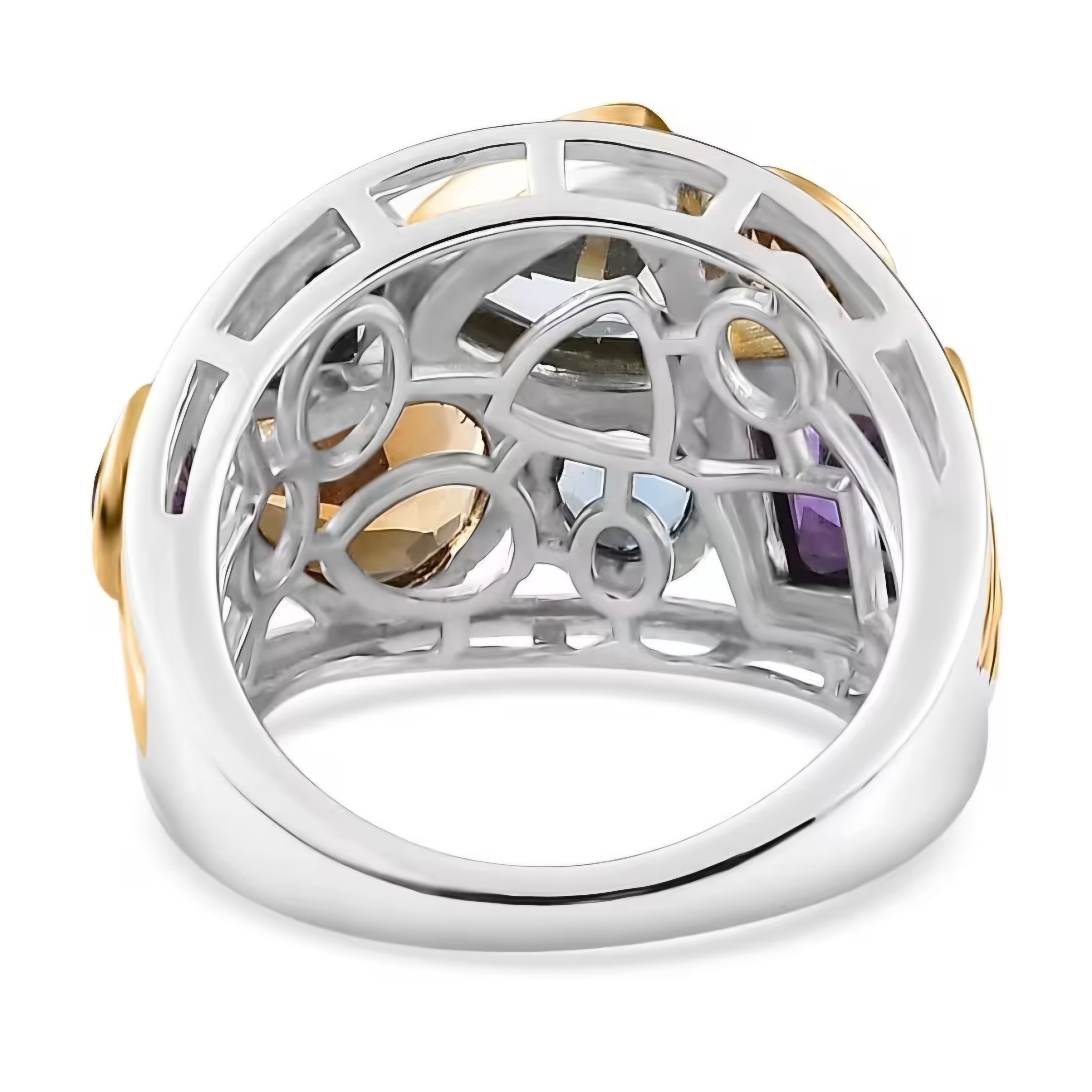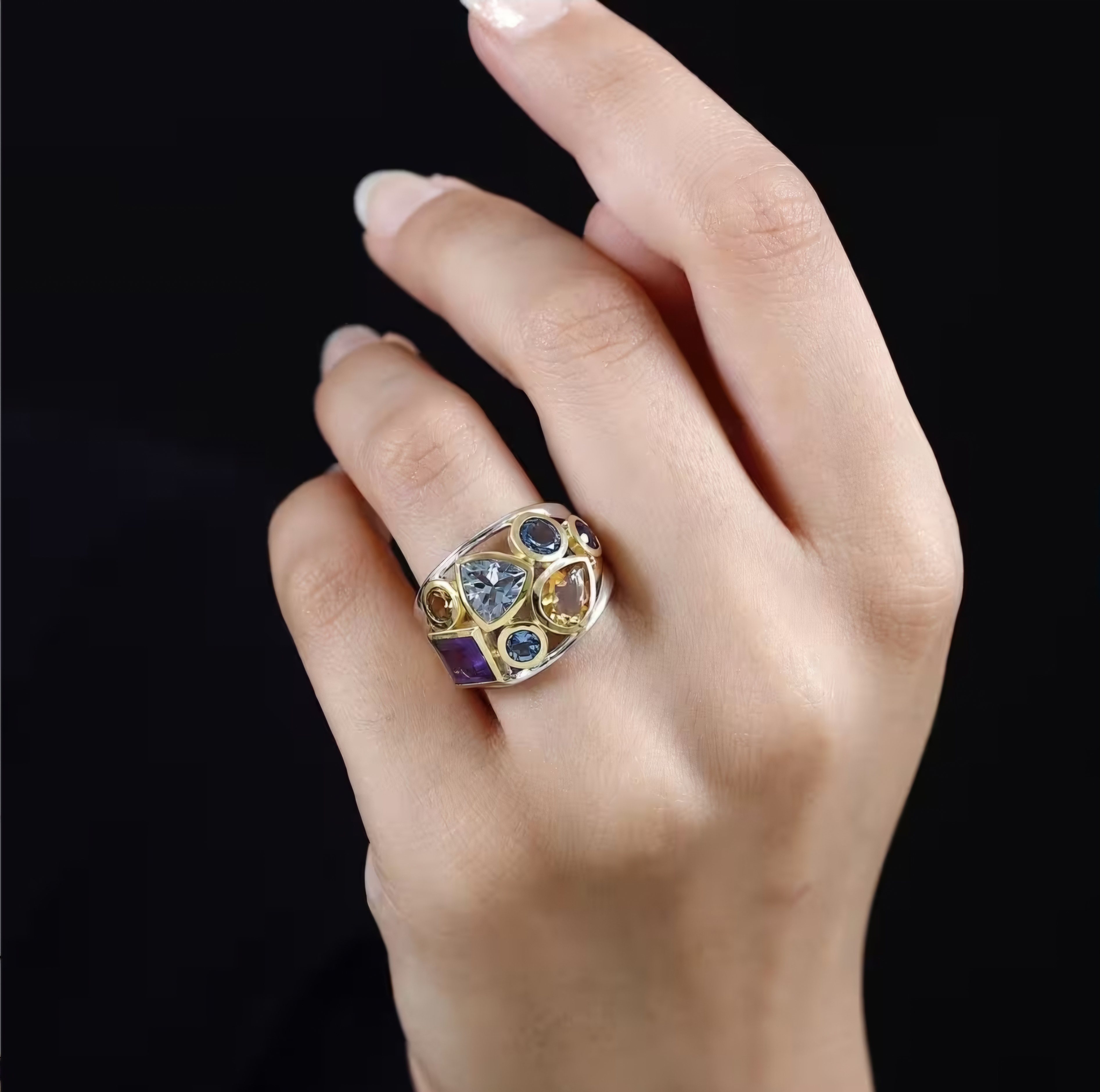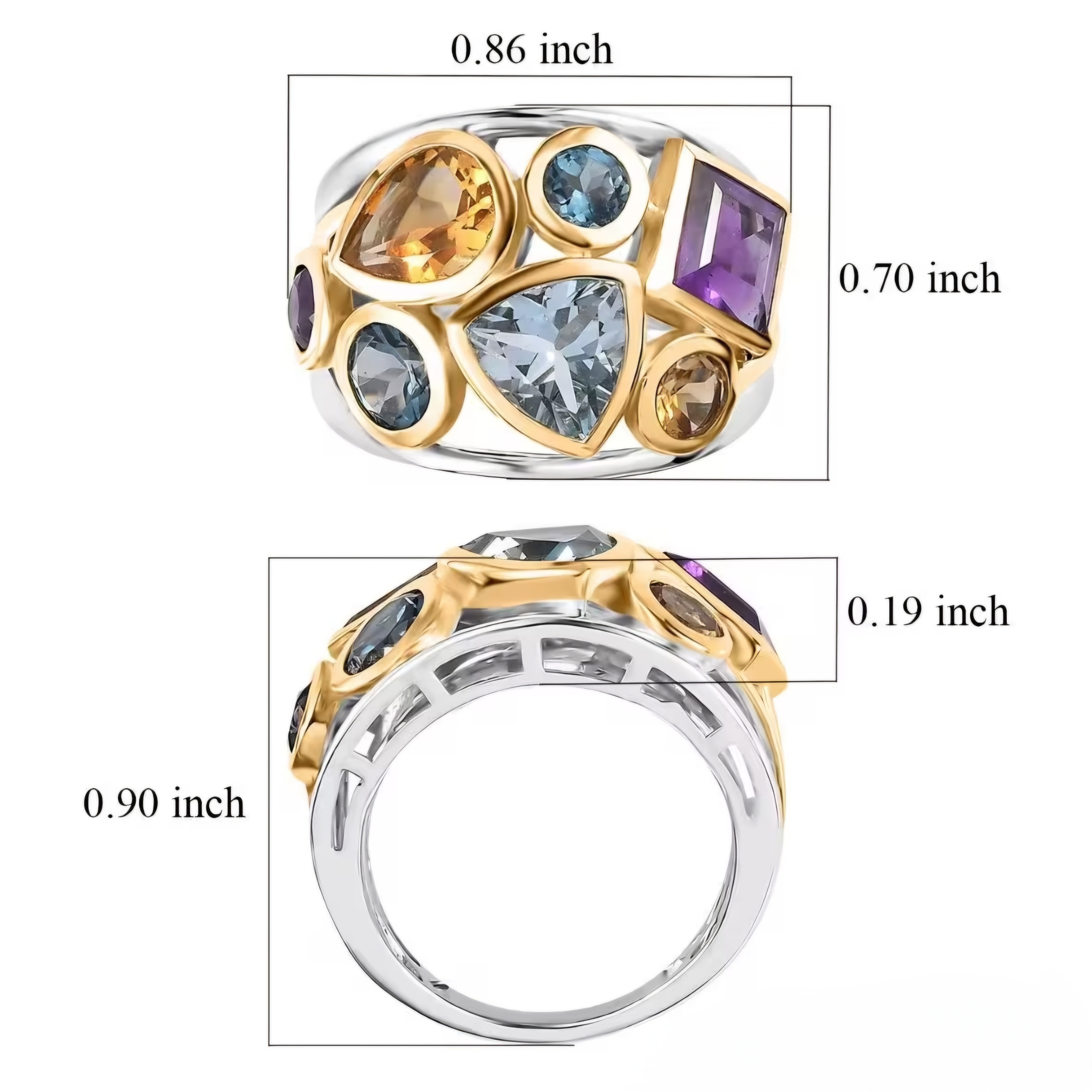 Elevate your everyday look with our Multi Gemstone Bezel Set Two-tone Wide Band Ring! This modern, bold accessory features mixed shapes and cuts of natural Amethyst, Citrine, London Blue, and Sky Blue Topaz, all bezel set in 18k Yellow Gold for a colorful pop. The negative space design and wide spread make this ring a statement piece that will definitely turn heads. Treat yourself to a touch of luxury with this stunning ring.