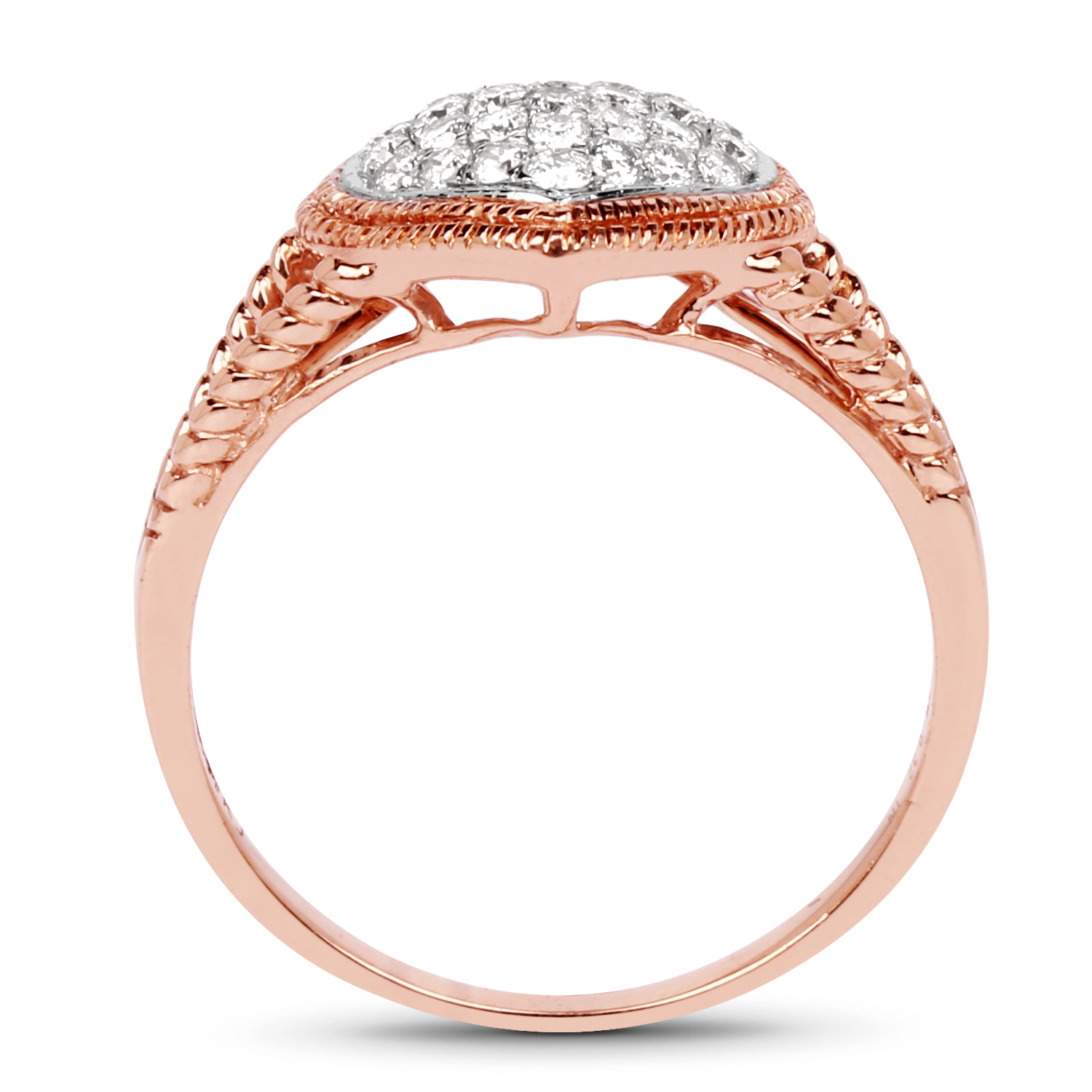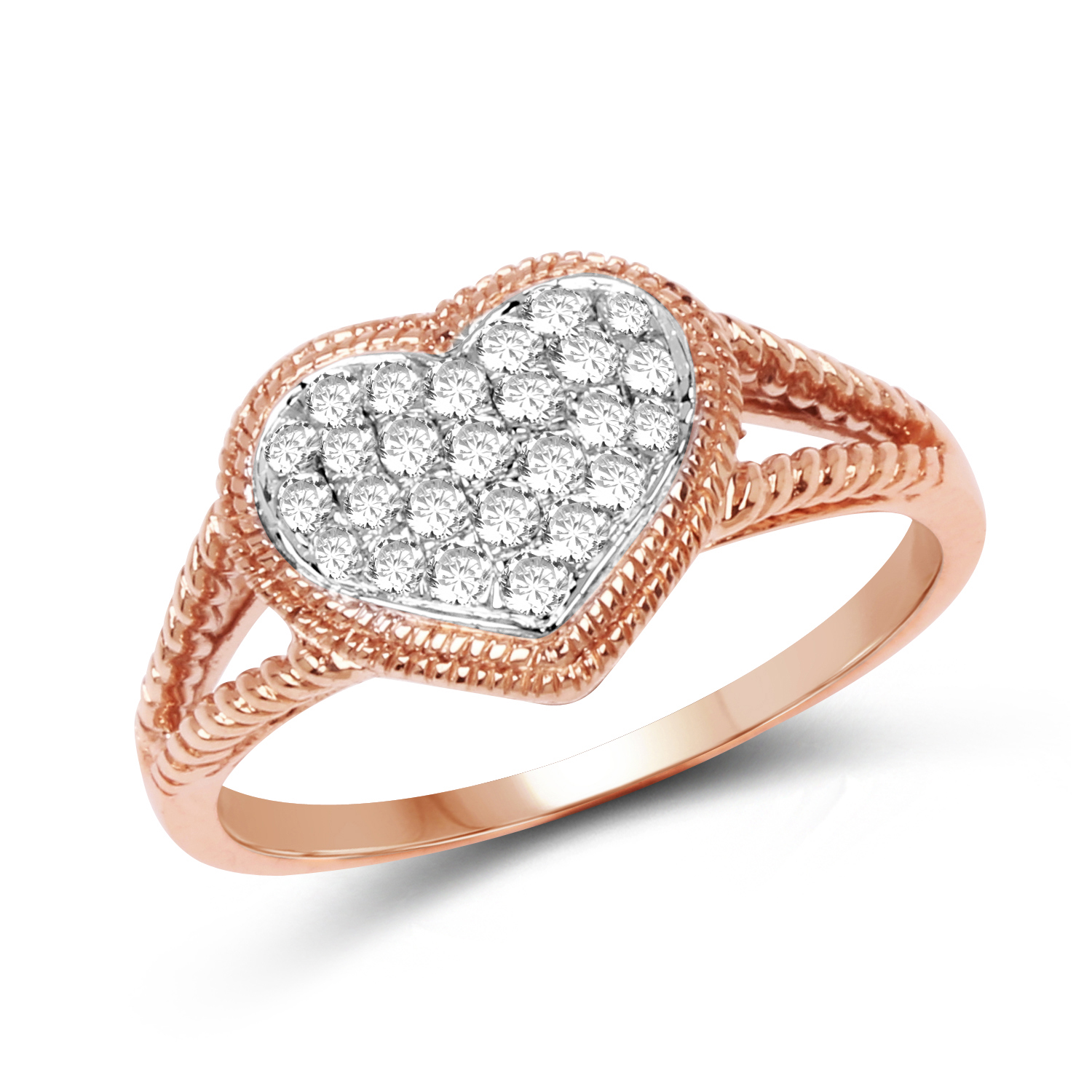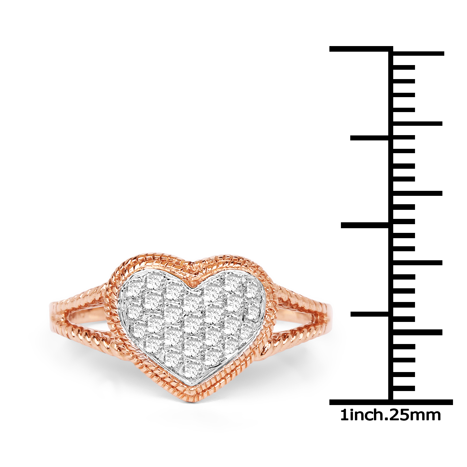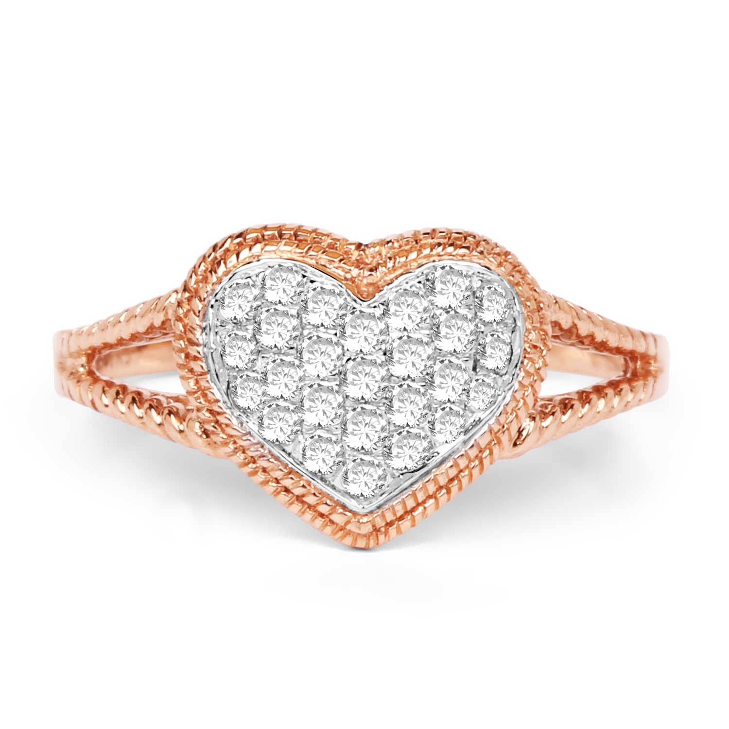 Crafted in solid 14K rose gold, the warm tone of the metal complements the diamonds while adding a soft, romantic finish. The band features fine detailing along the sides, giving the ring additional texture without overwhelming the design. A timeless heart motif designed with balance, brilliance, and everyday wear in mind.