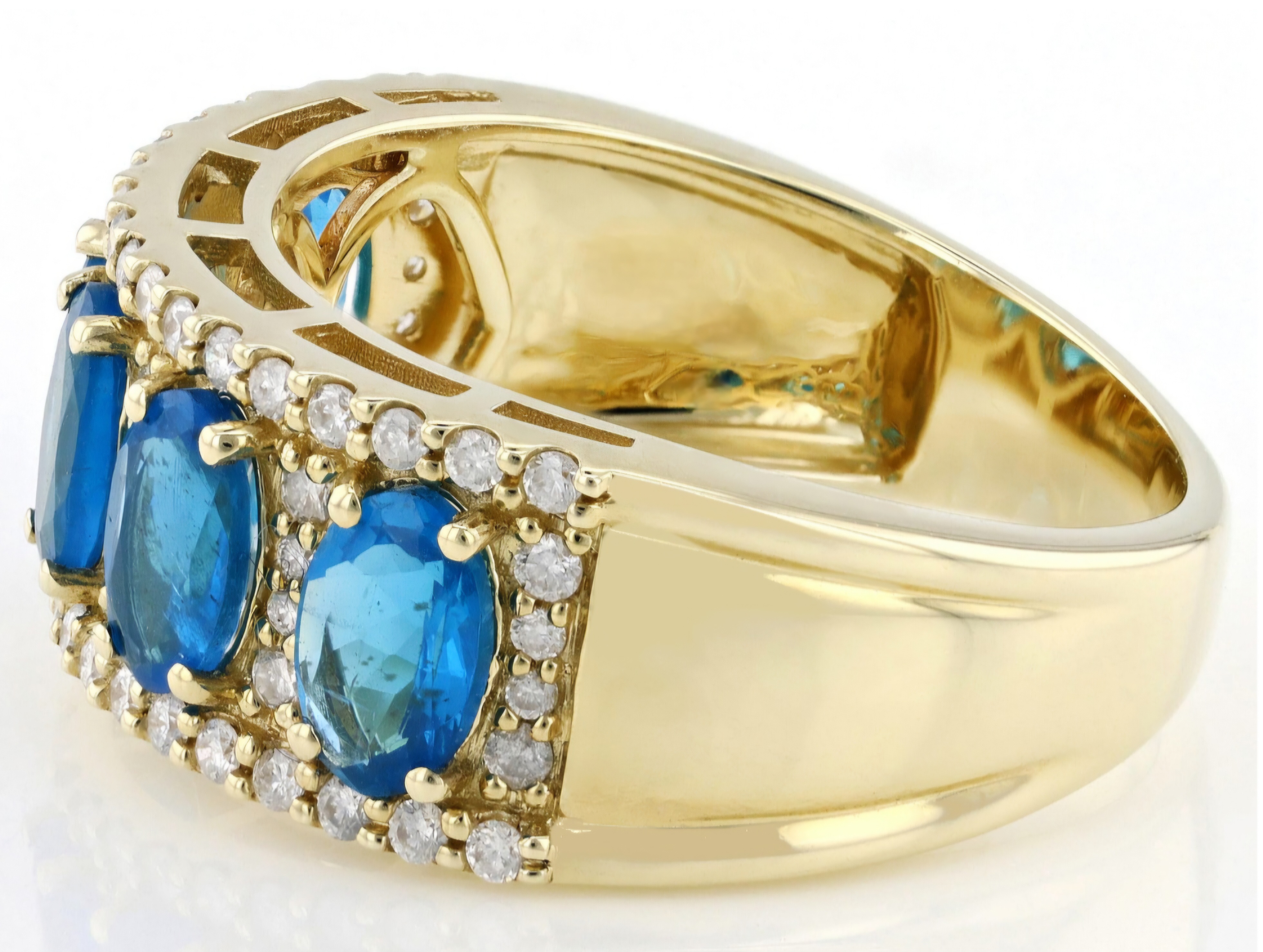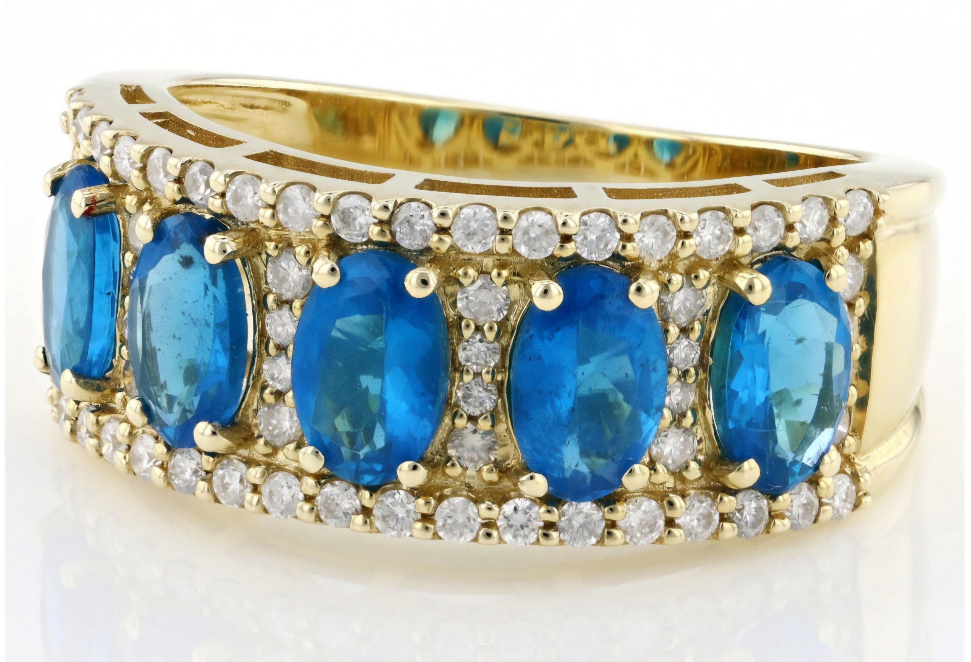 Elevate your jewelry collection with this exquisite Neon Apatite & Diamond Five Stone Band Ring In 14K Yellow Gold. Featuring a total carat weight of 2.30ctw, this stunning ring radiates elegance and sophistication. Crafted in luxurious 14K yellow gold, this band ring will add a pop of color and sparkle to any outfit. Treat yourself or a loved one to this beautiful piece that is sure to dazzle.