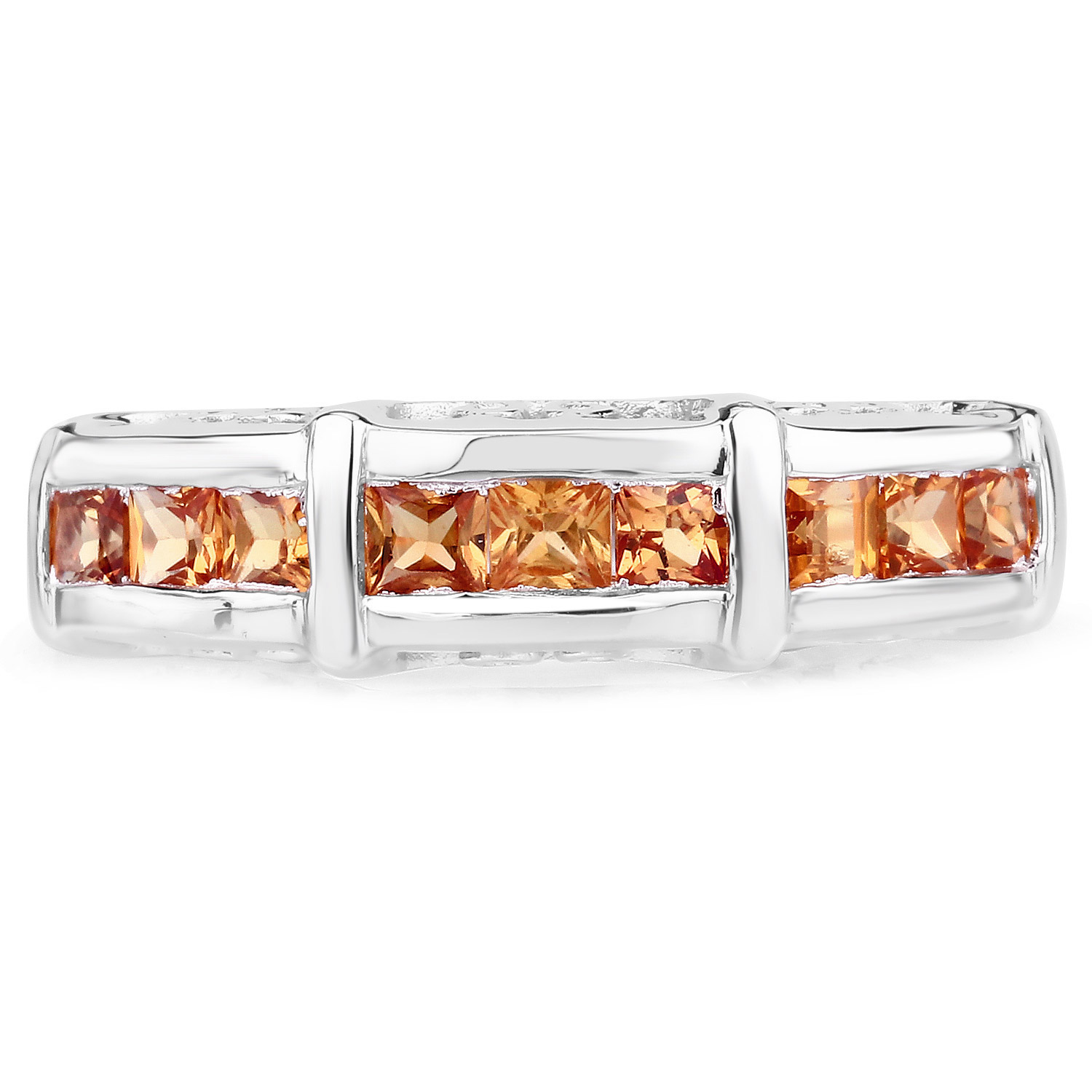 This band features square-cut orange sapphires, each approximately 2.5mm, set in a continuous row across the top. The geometric cuts give the ring a structured, modern appearance, while the rich orange tones add warmth and visual depth.