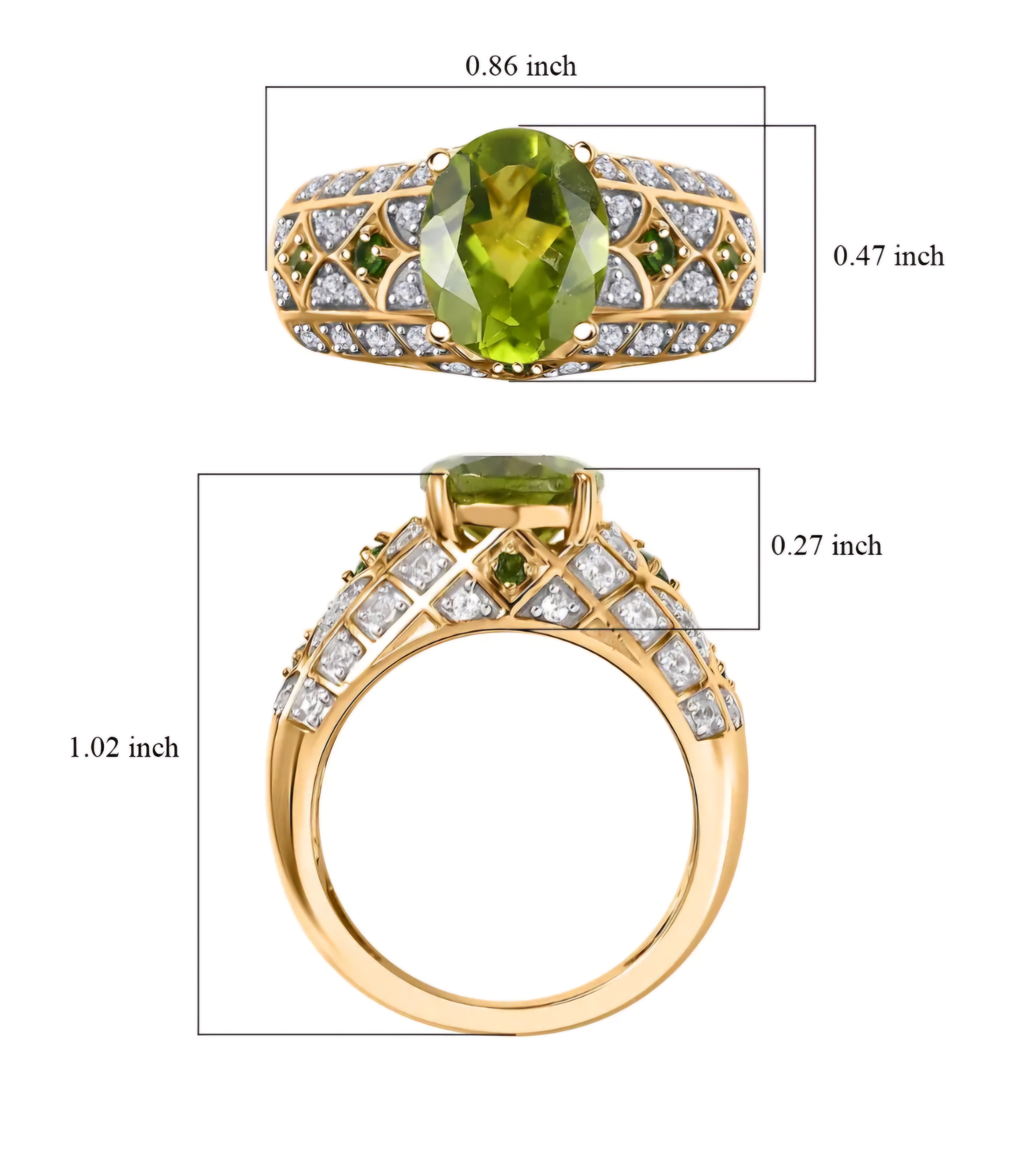 Elevate your jewelry collection with our exquisite Peridot, Chrome Diopside & Zircon Ring In 18K Yellow Gold over Sterling Silver 3.30ctw. This stunning piece features vibrant peridot, deep green chrome diopside, and sparkling zircon stones set in luxurious yellow gold over sterling silver. With a total carat weight of 3.30ctw, this ring exudes elegance and sophistication. Perfect for any occasion, this ring is sure to make a statement wherever you go.