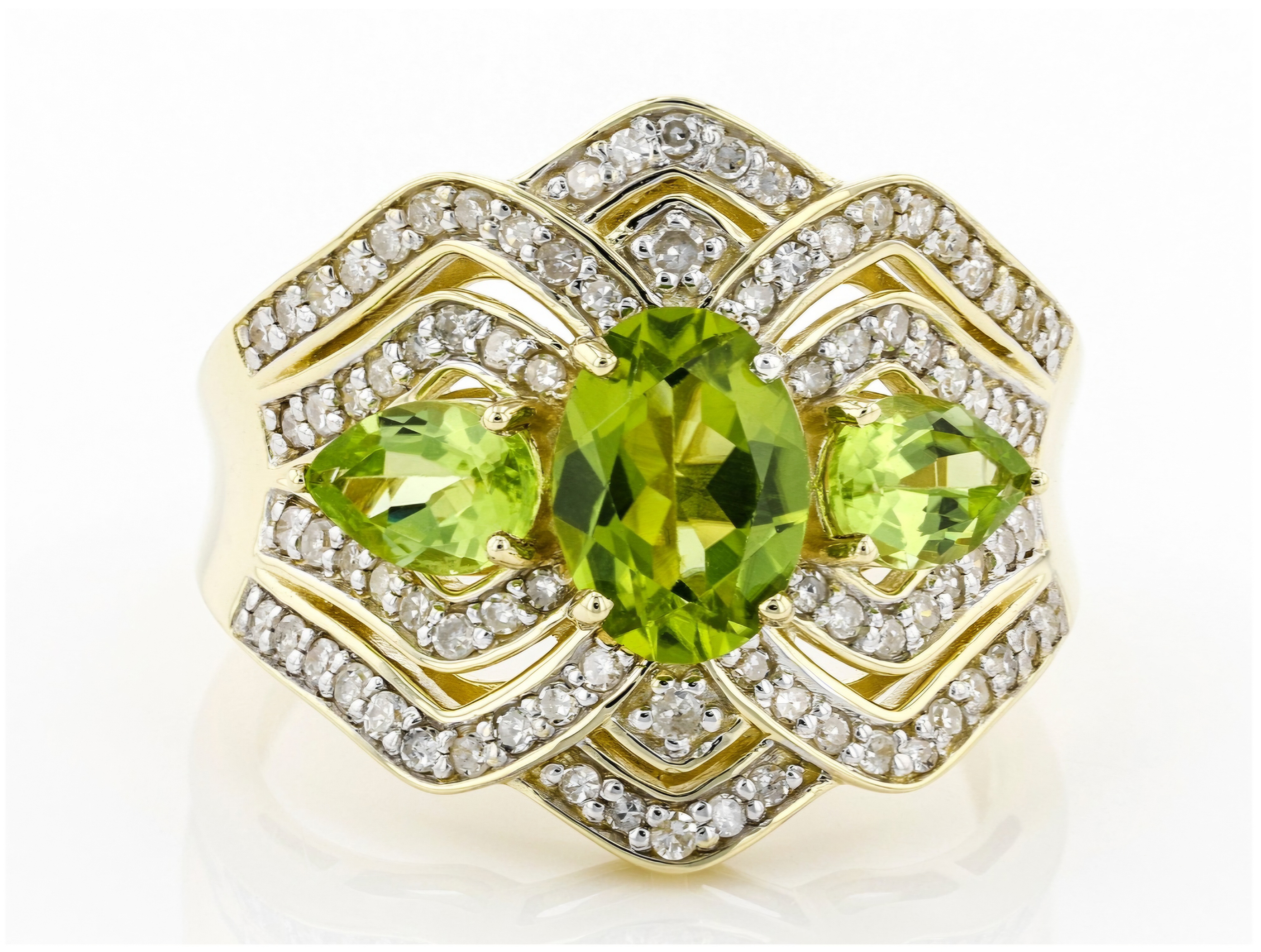 Elevate your jewelry collection with our exquisite Peridot & Diamond Wideband Three Stone Ring In 14K Yellow Gold 2.30ctw. Crafted with precision and attention to detail, this stunning ring effortlessly combines the vibrant beauty of peridot with the timeless elegance of diamonds. The wideband design adds a modern touch to this classic piece, making it the perfect accessory for any occasion. Treat yourself or a loved one to this luxurious ring and make a statement wherever you go.