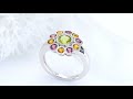 Hosted at the center of this ring you have a beautiful 6mm round natural Peridot. Surrounding that in a halo design you have 5mm round natural Rhodolite Garnet and Citrine 2.00ctw. Crafted in solid 925 Sterling Silver with your choice in Rhodium over, 18K Yellow Gold over or 18K Rose Gold Over 3.7g.
