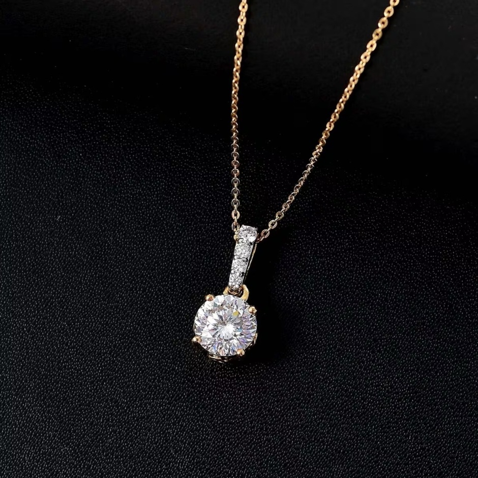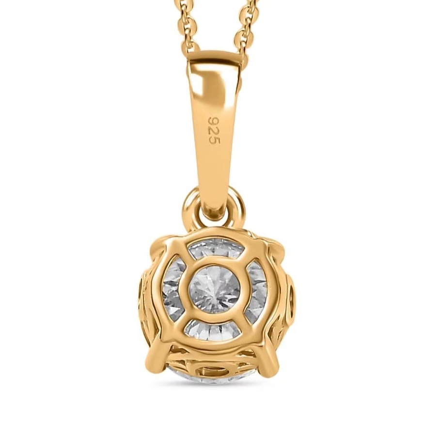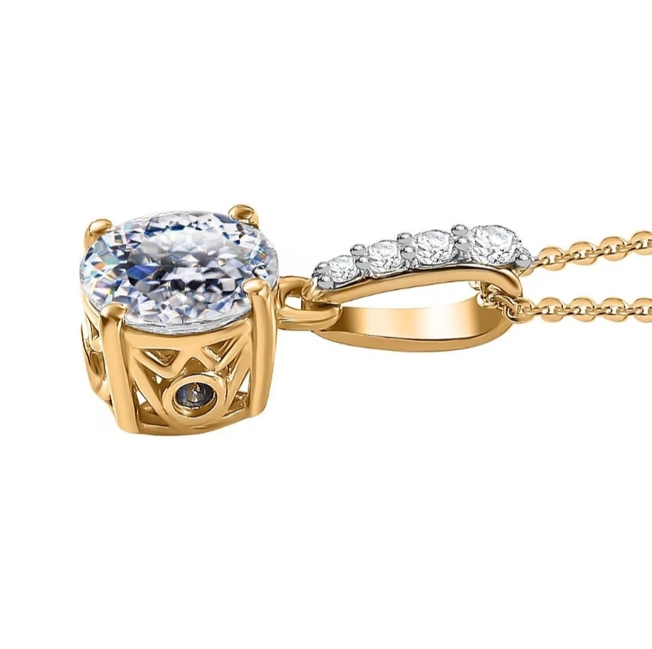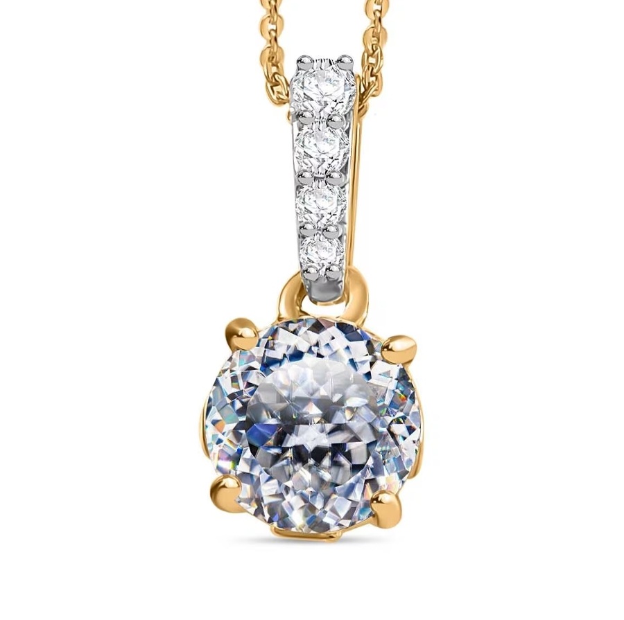 This pendant blends high brilliance with golden warmth. At its heart, a 120-facet Strontium Titanate ignites with exceptional fire — pure, colorless light scattering in every direction. The bale and accent stones shimmer with lab-grown moissanites, each set in white rhodium-tipped prongs that sharpen their sparkle against the rich 18K yellow gold tone.