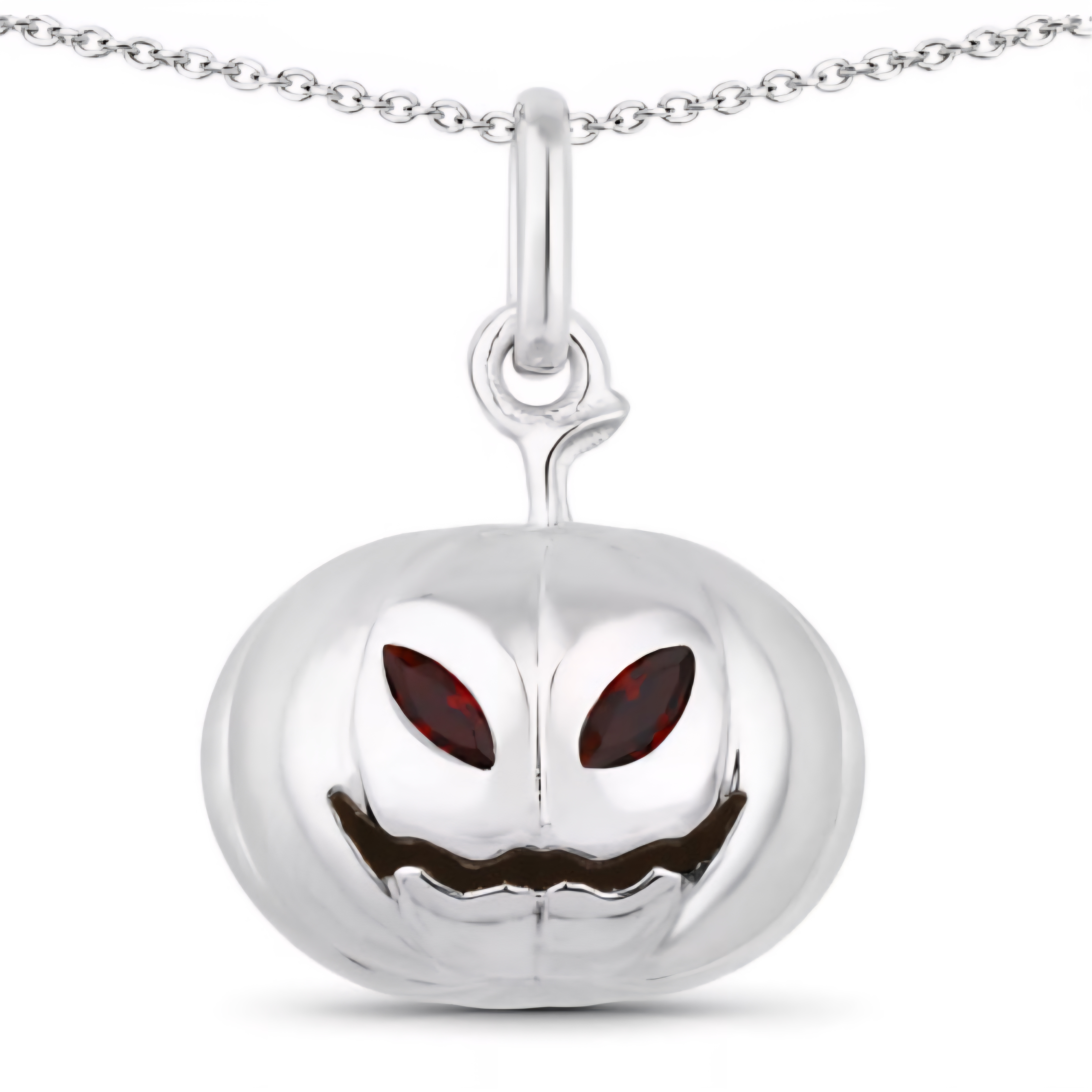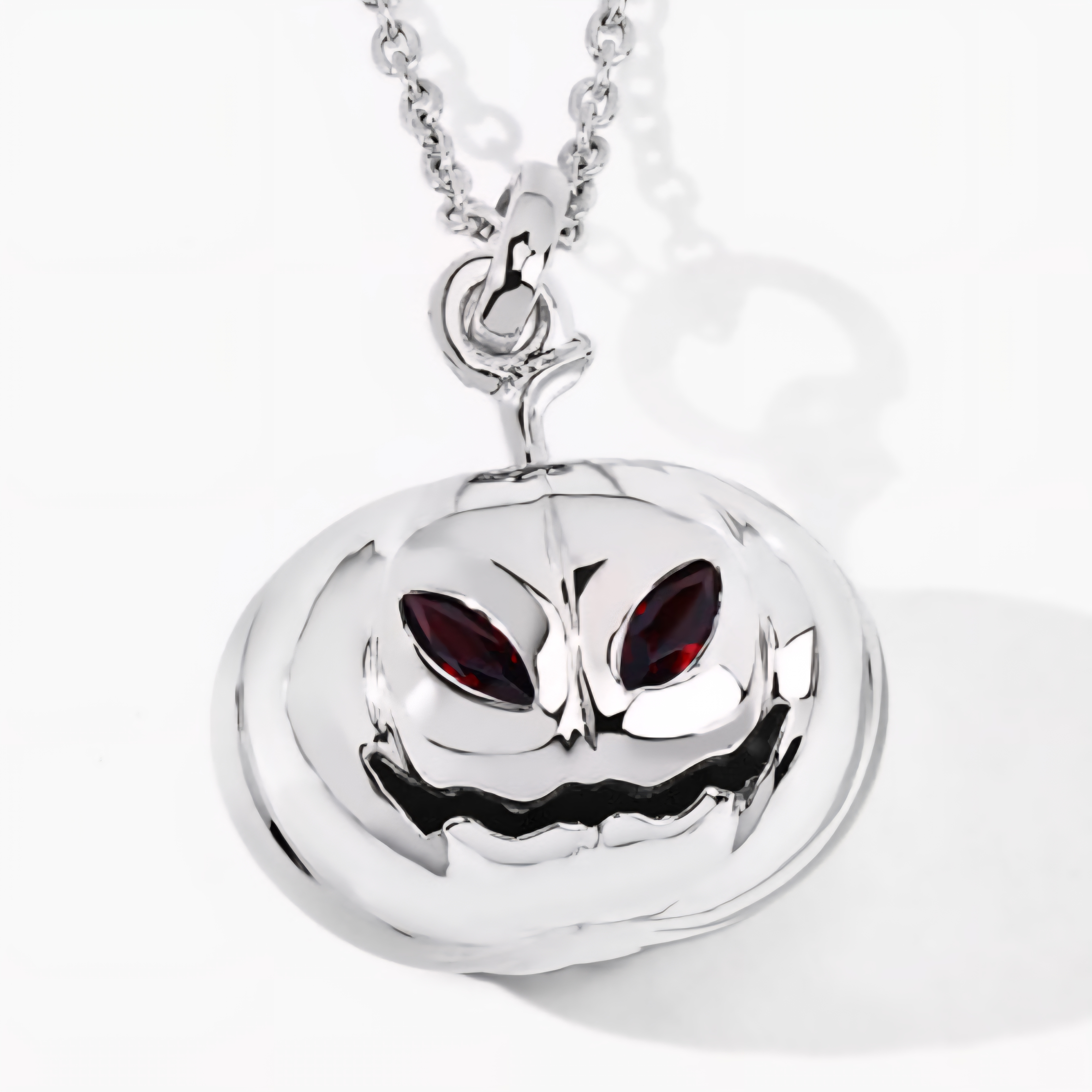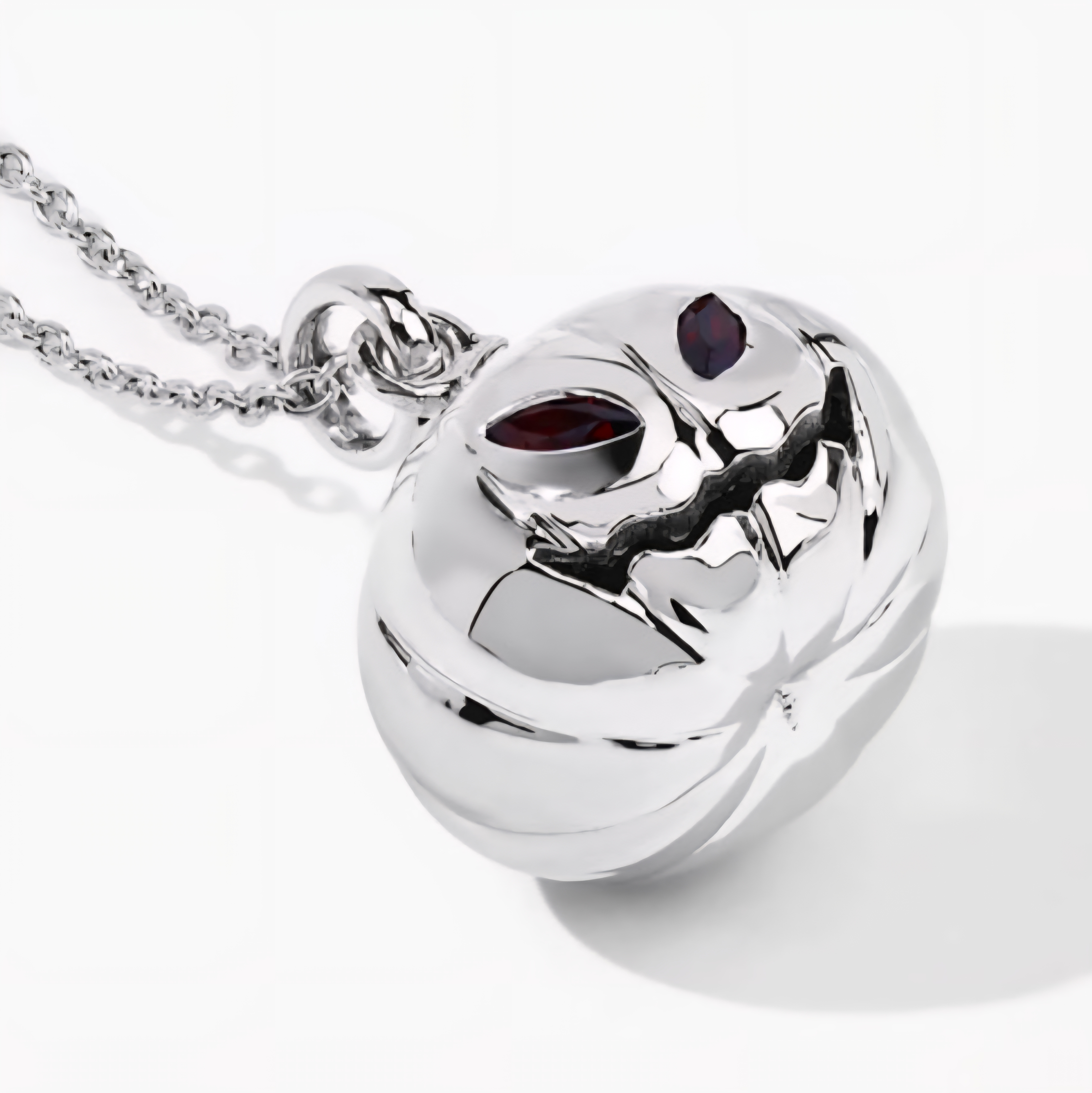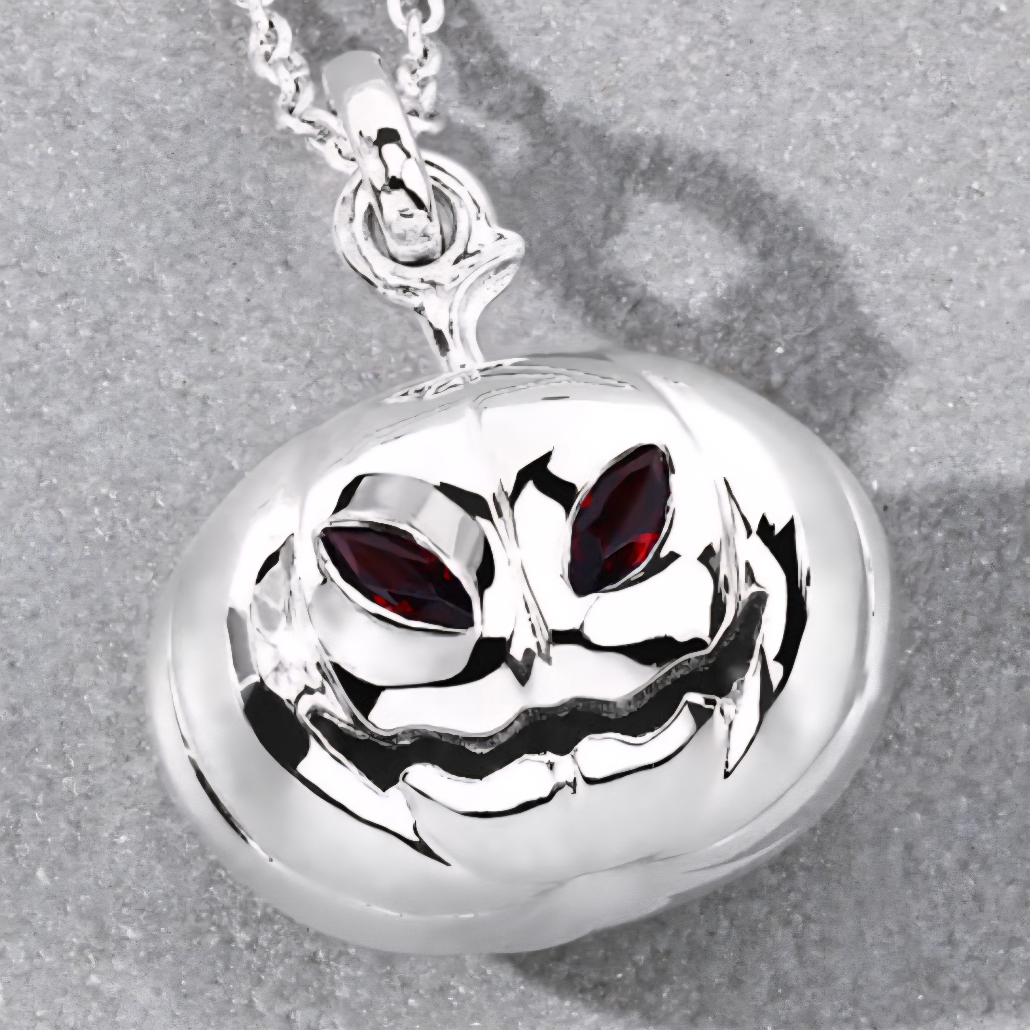 Halloween elegance — but make it luxury. This 3D Pumpkin Garnet Pendant blends spooky charm with high polish. Crafted in solid sterling silver and finished in bright rhodium, it features deep-red marquise garnet eyes that glint like embers. The sculpted jack-o’-lantern form is fully dimensional — not flat, not basic — a miniature work of wearable art. Cute, eerie, and built to last, it’s the perfect mix of playful mischief and fine craftsmanship. Whether you’re channeling autumn vibes or year-round gothic energy, this pumpkin shines with style that never dies.