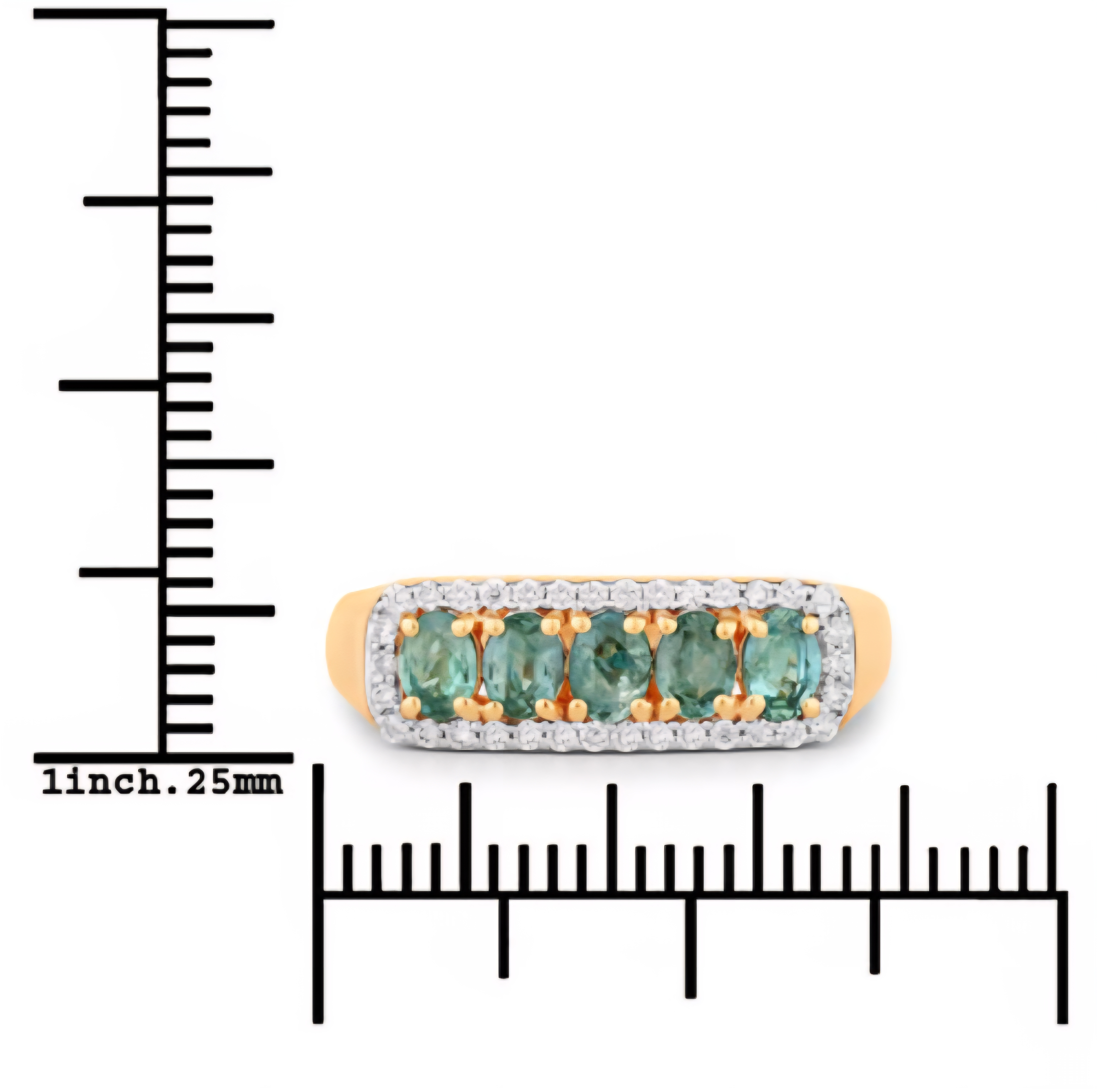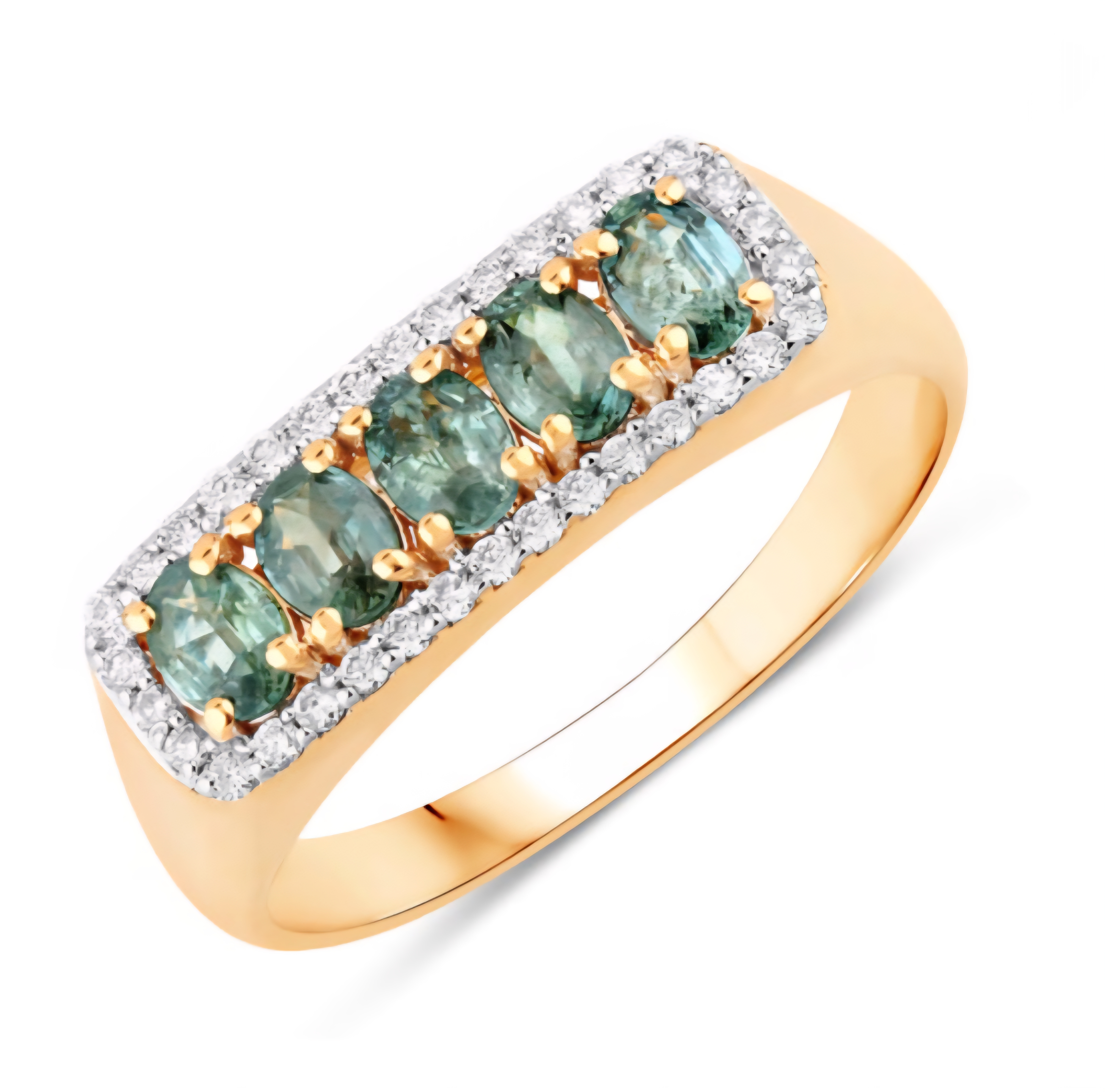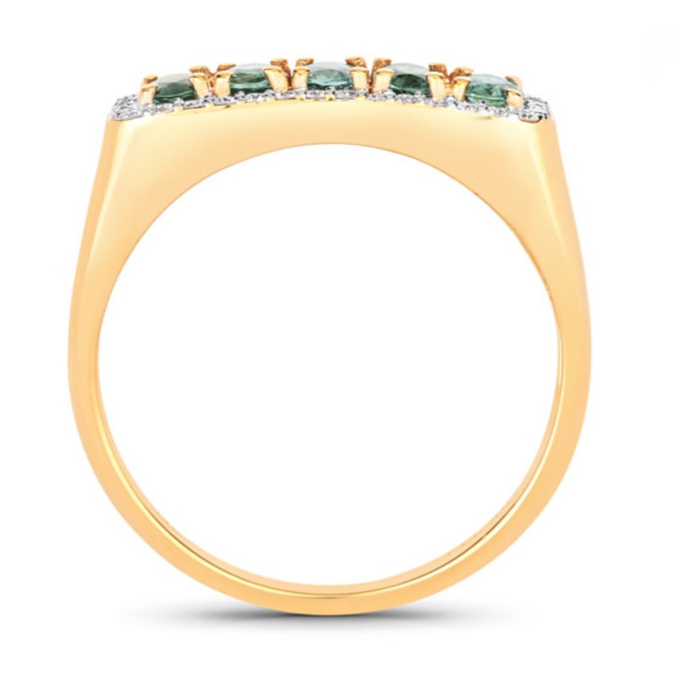 A sleek row of five oval, color-change Alexandrites (0.70ctw) glows from green to red under shifting light, all wrapped in a continuous halo of natural white diamonds (0.15ctw, G–H, SI1–SI2). The shared rectangular halo unifies the design for extra sparkle and a clean, modern silhouette. Crafted in solid 18K yellow gold with rhodium-plated details. Perfect as a luxe statement band or stacker.