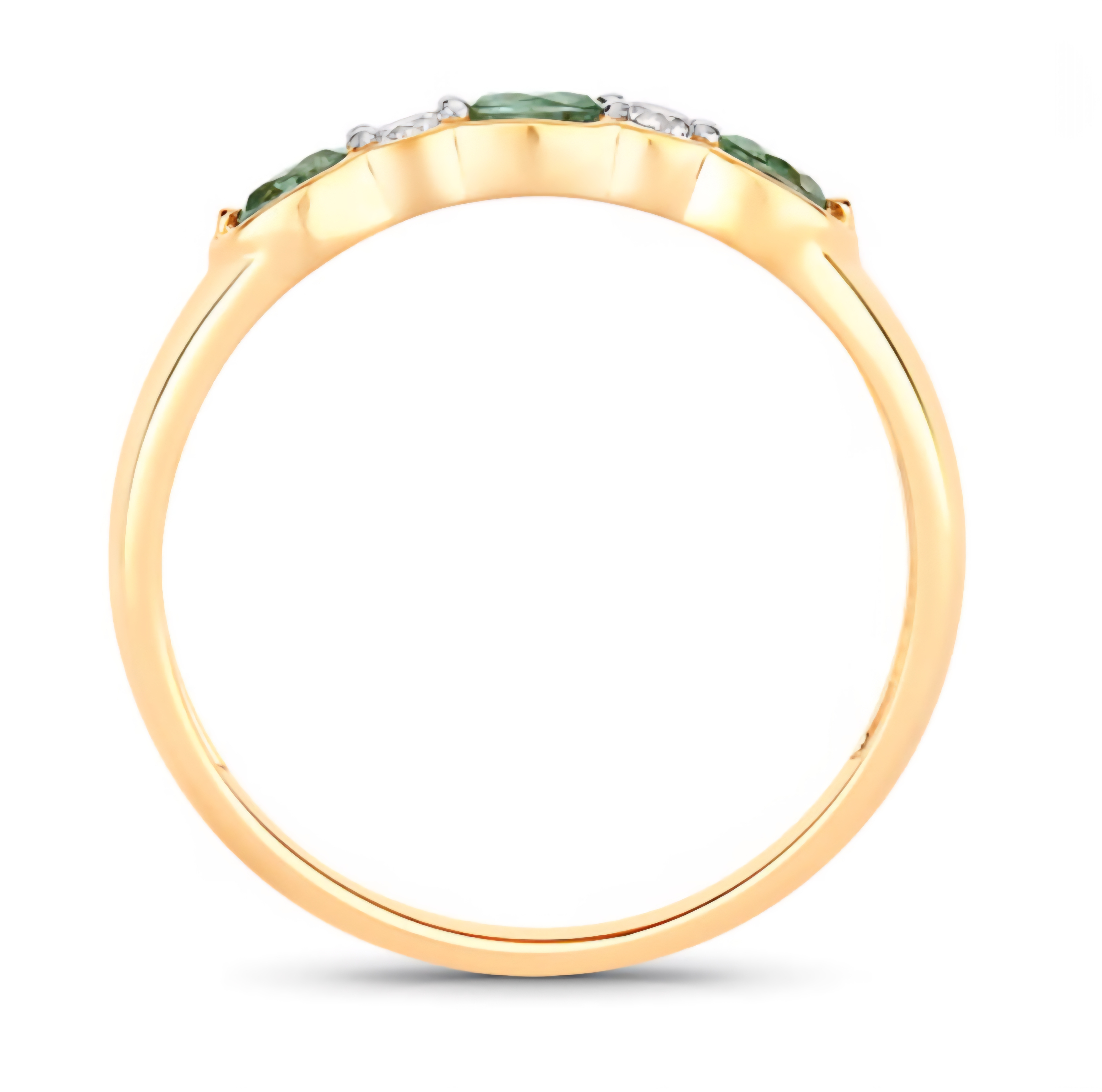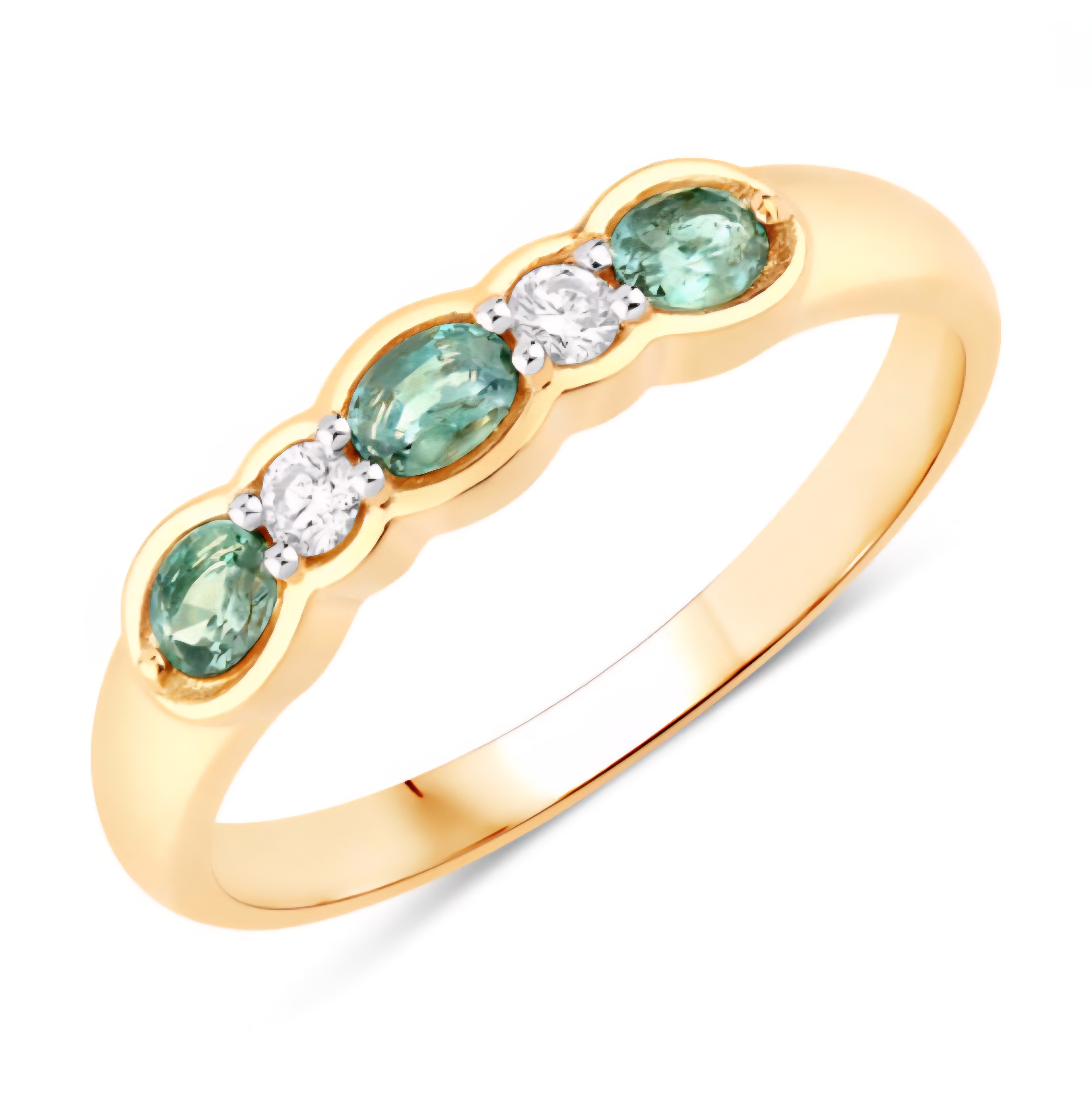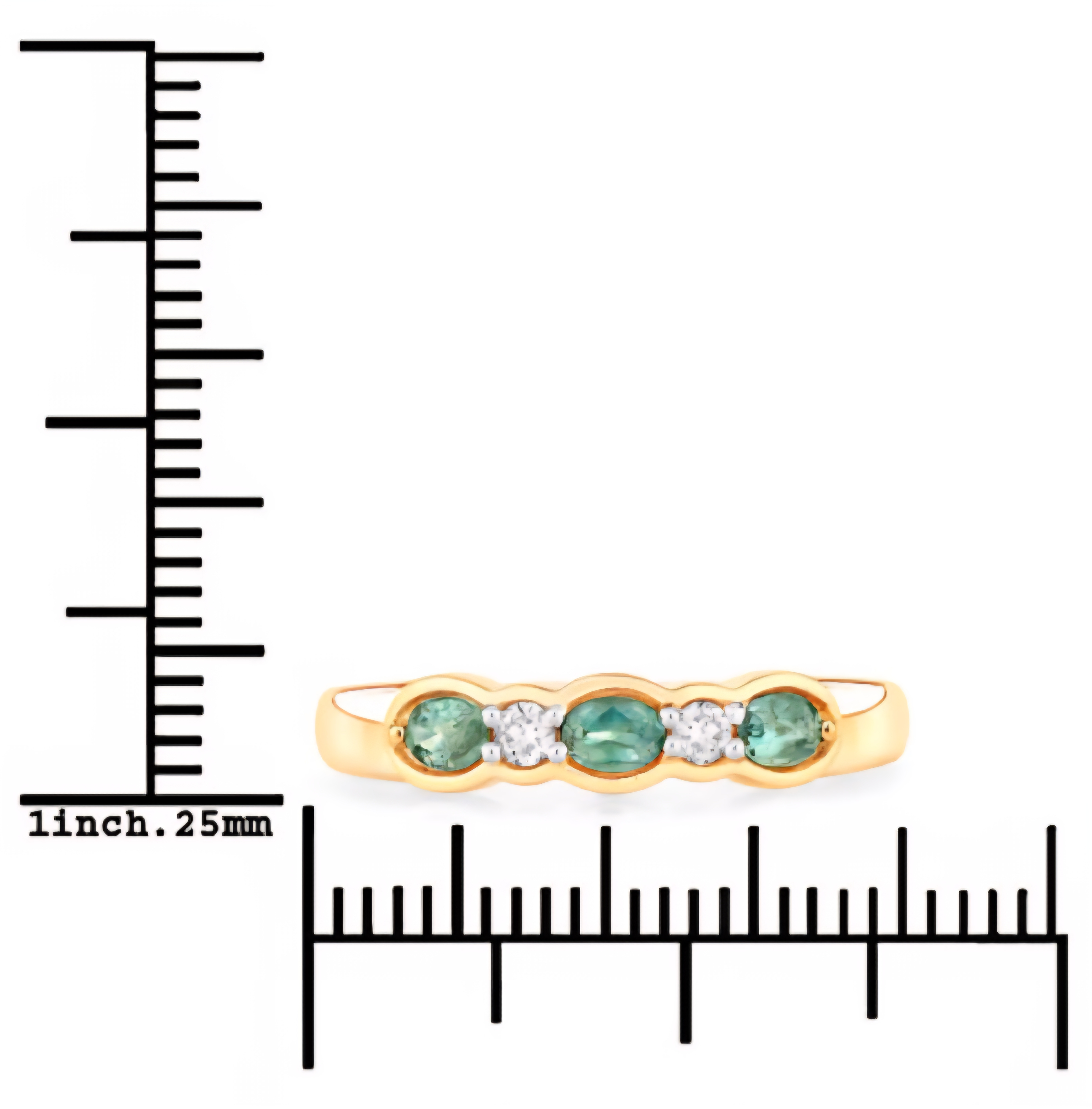This five-stone Alexandrite and diamond ring is refined, radiant, and unforgettable. Three oval-cut Alexandrites (0.39ctw) shift from teal-green to deep red under changing light — a mesmerizing color-change phenomenon that defines this rare gemstone. Framed between two round brilliant diamonds (0.06ctw, G–H, SI1–SI2), the design celebrates perfect balance and timeless beauty. Set in solid 18K yellow gold with a smooth rhodium finish, it’s a versatile piece that transitions seamlessly from everyday elegance to evening brilliance.