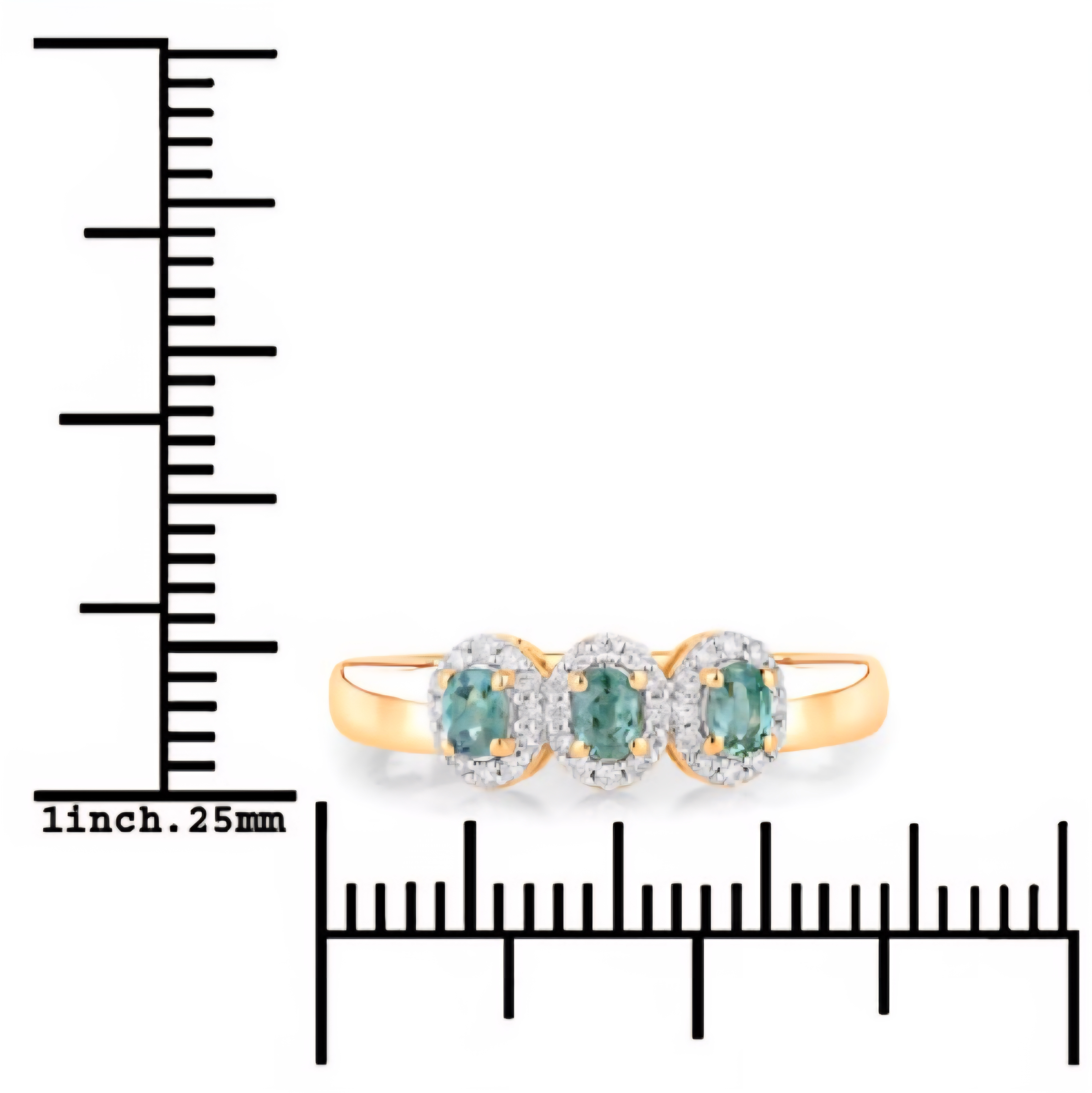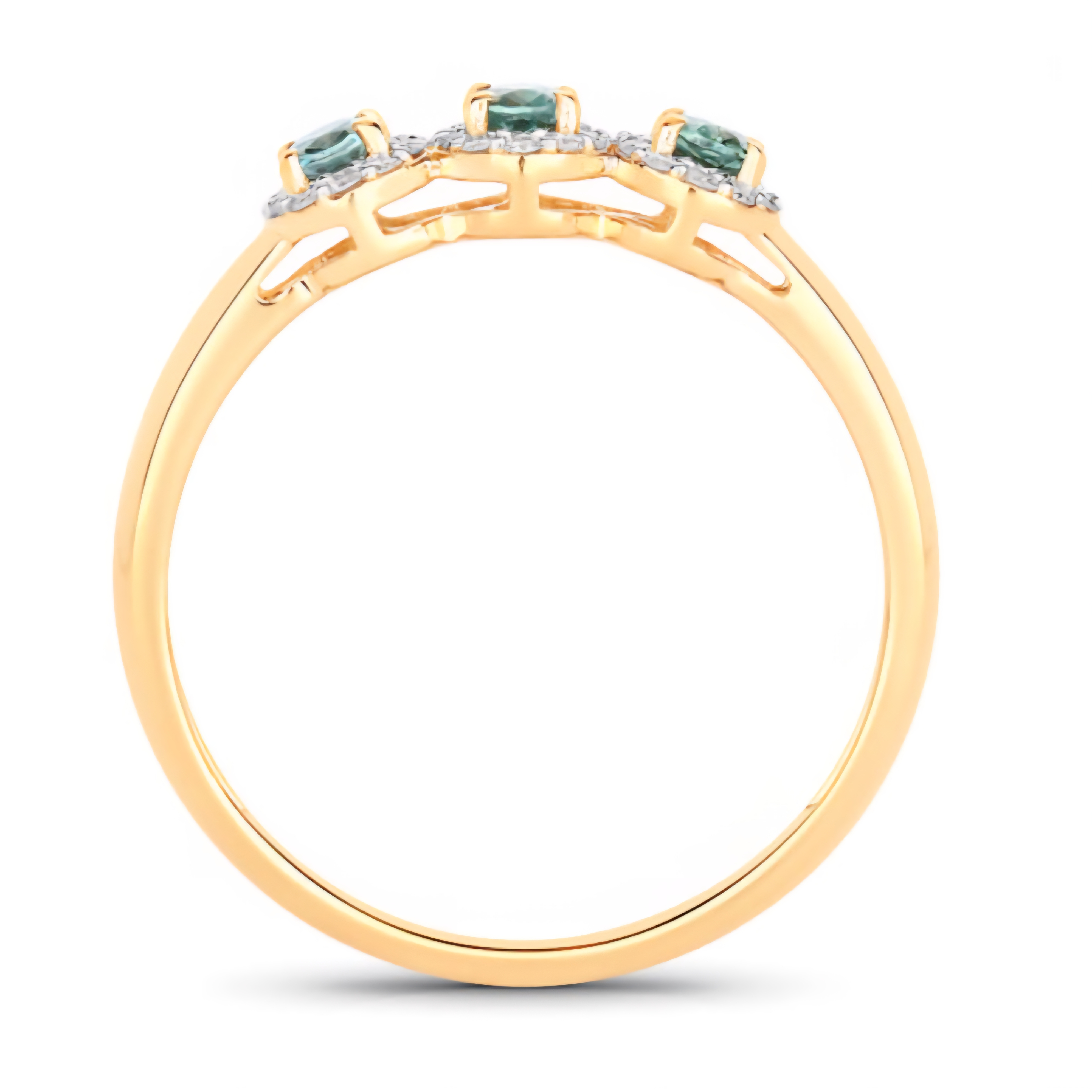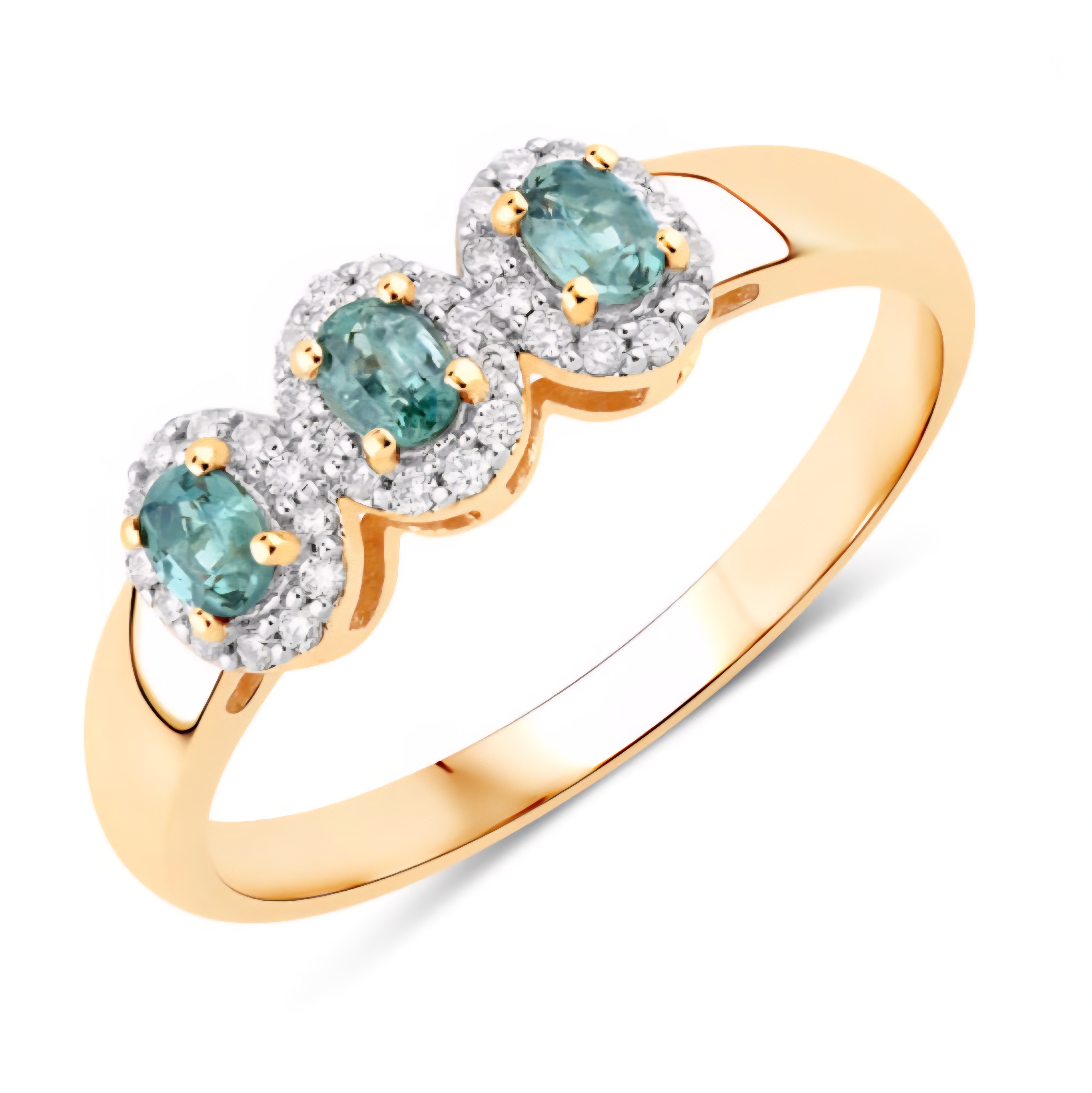 Three oval color-change Alexandrites (0.33ctw) sit in perfect balance, each surrounded by a halo of round brilliant diamonds (0.13ctw, G–H, SI1–SI2) that amplifies their shifting hues of green and red. This trilogy-style ring represents past, present, and future — elevated by a luminous halo design that adds dimension and fire. Set in solid 18K yellow gold with a rhodium-plated finish, it’s a sleek, timeless design that captures Alexandrite’s magic in motion.