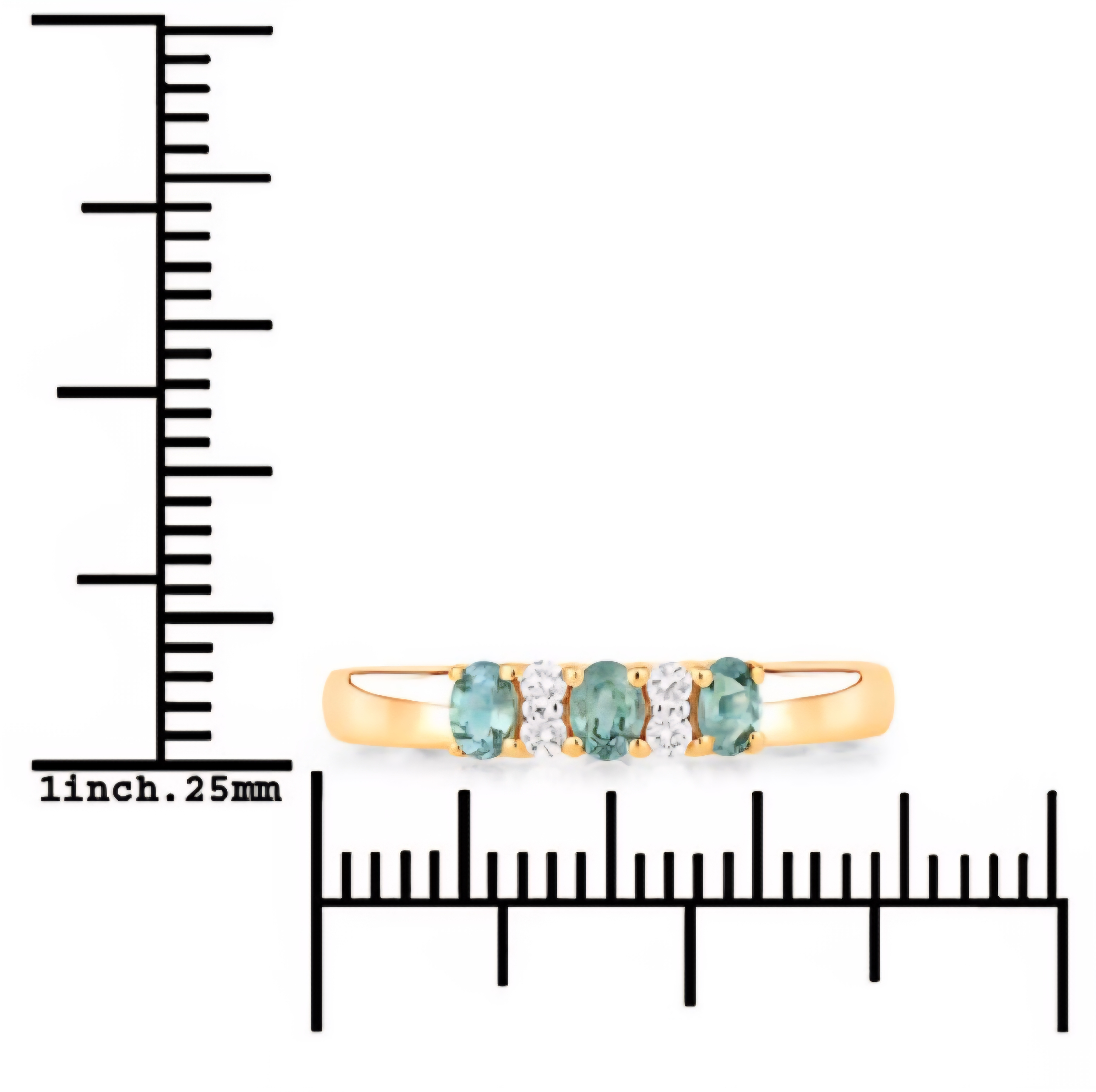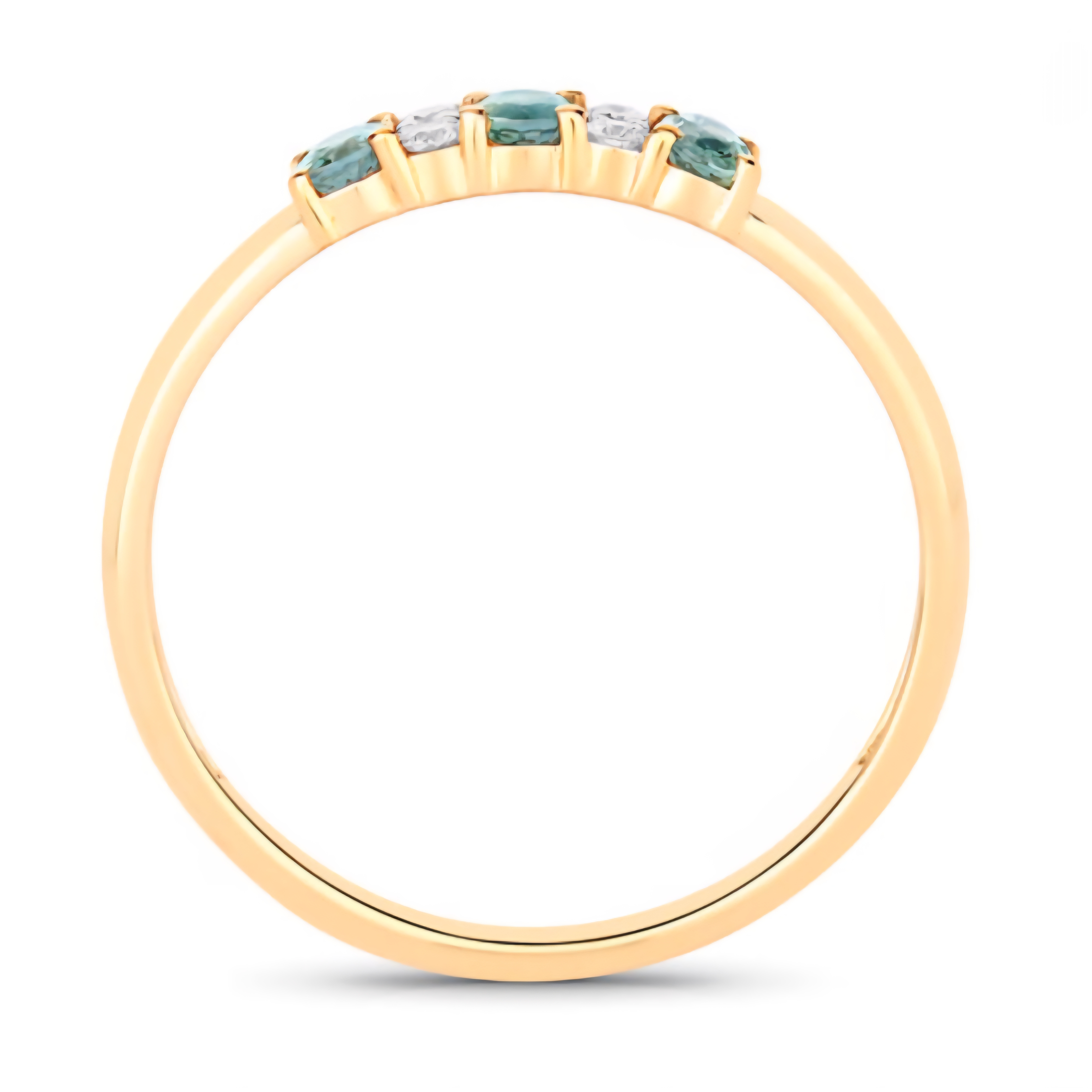 A refined three-stone Alexandrite ring that plays with light and balance. Three oval-cut color-change Alexandrites (0.33ctw) shift from green to red depending on the lighting, framed by four round brilliant diamonds (0.06ctw, G–H, SI1–SI2) set in pairs between each gem. This layout creates a modern trilogy silhouette — radiant, dimensional, and perfectly proportioned. Crafted in solid 18K yellow gold with a rhodium-plated finish, this ring embodies rare gemstone elegance with everyday versatility.
