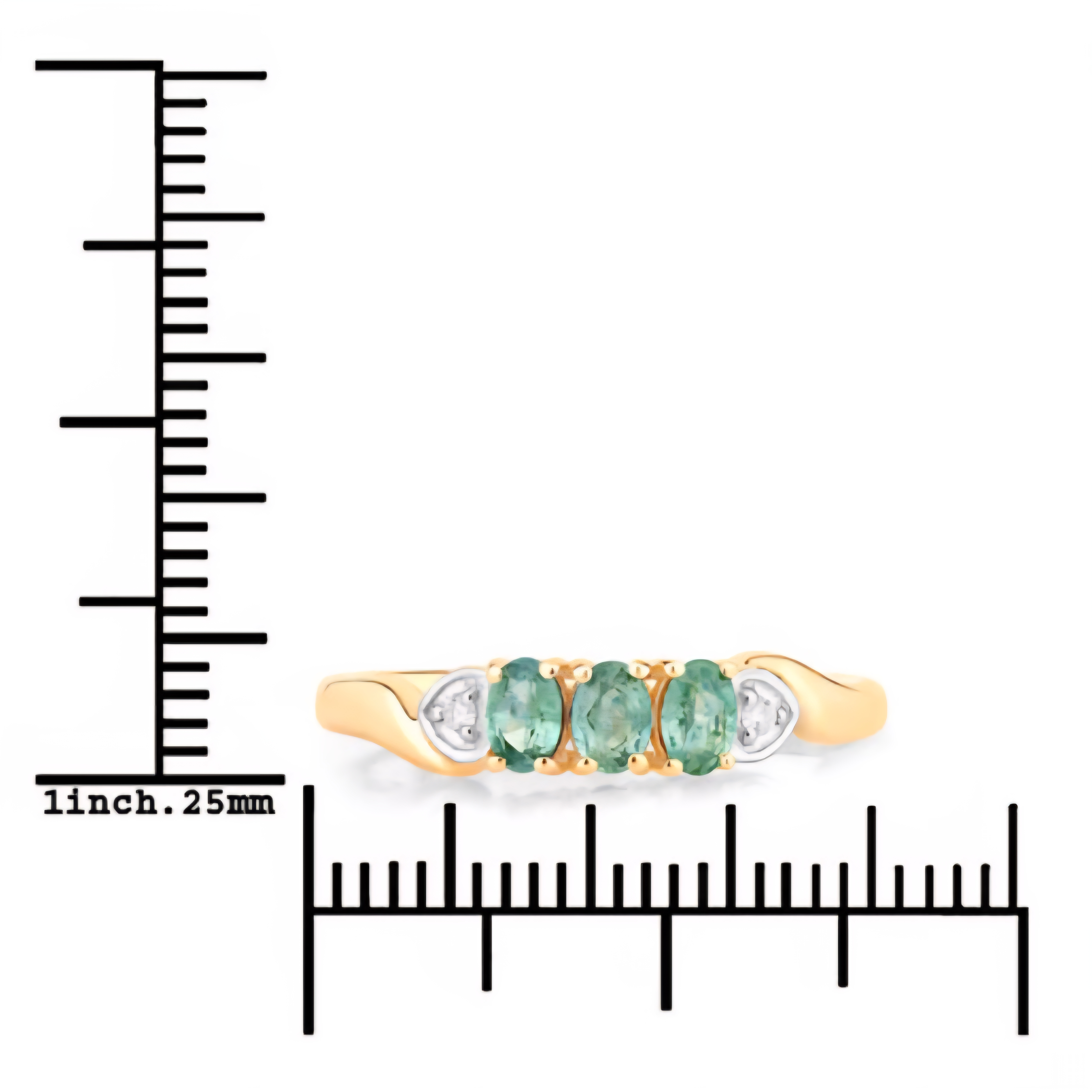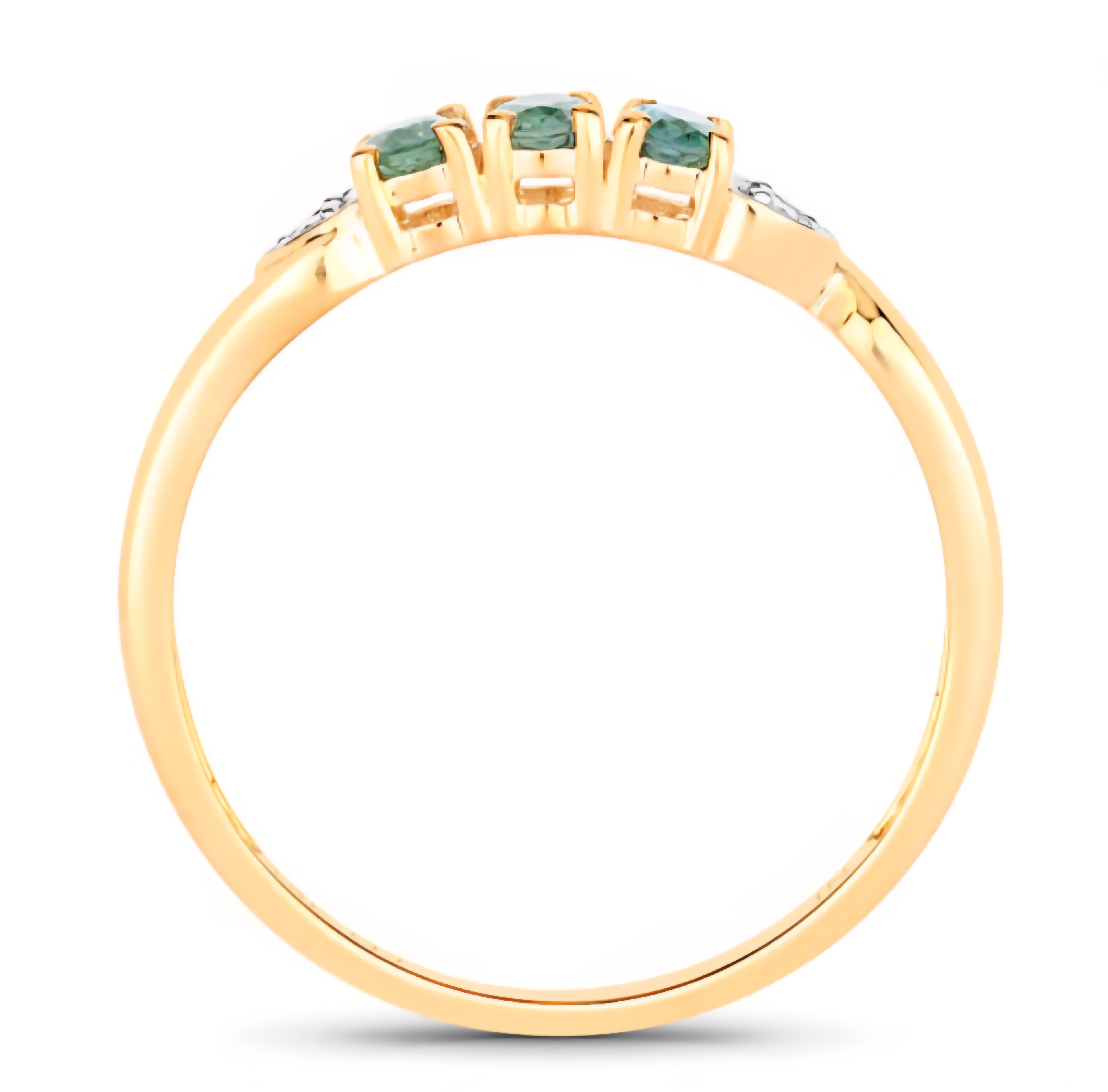 A classic three-stone Alexandrite trilogy ring with a delicate diamond accent twist. Three oval-cut Alexandrites (0.42ctw) display their signature color change from green to red, flanked by two round brilliant diamonds (0.02ctw, G–H, SI1–SI2) nestled in teardrop bezels for a soft, luminous finish. Set in solid 18K yellow gold with a rhodium-plated touch, this piece blends timeless design with Alexandrite’s ever-changing magic — elegant, meaningful, and unforgettable.