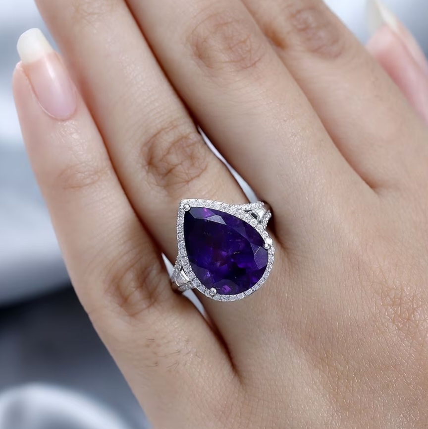 This elegant halo ring features a richly colored pear shaped amethyst as the focal point, framed by a bright halo of colorless moissanite for added sparkle and dimension. Tapered baguette moissanites accent the sides, giving the design a refined silhouette with a clean, structured look. Crafted in solid 925 sterling silver and finished in rhodium plating, this piece delivers a bold gemstone presence with a crisp white metal finish that enhances the amethyst’s deep purple color.