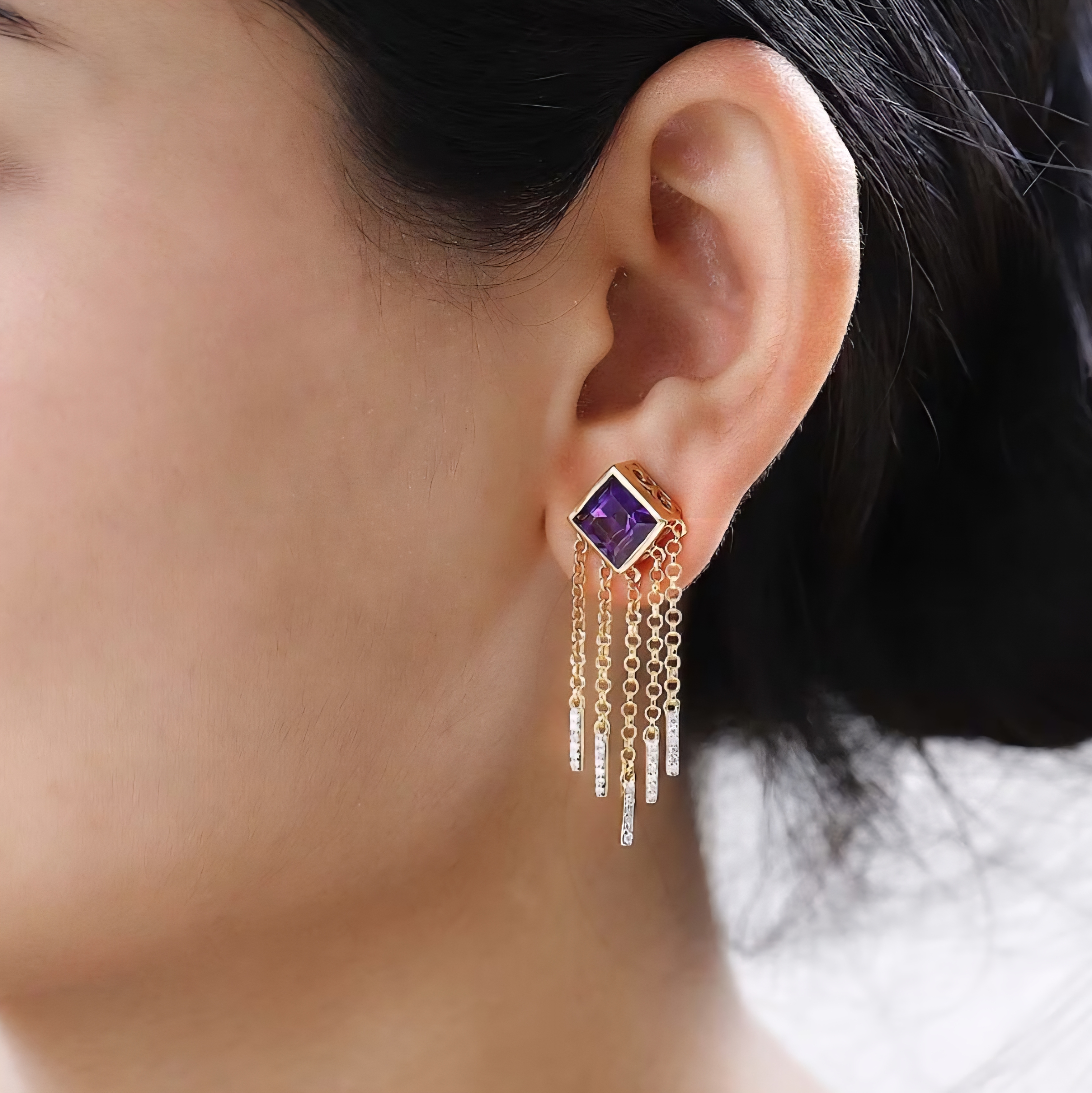 These tassel earrings feature square cut amethysts in a sleek geometric setting, paired with delicate chain drops that create movement and a refined statement look. Colorless moissanite accents add bright sparkle at the ends of the tassels, balancing the deep purple of the amethyst with crisp white brilliance. Crafted in solid 925 sterling silver and finished in 18K yellow gold plating, this design combines modern structure with elegant drape for a bold but wearable pair of earrings.