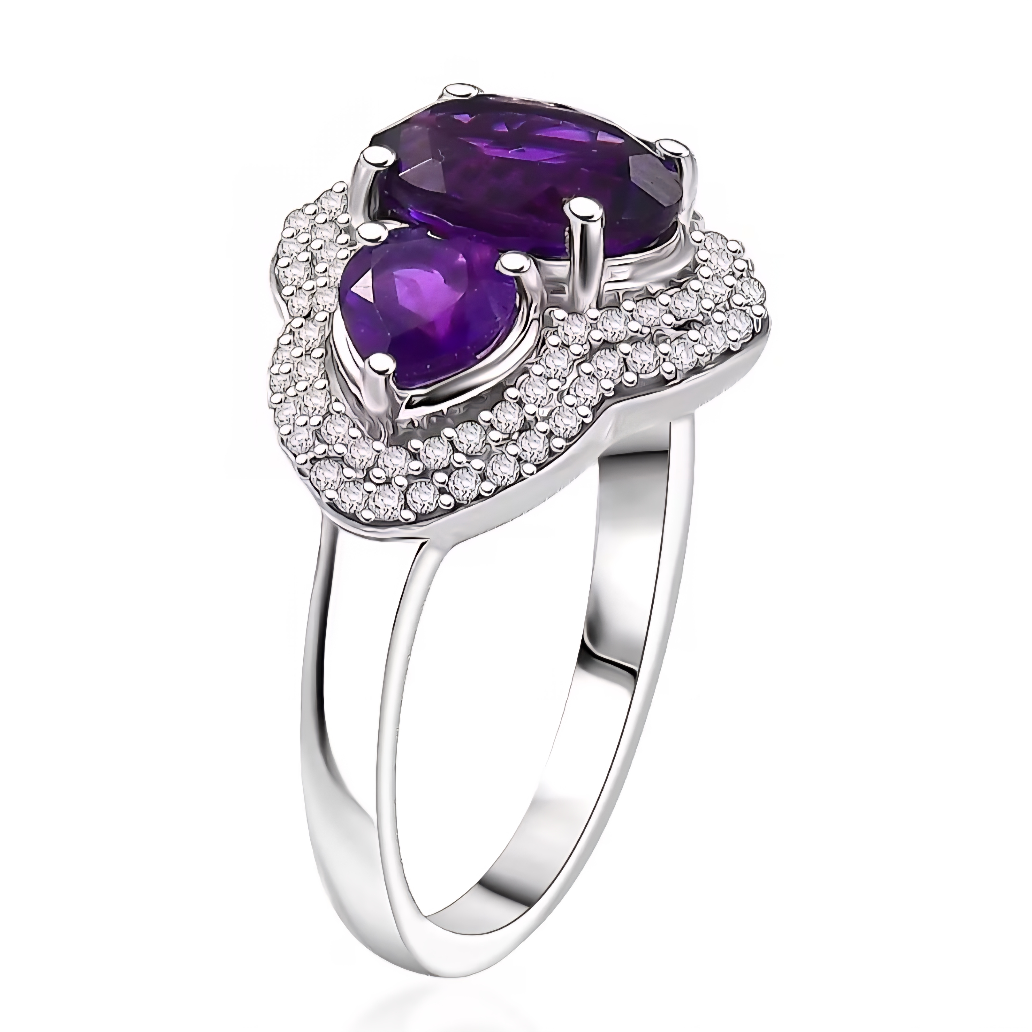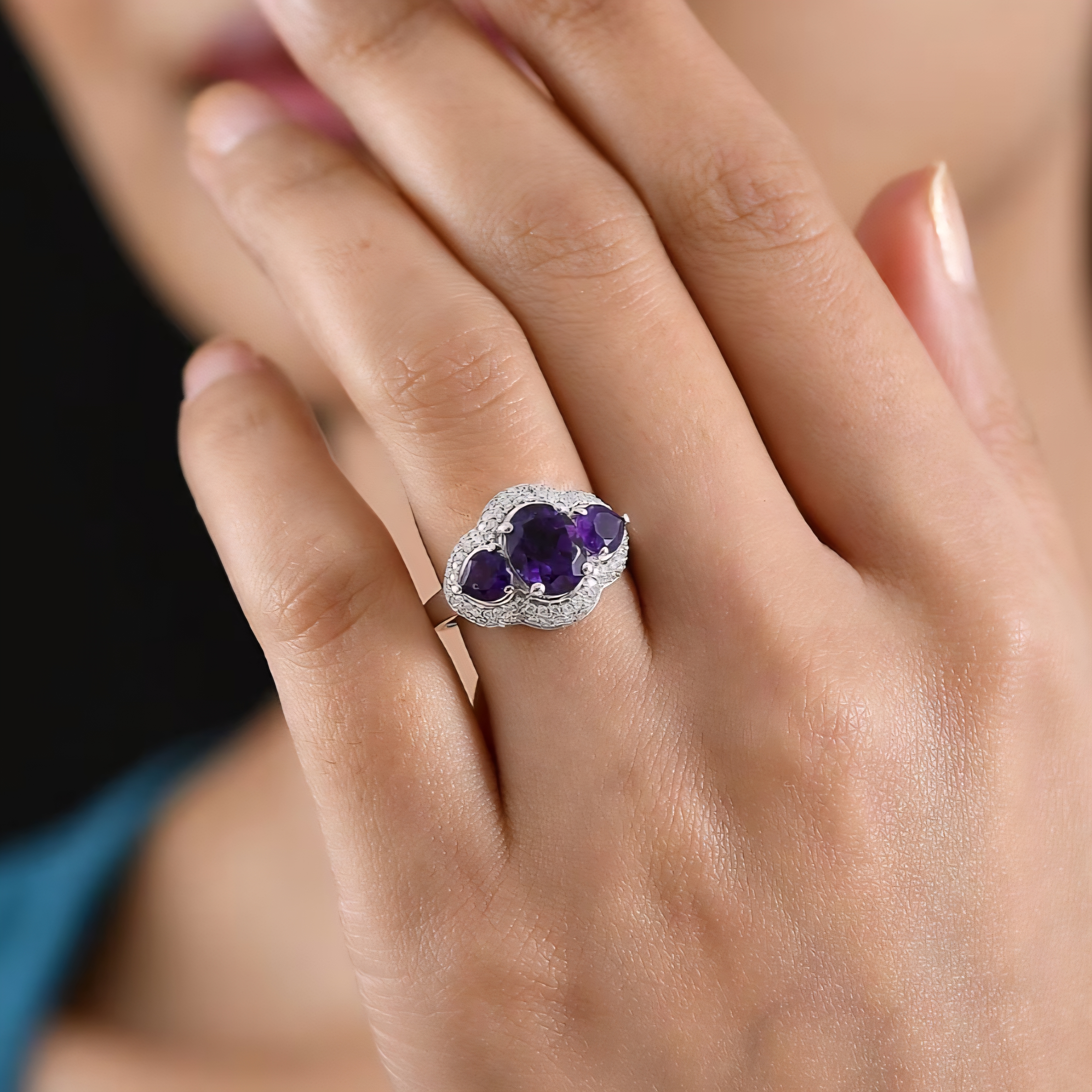 Finished in rhodium over solid sterling silver, everything stays bright, crisp, and icy. The purple looks richer, the moissanite looks whiter, and the whole ring has that expensive “lights out” presence.