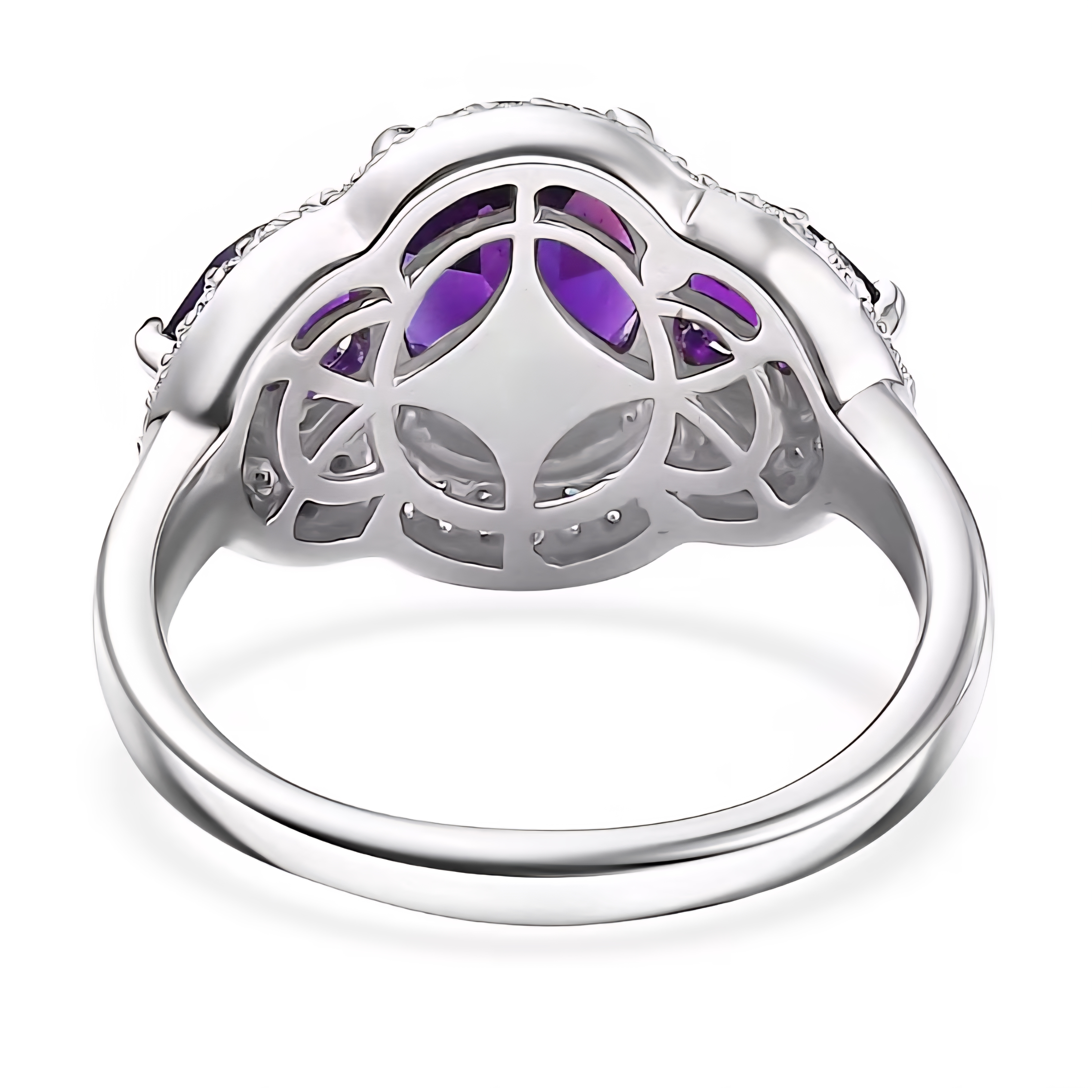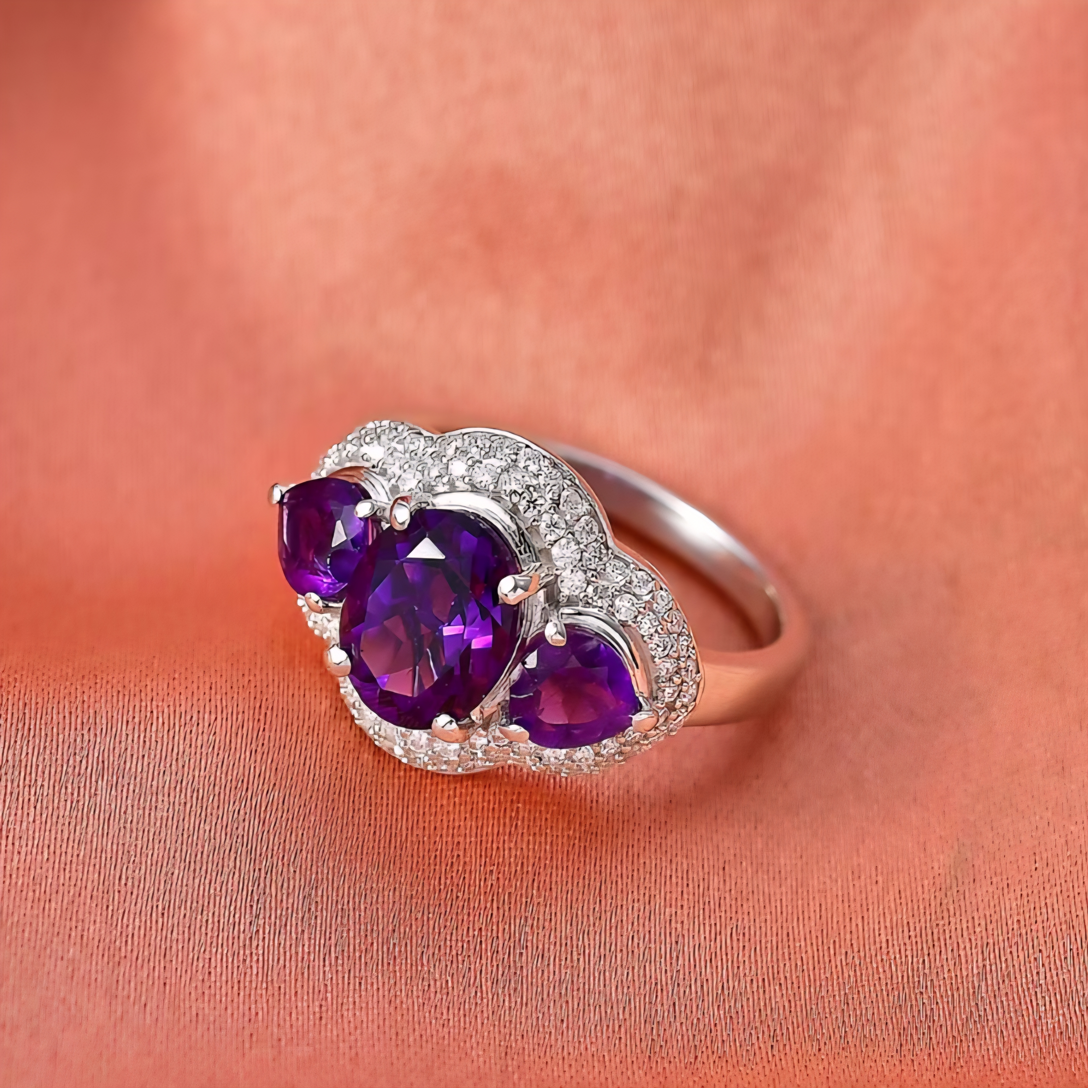 At the center is a bold oval amethyst, framed by two heart shaped amethysts on each side. That three stone layout gives the ring real dimension and a romantic silhouette, but it still hits like a statement piece because the color is saturated and the stones are oversized.