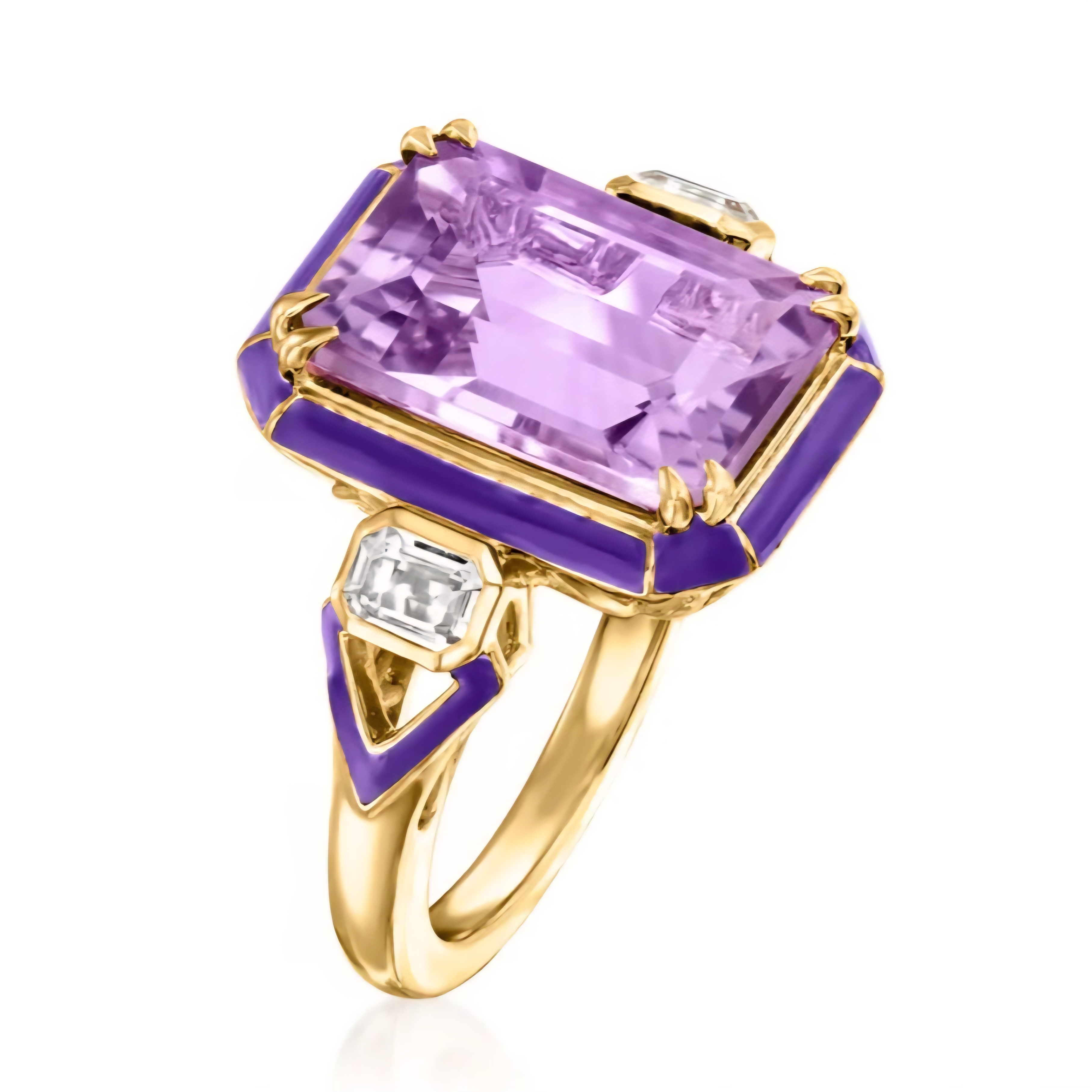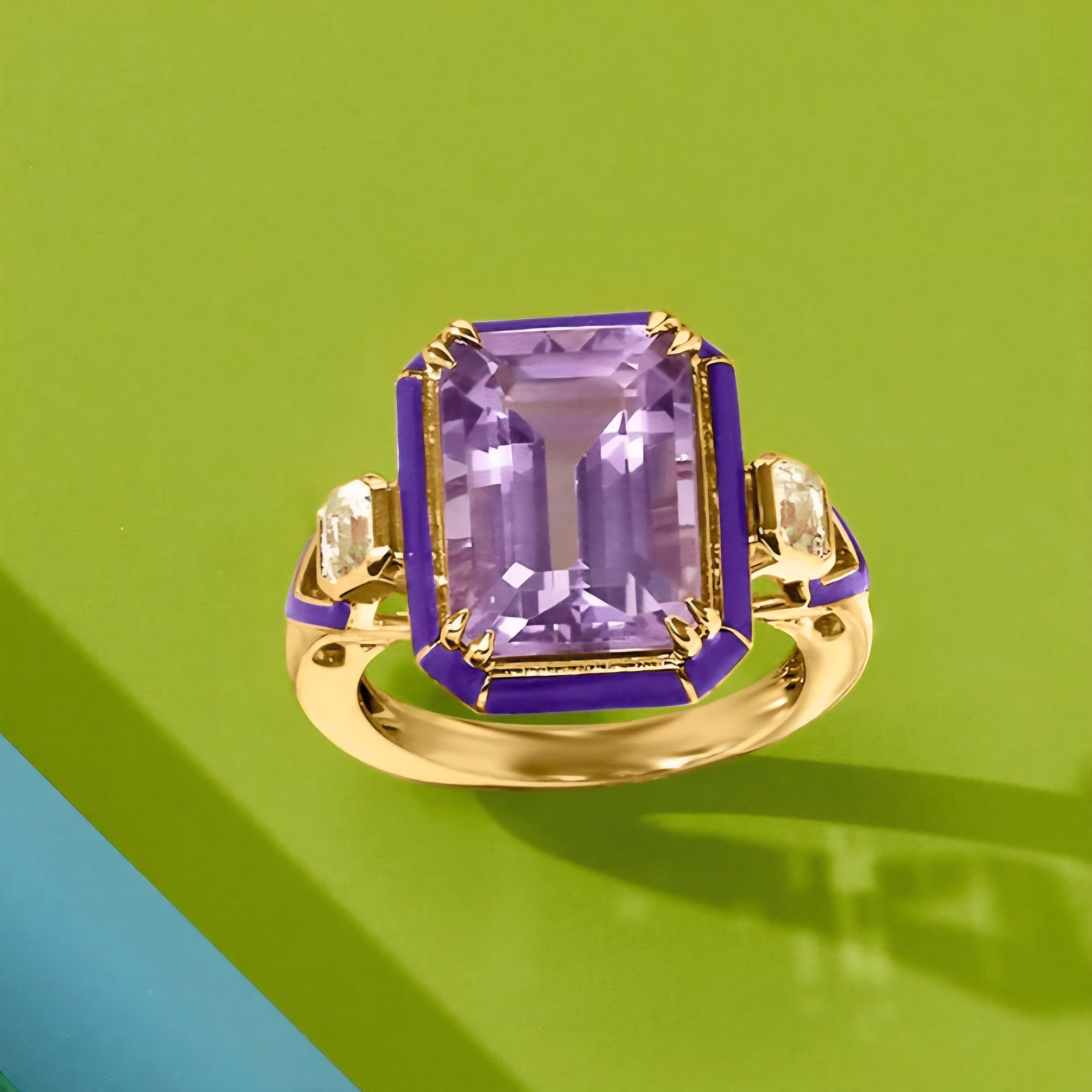 Vivid purple enamel frames the amethyst, creating striking contrast against the 18K yellow gold plating. The enamel detail sharpens the edges of the setting and intensifies the overall color story, giving the ring a confident, contemporary character. Crafted in solid 925 sterling silver with 18K yellow gold plating, this piece offers substantial finger coverage and a bold finish.